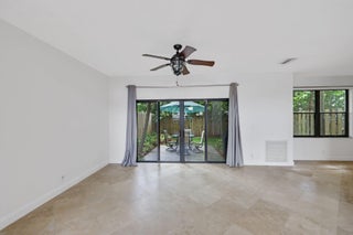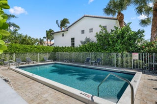 Experience the remarkable location of this updated townhome, offering 1,648 sf of living space. You are greeted indoors by travertine marble flooring and high ceilings that allow an abundance of natural light to flow through the numerous windows. The kitchen is equipped with granite countertops, wooden cabinets, and modern stainless steel appliances. The downstairs features a spacious bedroom, an updated full bath, ample closet space, and washer/dryer. The second floor is dedicated to the primary suite, including an ensuite bath with a soaking tub and a generous walk-in closet. Fenced-in private yard is complete with a deck and low-maintenance turf. The pool is located next to the unit and this boutique community is within walking distance of the beach, Mizner Park, shops and restaurants.