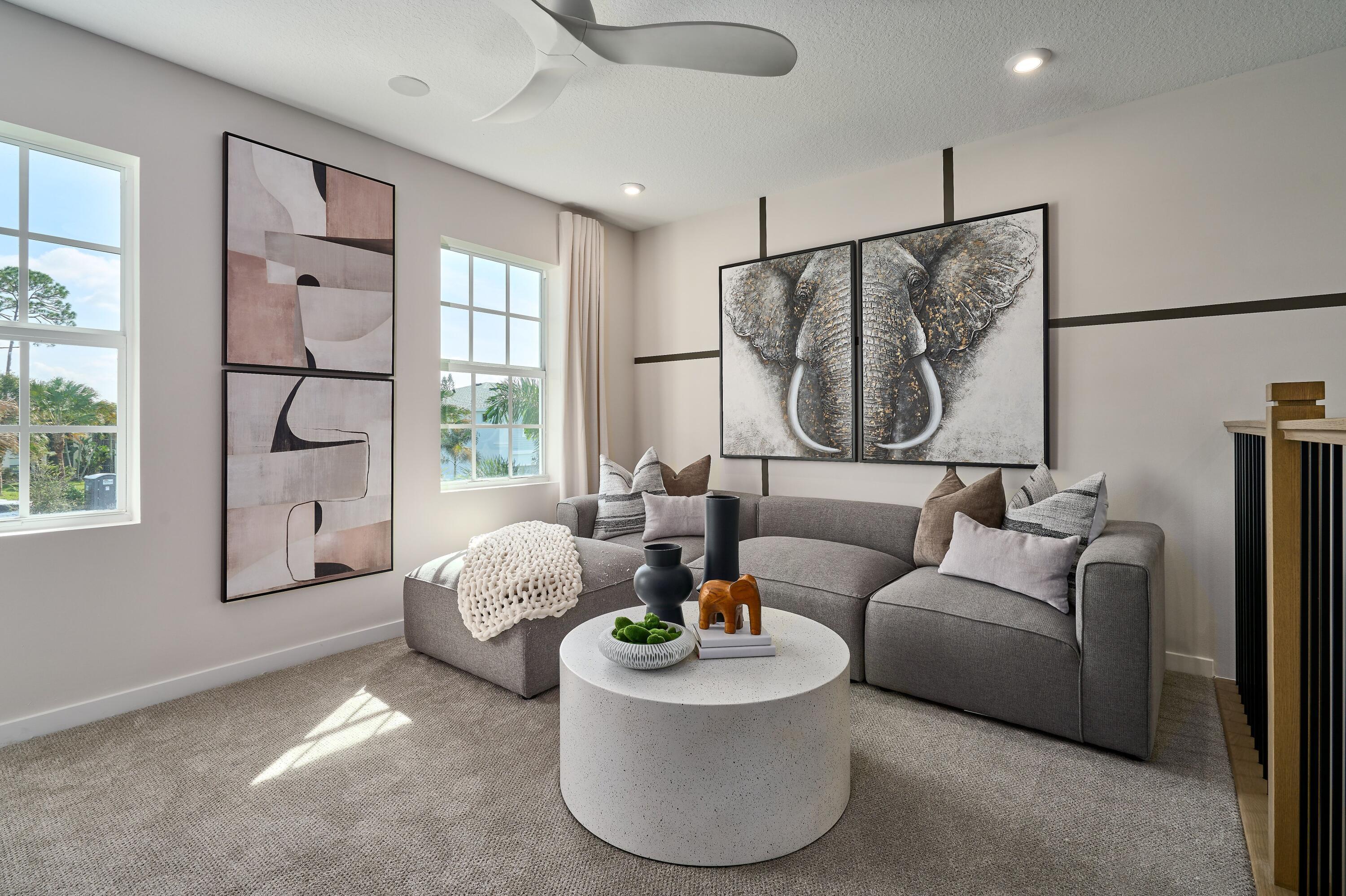 The Benton is a 2,846 sq. ft. 2-story home that offers 5 bedrooms, 3 baths and a 2-car garage. The first floor of this home features a welcoming foyer with a beautiful flex room that can be used as a game room, office or play room. The 5th bedroom located on the first floor can be used as a guest suite. The kitchen is open to the Great Room and dining room, and the covered lanai extends the living outdoors. The second floor features 3 secondary bedrooms that share a full bath with double sinks, along with the convenience of the laundry room. The owner's suite is a relaxing retreat with a private bath and a walk-in closet.
