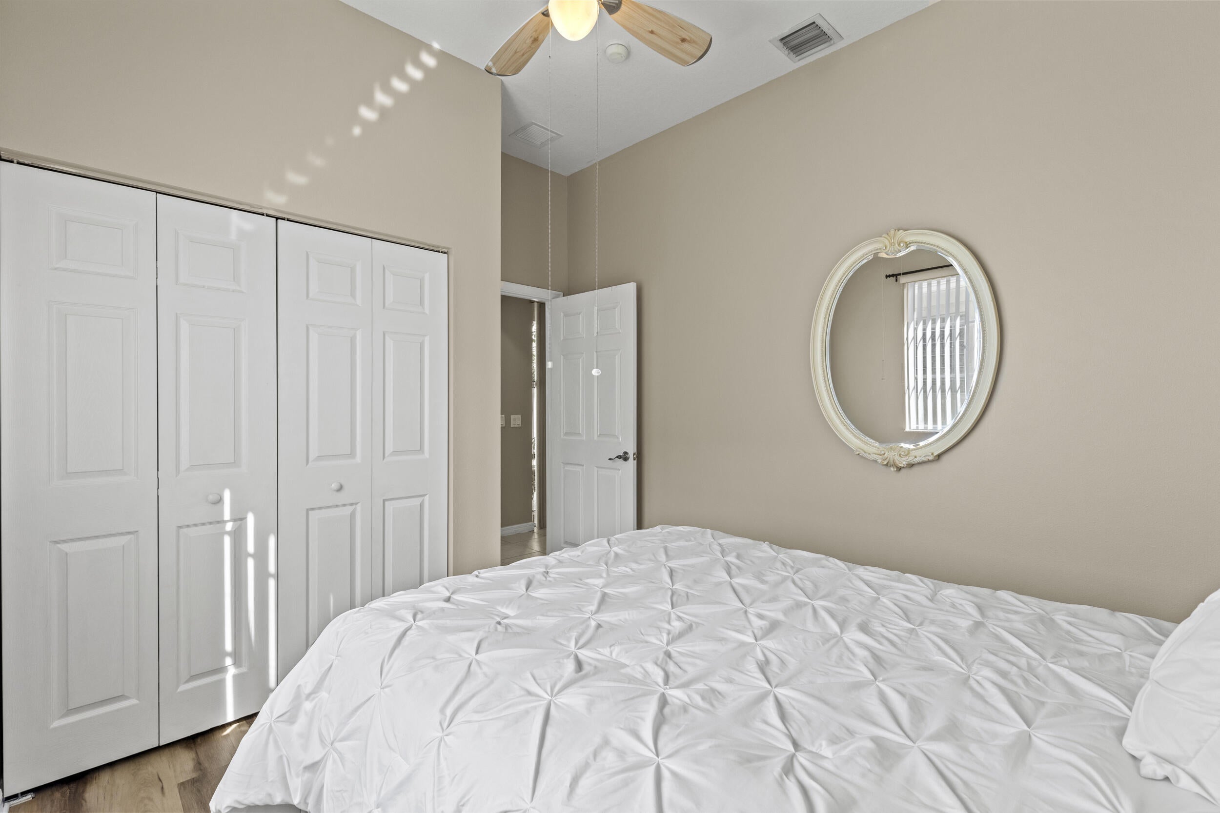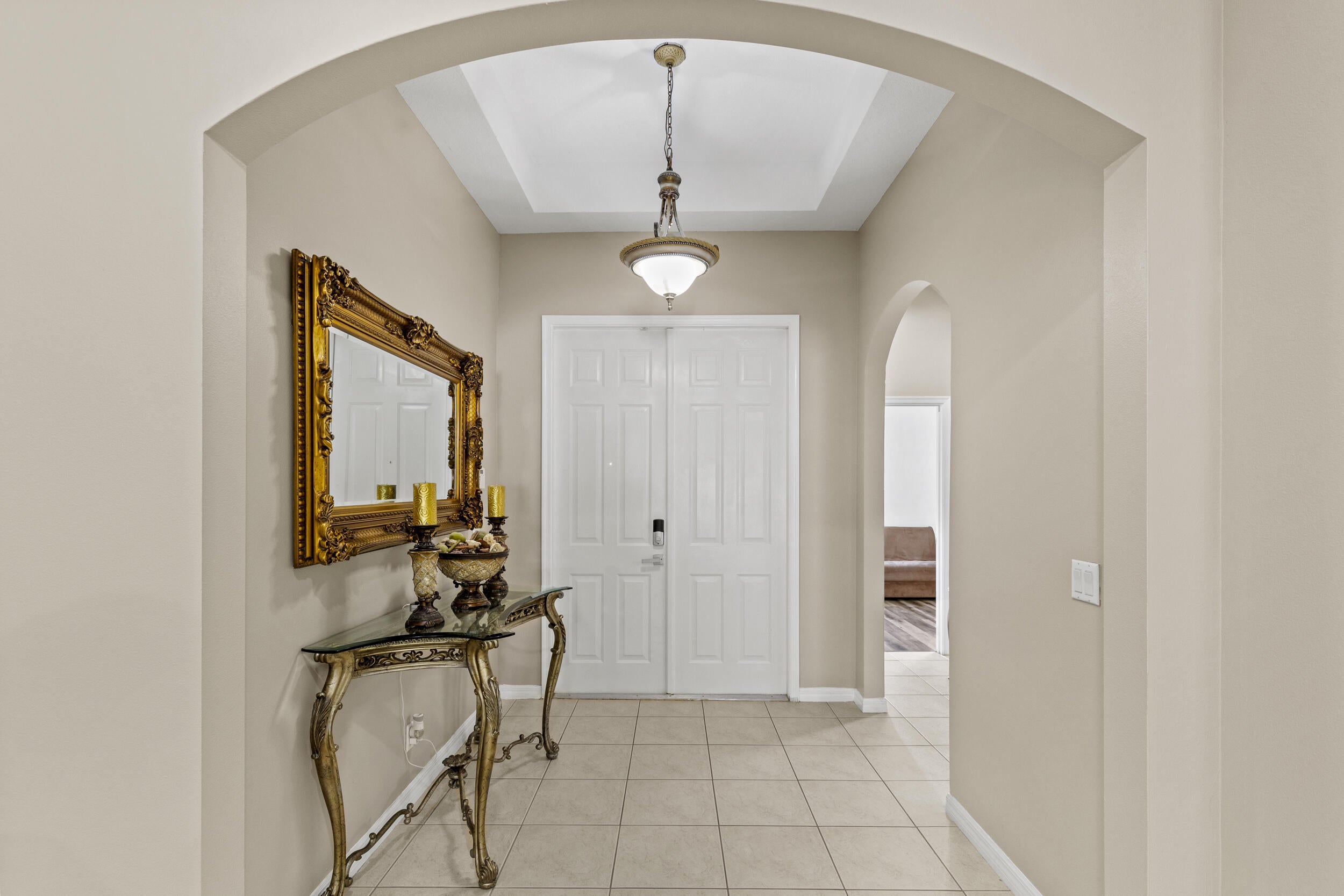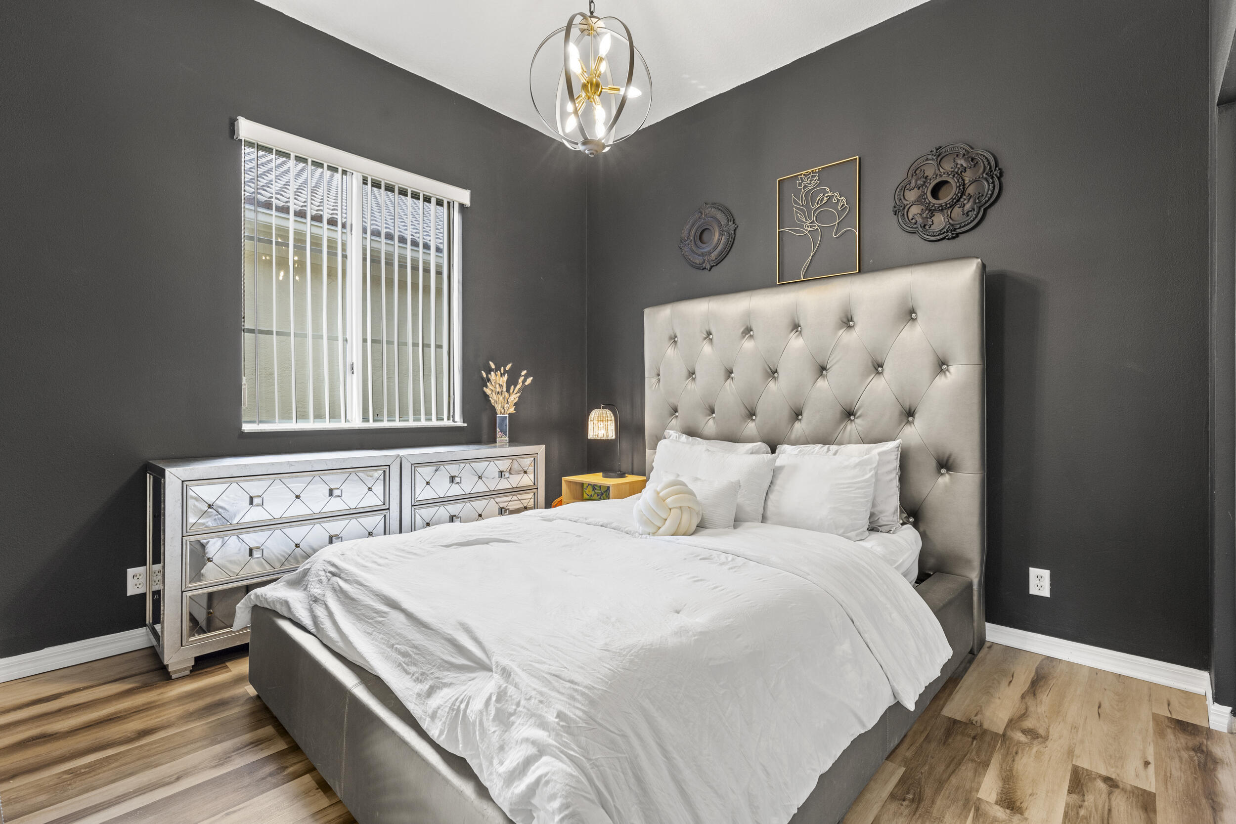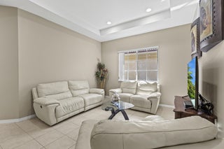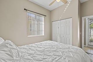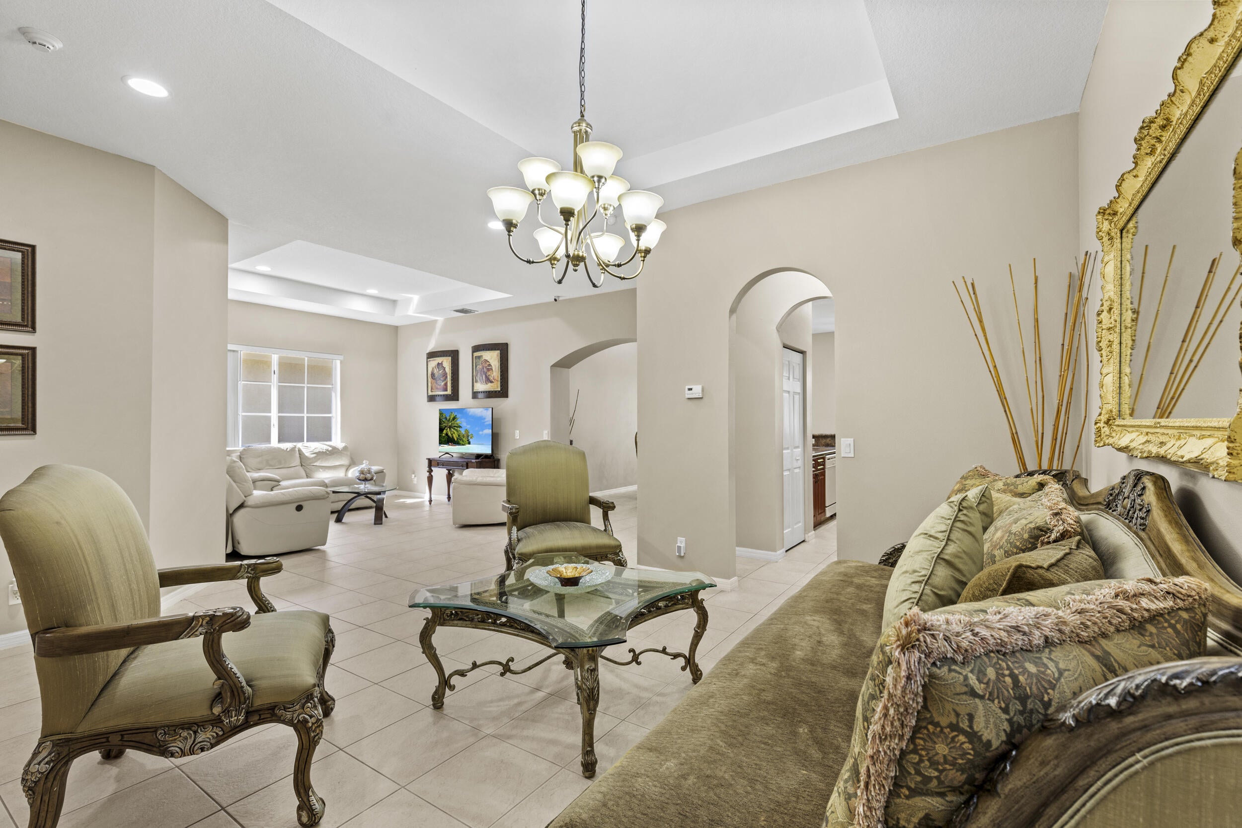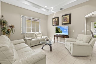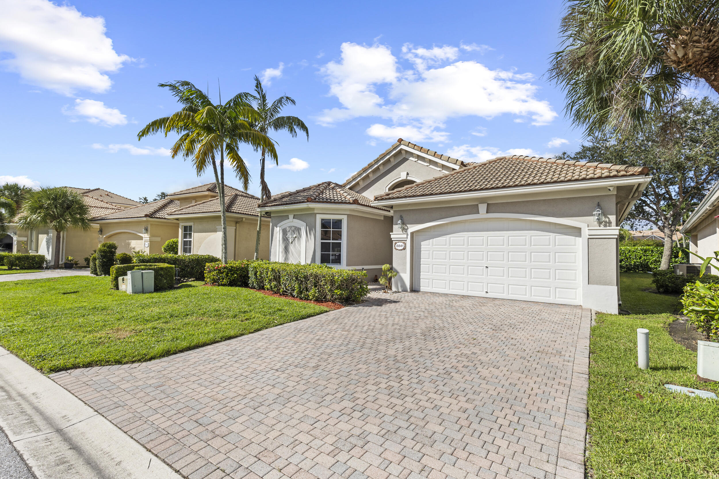 Immaculate move in condition 4 bedroom 3 bath one story home. Large open and flexible living areas plus an open eat in kitchen with a breakfast bar. 3 way split bedroom plan. High ceilings throughout. Primary bedroom has 2 walk in closets, a tray ceiling, plus access to the covered patio. Primary bathroom has a large soaking tub, separate shower, double sinks and a linen closet. Inside utility room with full size washer and dryer. Double door front entry into a spacious foyer. Paver driveway and a 2 car garage with high ceilings for lots of storage. Sidewalks throughout this guard gated neighborhood.Lots of activities at the community clubhouse for all ages. Tennis, pickleball, pool, fitness, playground, ping pong, billiards, cards, banquet hall with a kitchen and management on site.Great location just north of Okeechobee, close to world class shopping and dining, easy access to Turnpike, convenient to Palm Beach International airport. Photos coming soon!