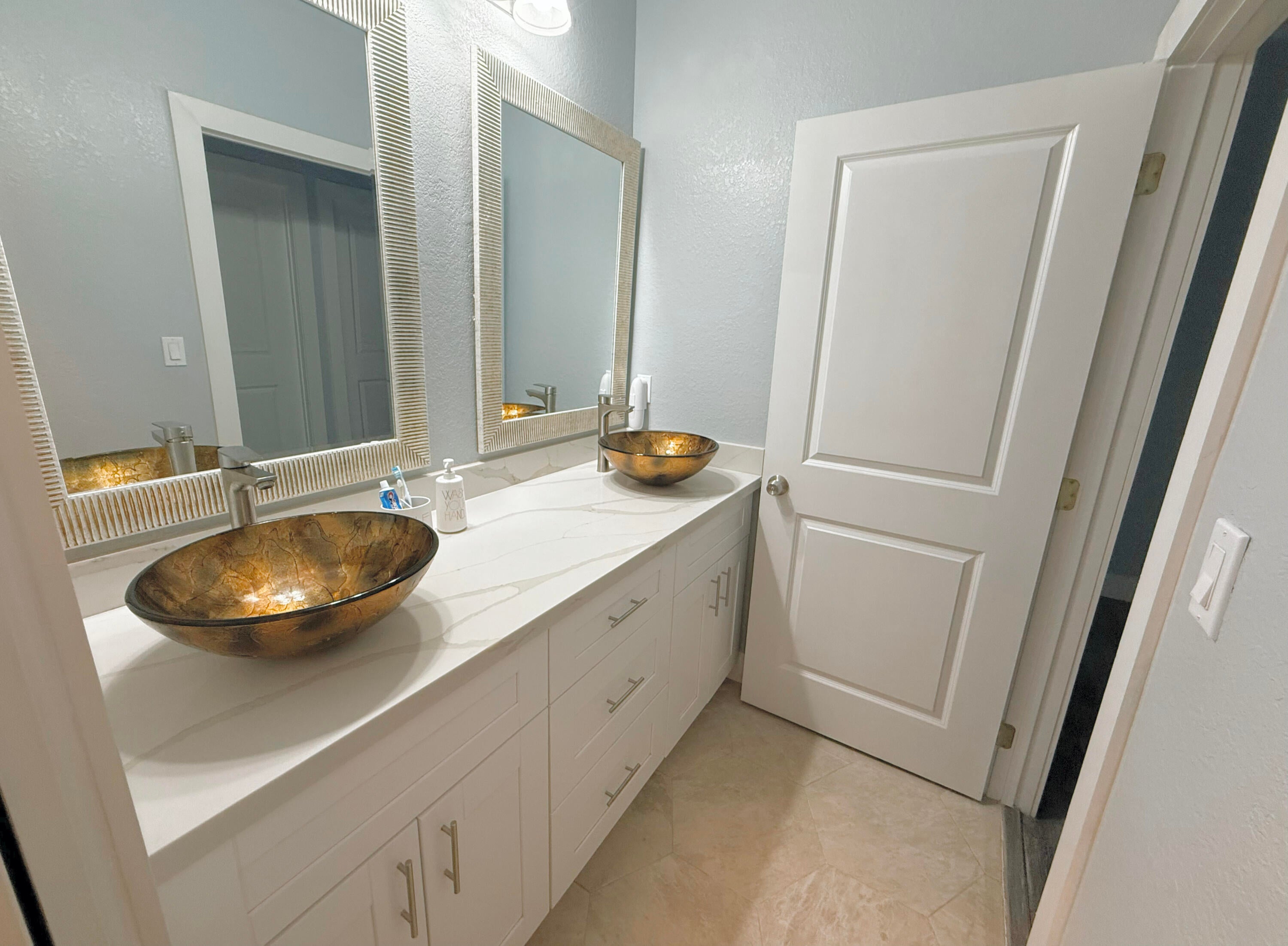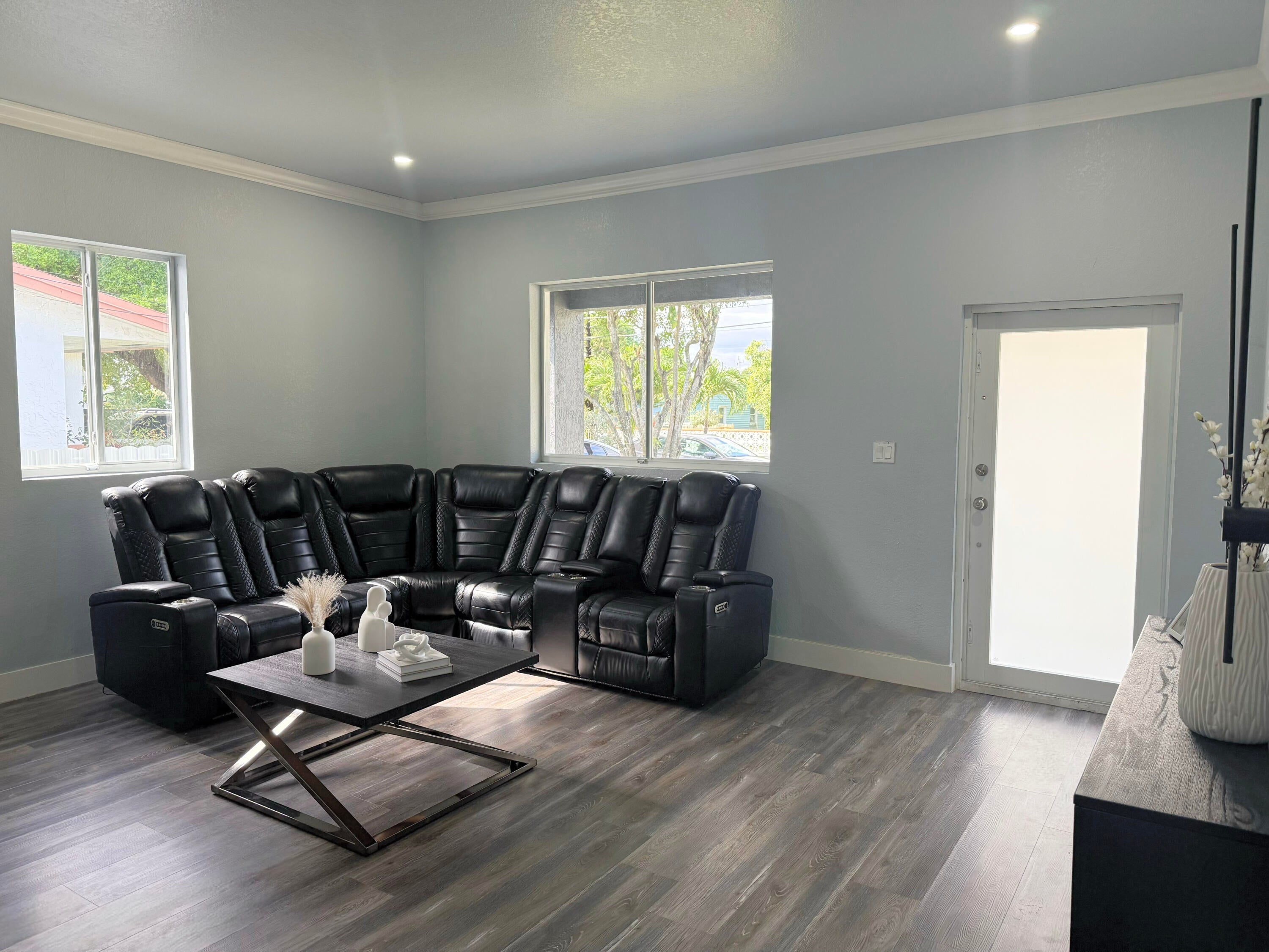 Discover this stunning 3-bedroom, 2-bath home perfectly blending comfort, style, and functionality! Featuring soaring 10-ft ceilings with crown molding, elegant vinyl and tile flooring, and spacious living and family rooms. The modern kitchen shines with quartz countertops, stainless steel appliances, and a smart refrigerator. The primary suite offers a walk-in closet, dual sinks, and sliding impact glass doors leading to a covered patio, perfect for relaxing. Enjoy peace of mind with impact windows and doors, security cameras, and a two-car garage with remote and keypad entry. Complete with front and rear porches and an automatic sprinkler system, this home is truly move-in ready!