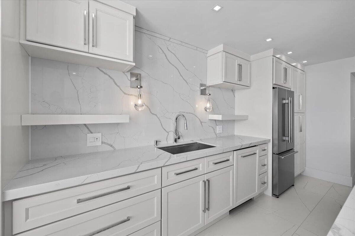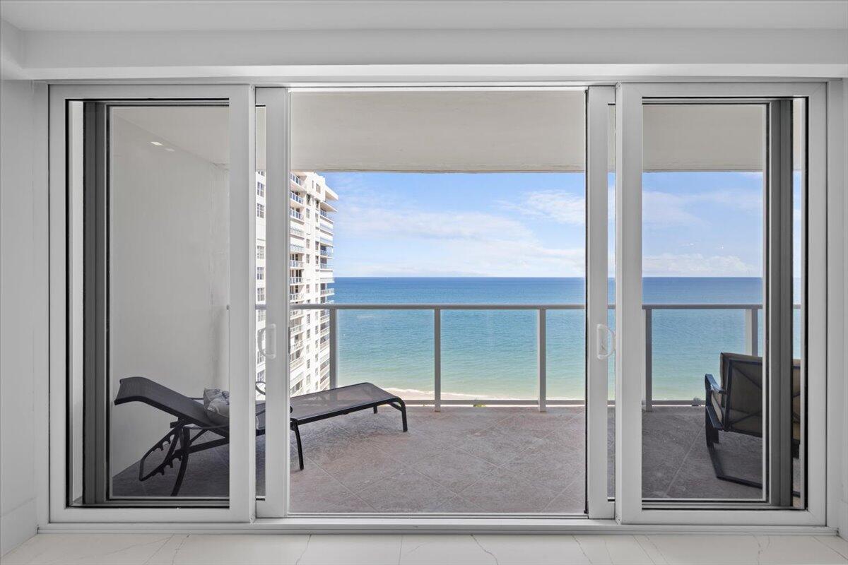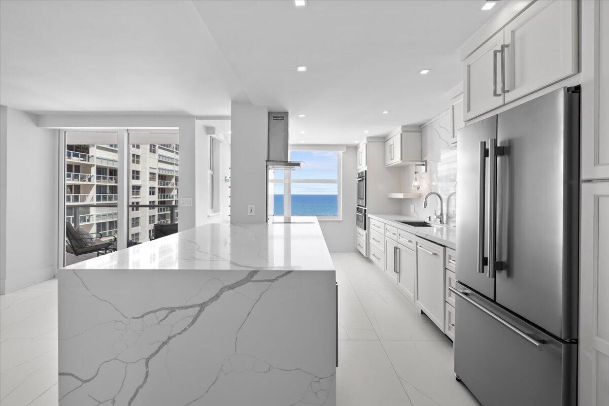 Welcome to Residence 15D at the prestigious Plaza East on Fort Lauderdale's Famous Galt Ocean Mile. This fully renovated 2-bedroom, 2-bathroom oceanfront residence offers breathtaking, unobstructed views of the Atlantic Ocean and Intracoastal Waterway from the 15th floor. Thoughtfully designed with high-end finishes and custom features throughout, this home combines modern coastal elegance with luxury living. The open-concept kitchen is a showstopper, featuring custom white shaker cabinetry, premium Forno European-designed stainless steel appliances, quartz countertops, and a stunning waterfall-edge peninsula ideal for entertaining.A full-height quartz backsplash, contemporary pendant lighting, and floor-to-ceiling impact windows bring in abundant natural light and frame the spectacular views. The ceilings have been significantly raised, enhancing the home's spacious and airy feel. Flooring throughout is 48" Spanish porcelain tile. Additional upgrades include complete electrical and plumbing systems throughout and a high-end Samsung full-size washer and dryer. The primary suite is a serene retreat with a spa-inspired ensuite bathroom, custom built-ins, and accent lighting. The second bedroom features a large barn-door closet, and the home includes multiple custom nooks with integrated lighting for added function and style. Plaza East is a full-service, 21-story beachfront building offering a lifestyle of true luxury: 24-hour doorman and concierge, complimentary valet, the largest heated oceanfront pool on Galt Mile, private beach access with daily chaise and umbrella service, ocean-view fitness center, sauna, clubroom, library, shuffleboard, putting green, BBQ area, and on-site manager and maintenance staff. Whether you're looking for a full-time residence or a luxurious seasonal retreat, this is your chance to live in one of Fort Lauderdale's most iconic oceanfront communities.