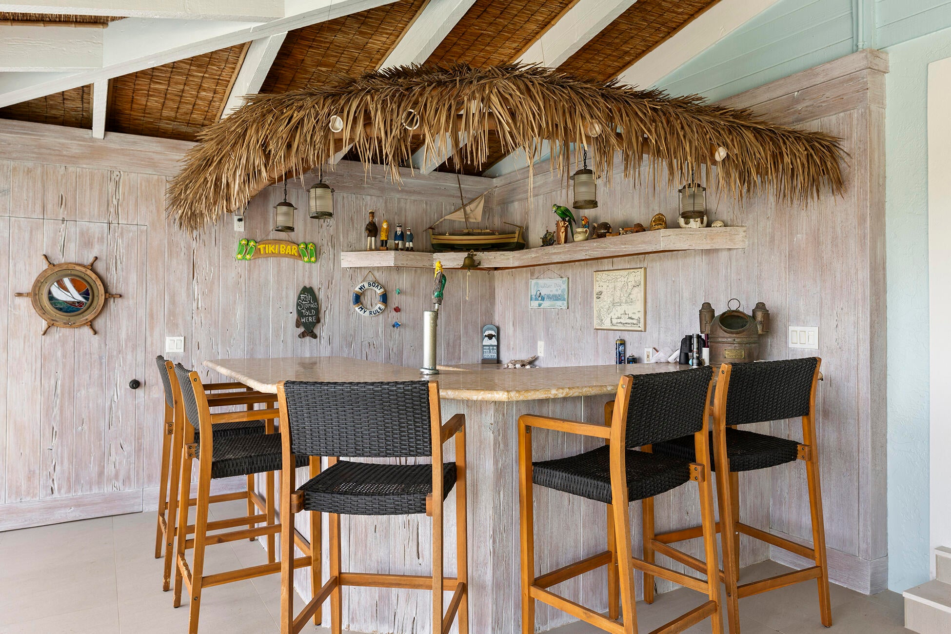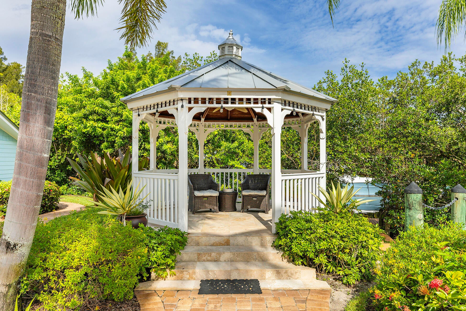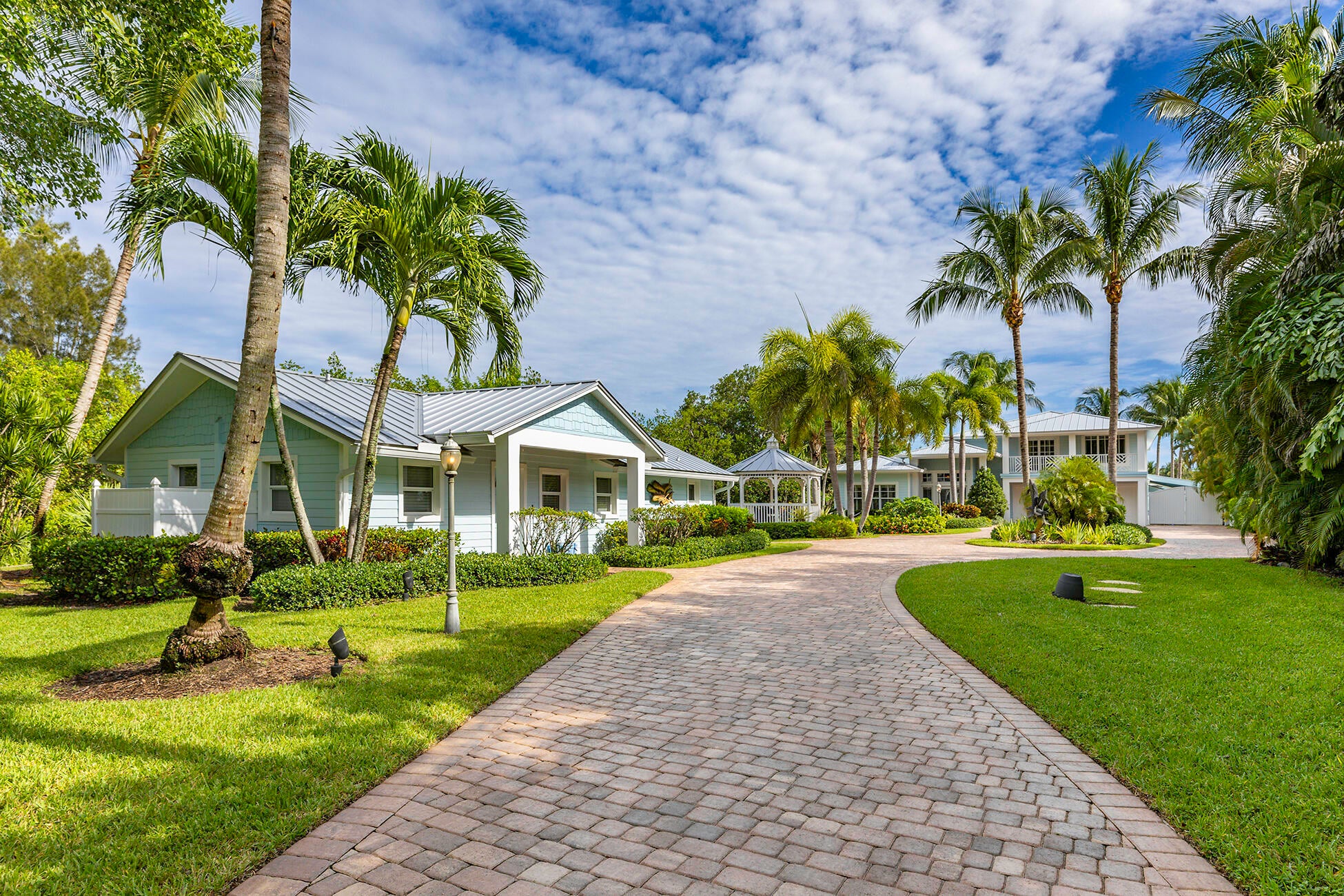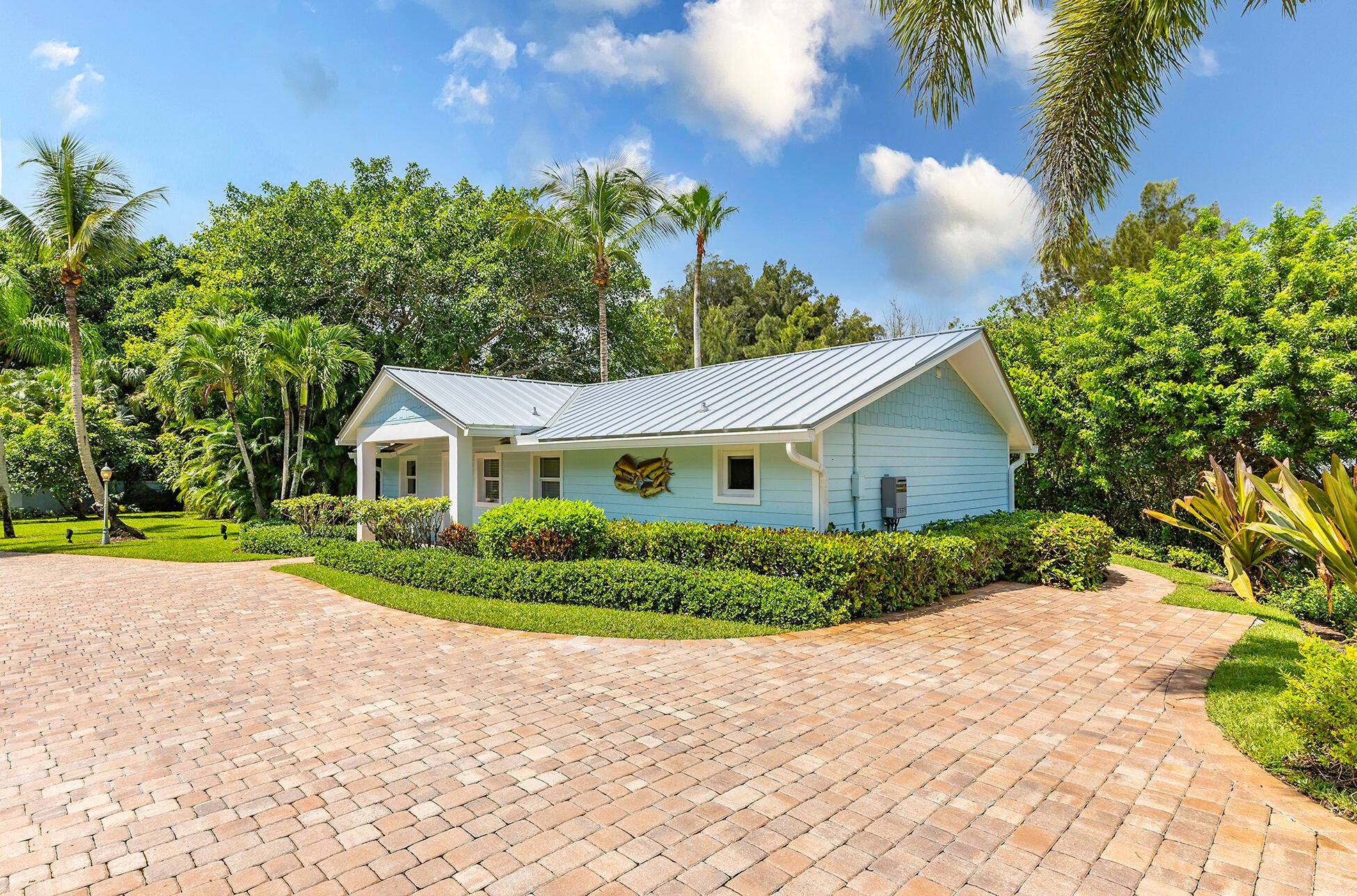 The banyan tunnel leads you to a rare trophy WATERFRONT estate, move-in ready and fully furnished. At the end of Stuart's most photographed road, your gated drive opens to nearly an acre of PRIVACY and 500' of protected shoreline with sweeping views toward the INLET and ''The Crossroads.'' Enjoy true deepwater dockage with multiple docks, two lifts, room for an 80' yacht, and quick ocean access. Reimagined in 2023/2024 with a new standing-seam metal roof, full impact glass, whole-house generator, and new garage doors. The home blends timeless Key West architecture with modern coastal design. Perfect for true boaters and entertainers, with media room, balcony suite, heated saltwater pool, tiki bar, lush landscaping, guest house, no HOA, minutes from downtown Stuart, and not in a flood zone