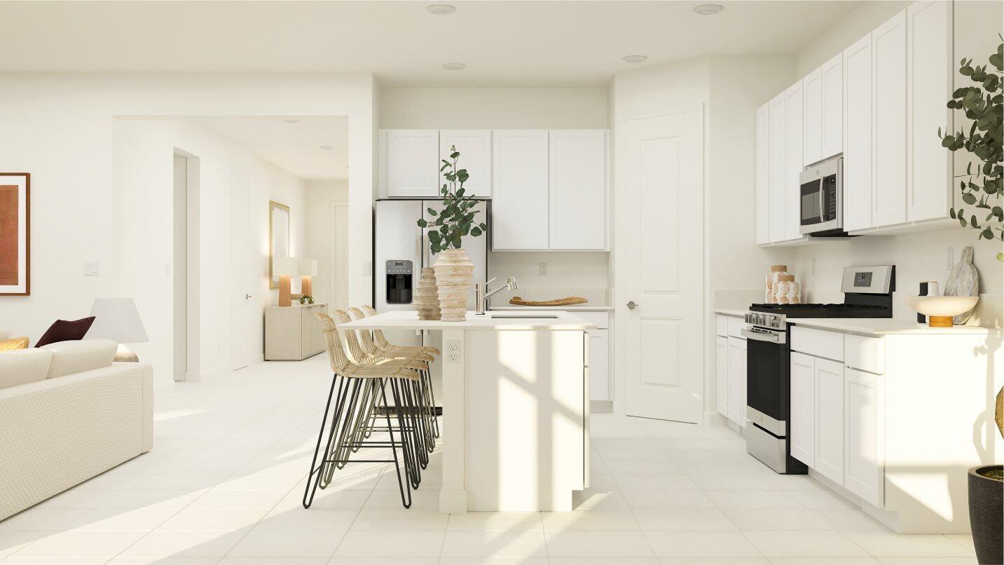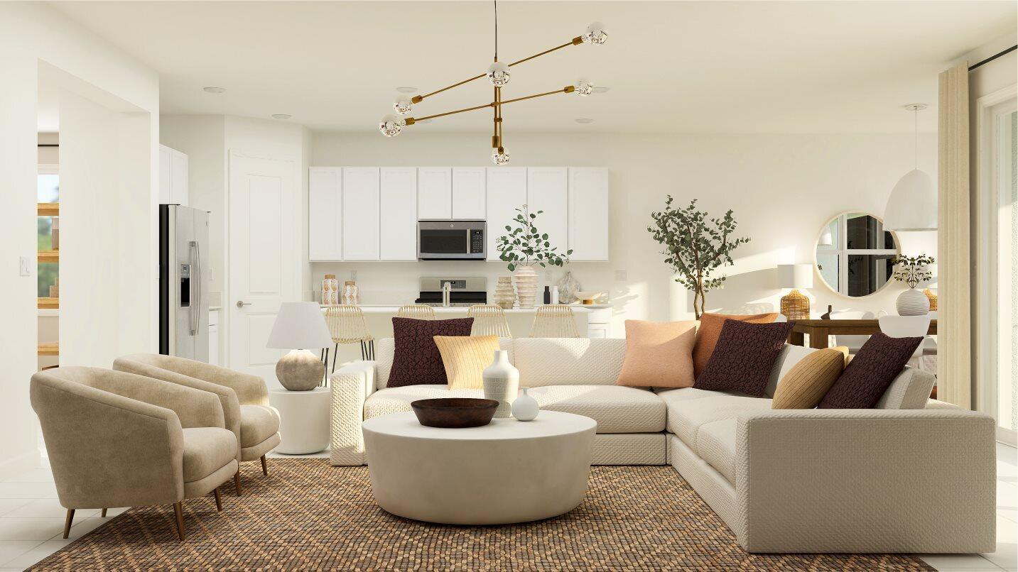 This new single-level home features a convenient bedroom and full bathroom off the foyer, leading to a versatile flex space ready to be used to meet the evolving needs of the home. The inviting open-concept layout is designed for seamless entertaining and multitasking, complete with access to an outdoor lanai. Three bedrooms are tucked away to the side of the home, including the luxe owner's suite in a private back corner, offering direct access to a spa-inspired bathroom and walk-in closet.Prices, dimensions and features may vary and are subject to change. Photos are for illustrative purposes only.