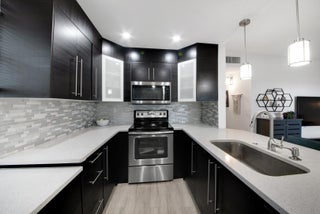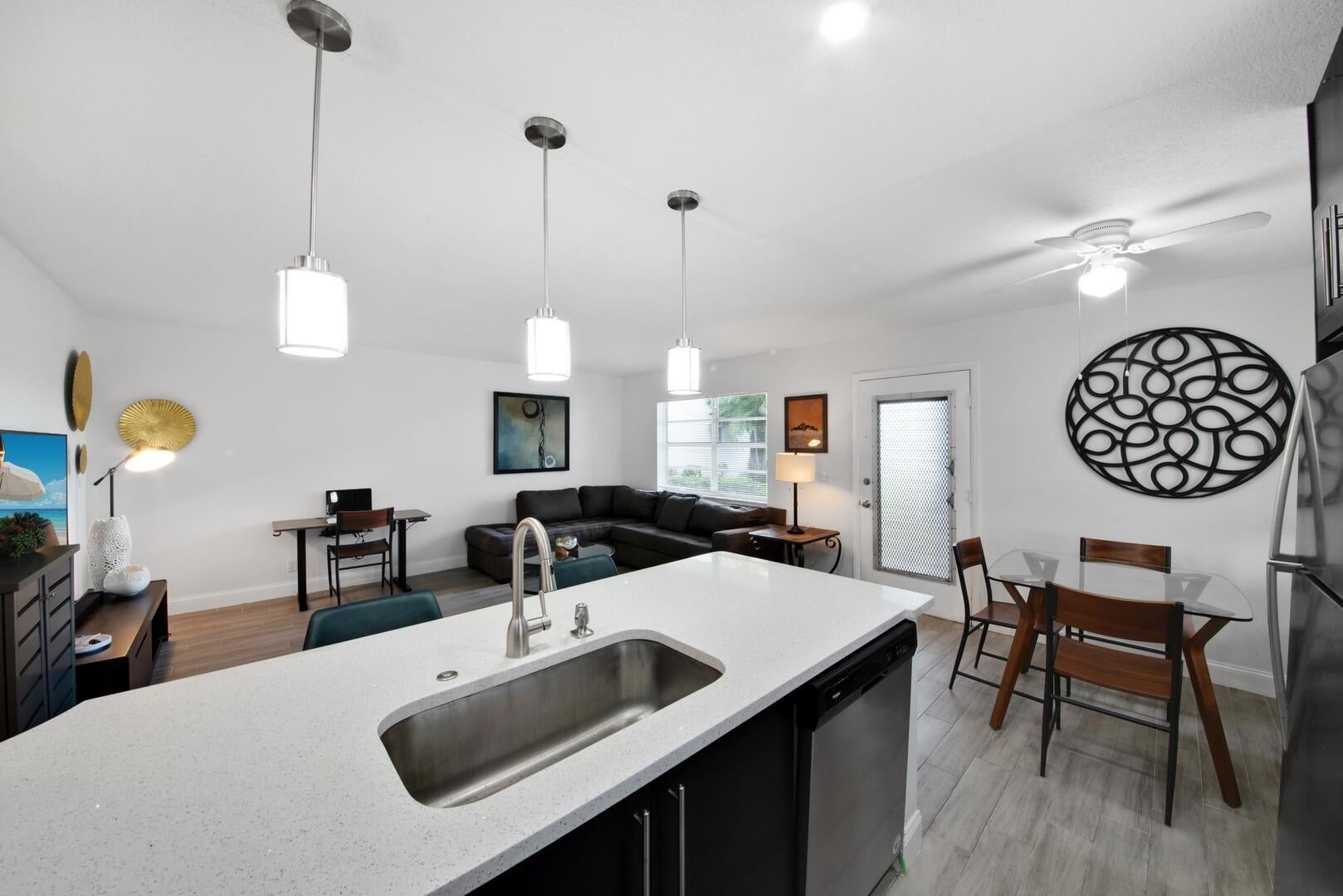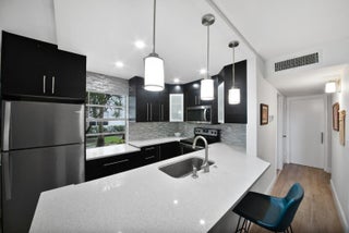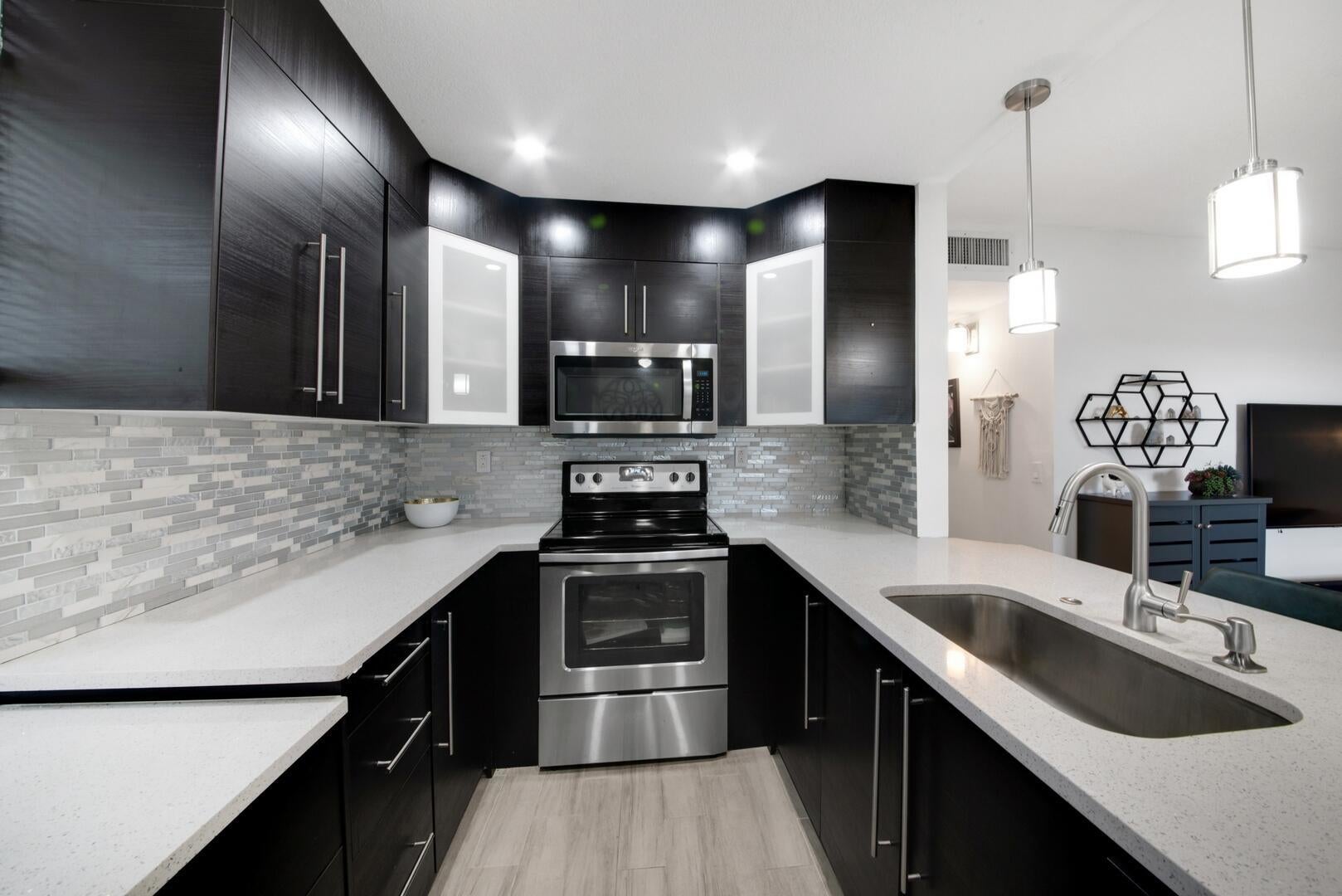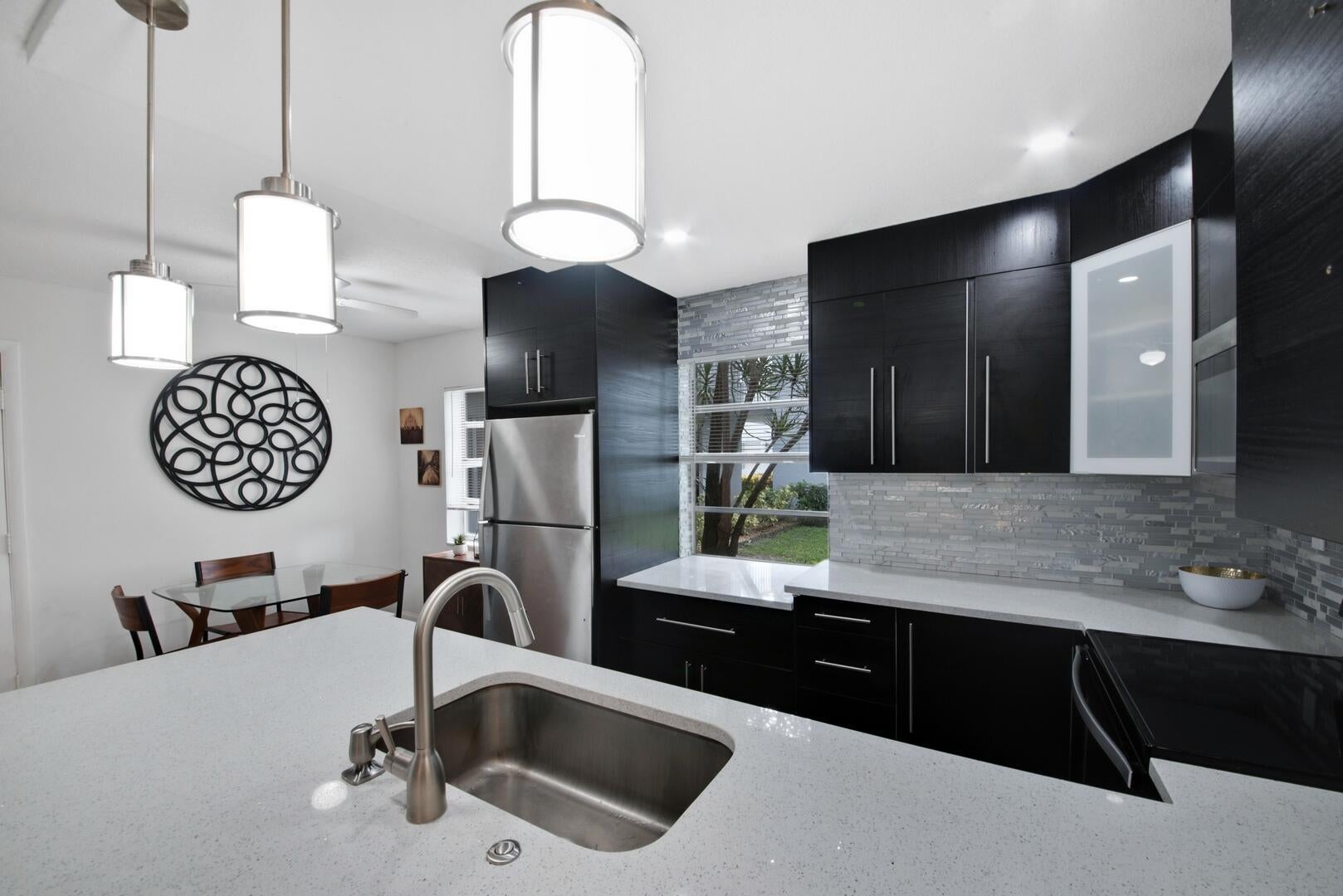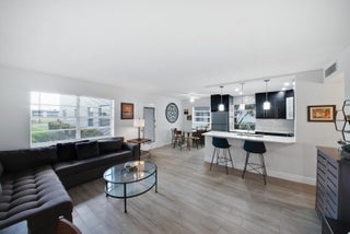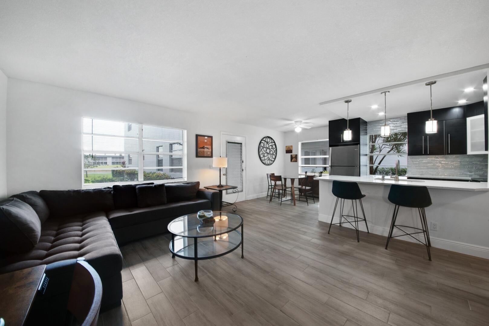 Step into this meticulously updated 2-bedroom, 2-bathroom condo where every detail has been thoughtfully curated for modern living. Located on the first floor for easy access.The gourmet kitchen is a chef's delight, boasting custom-designed cabinets, brilliant quartz countertops, all newer stainless steel appliances, and contemporary fixtures. The open-concept living area flows seamlessly, offering stunning, golf course and water views.The entire unit features durable, elegant wood-look tile flooring, providing a cohesive and upscale feel. Both bathrooms have been fully remodeled with luxurious marble and designer tilework. Retreat to the enclosed sunroom/patio, featuring a beautiful ceramic tile, offering a serene garden area view. Located in a prime, quiet section of the community.