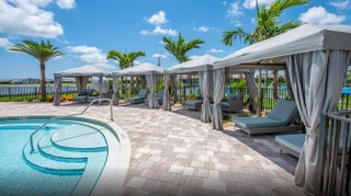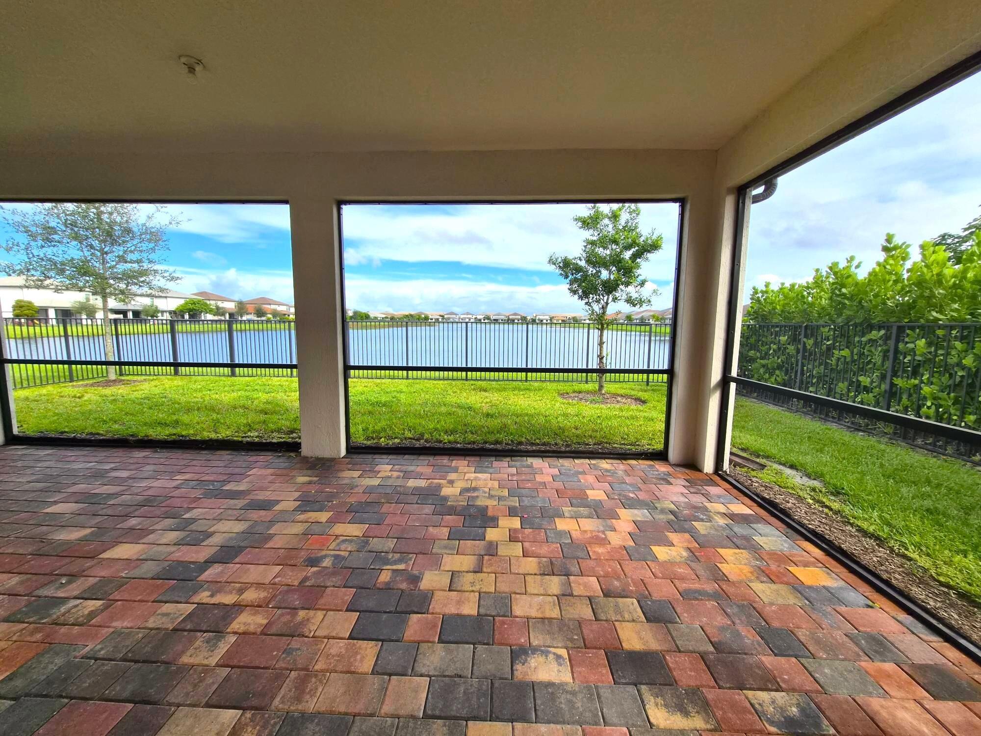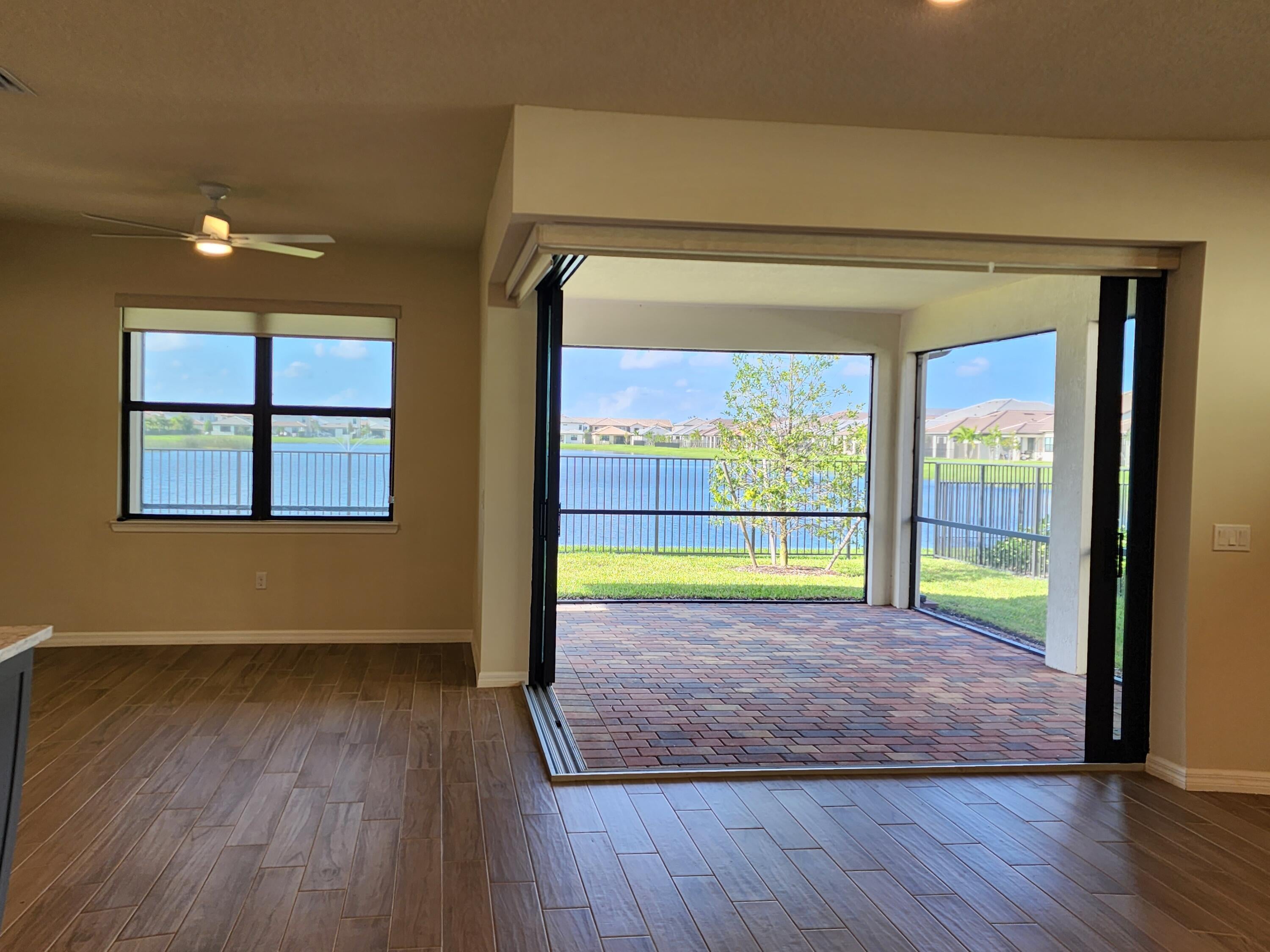 Gorgeous lakefront house built in 2022: 4 bedrooms, 2 bathrooms, large living room and dining area. Fully fenced backyard - perfect for dogs. Wood-like tile and LVP flooring throughout the house (no carpet anywhere!). Impact windows & doors. 2-car garage. Blackout shades in bedrooms. Energy efficient LED lighting throughout the house. Fans in each bedroom. Huge, screened patio with a zero-corner, pocket sliding glass door allows you to enjoy the best lake and fountain view in the community. Laundry room with a sink. Gated community with a spectacular resort-style community pool, fitness center, tennis courts, pickleball courts, and a clubhouse accessible to residents via key fob. Fast HOA approval. Must see it to appreciate it!
