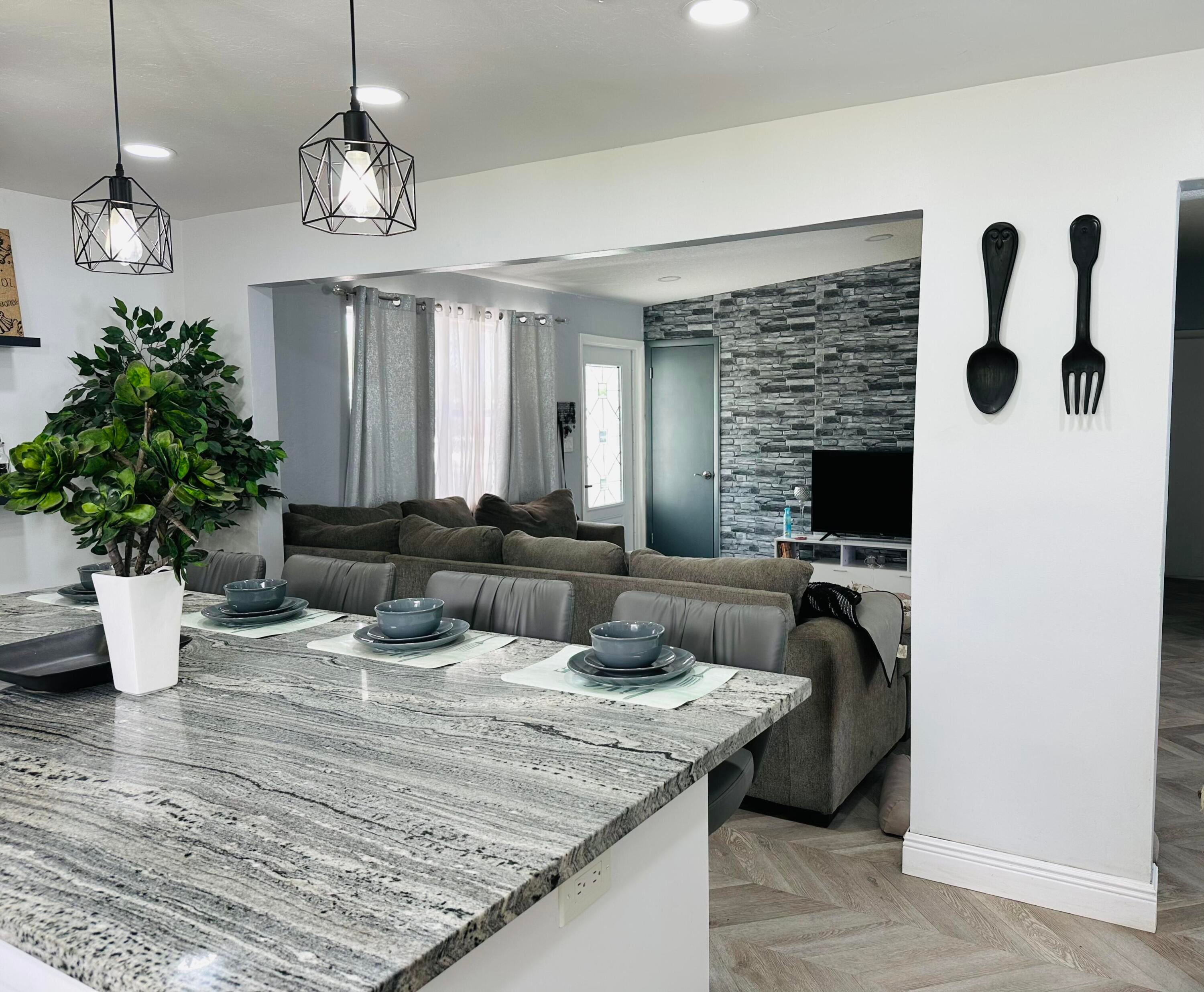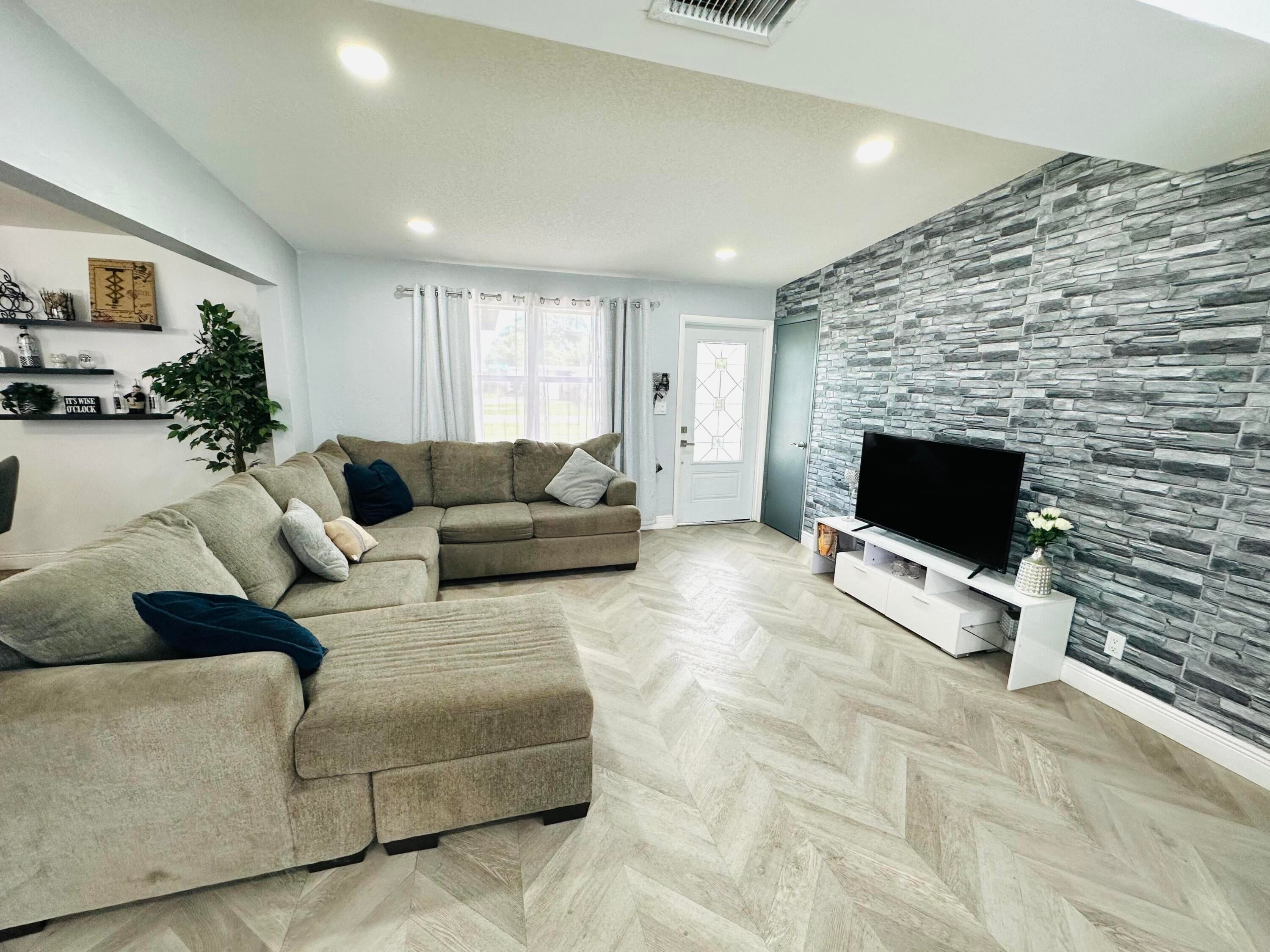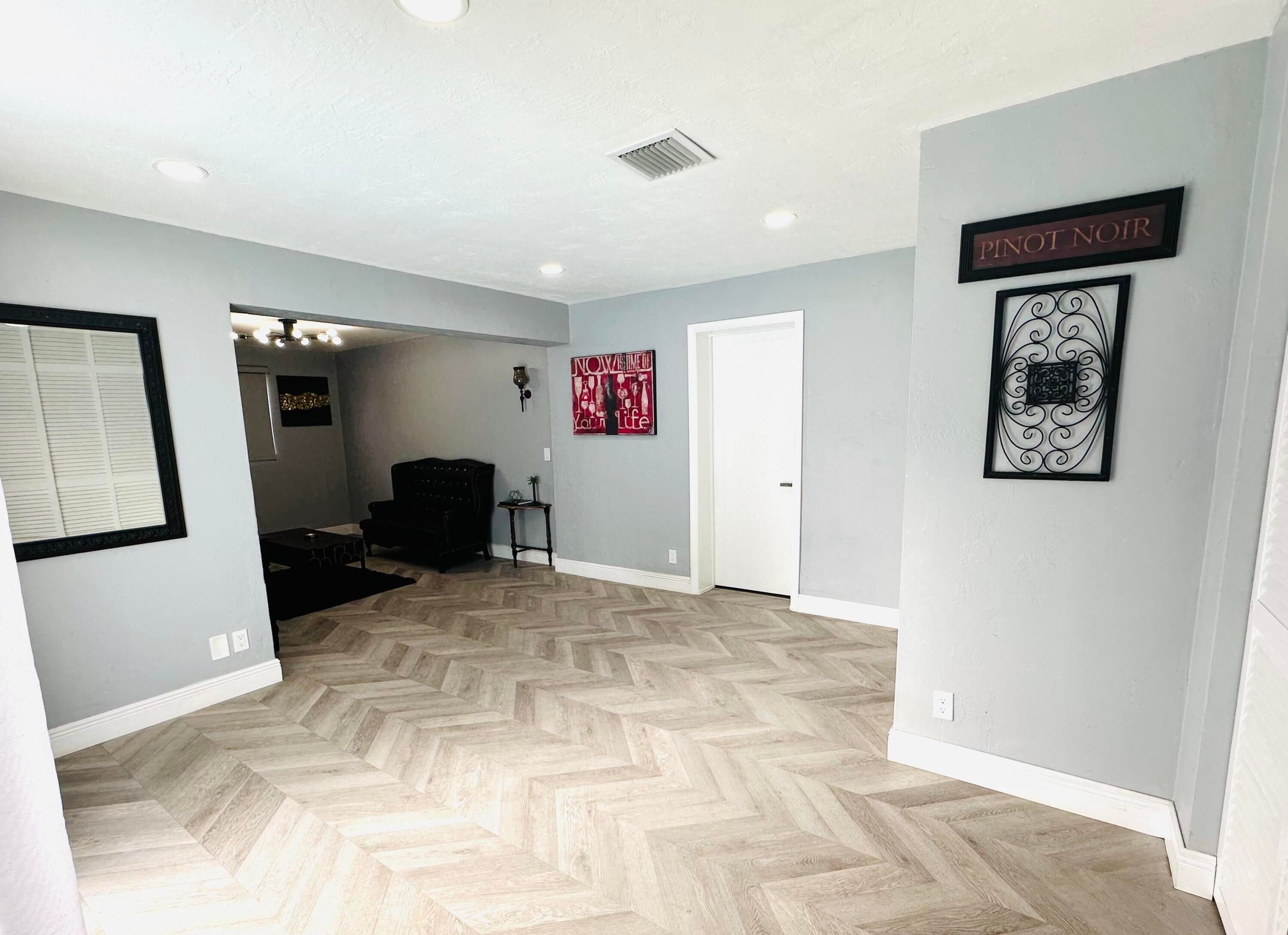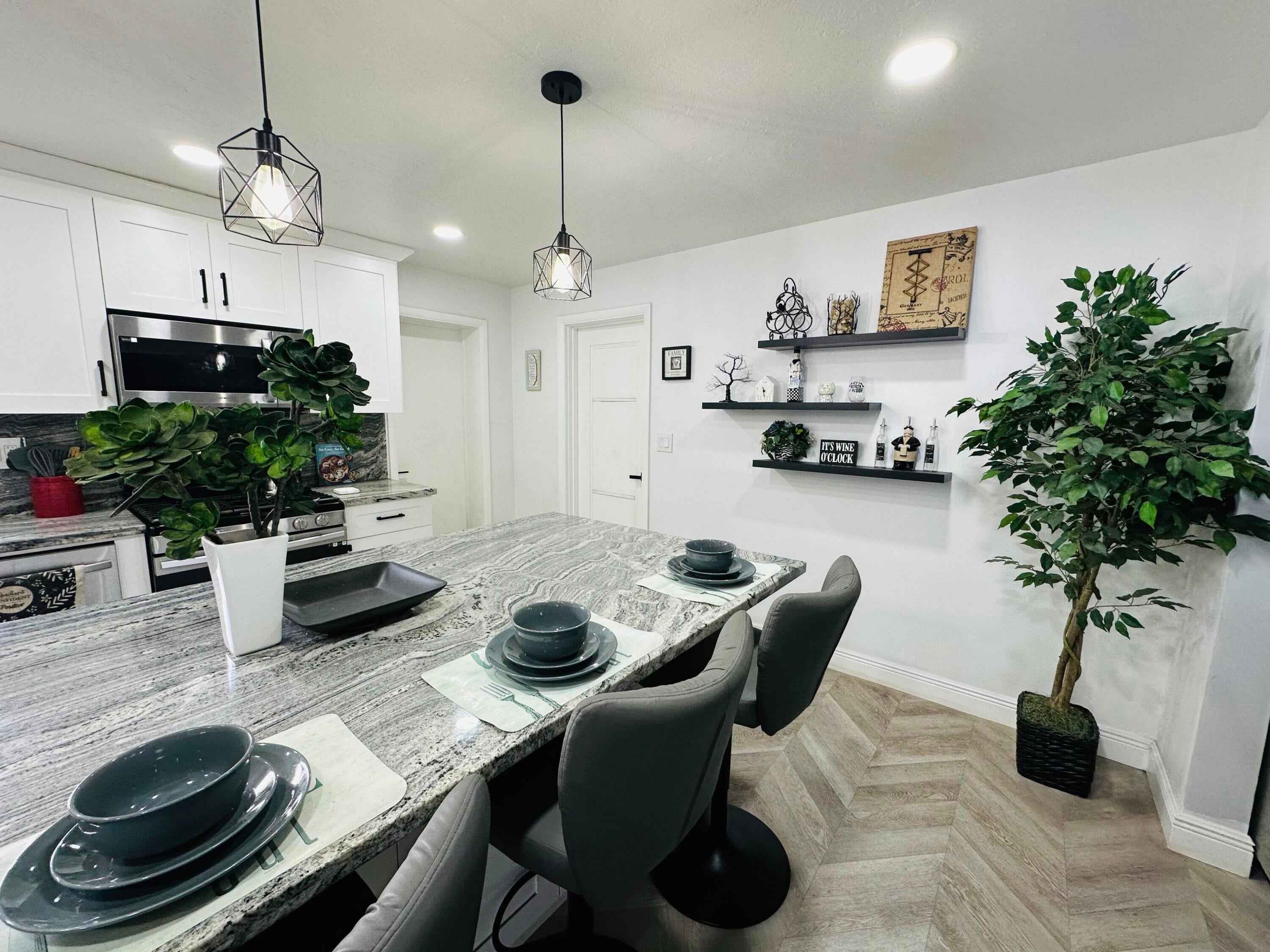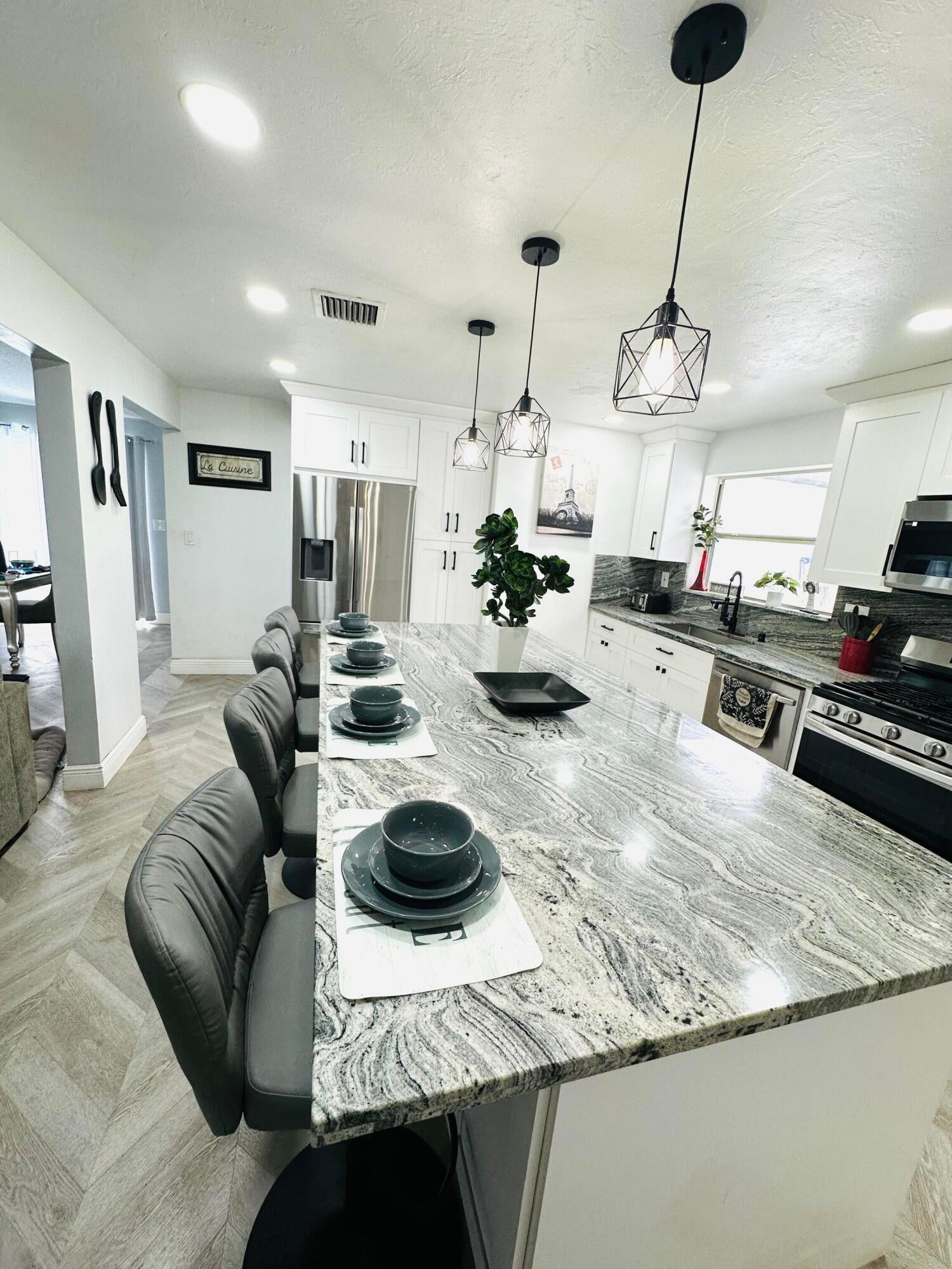 Completely remodeled open concept home in move in condition. It's the biggest house in this neighborhood with over 2200 LSF. New roof 12/24 and new AC system 6/23. Large windows and 2 sets of sliding doors provide tons of natural light. The remodeled kitchen boasts, new skaker cabinets, stainless steel appliances, granite countertops with a huge island 9FT long. Remodeled bathrooms have beautiful tile work from floor to ceiling, hallway bath also opens to the pool. There is a living room, dinning area and an extra large family room that can be used as an office or 4th bedroom. Previous owner converted gargage to a workshop, can be used as a mother in law suite. Large fenced yard with mango and avocado trees. 20 min to the beach, DTWPB & PBI and 8 min to Shark Wake Park and NO HOA!