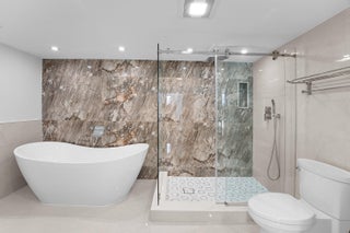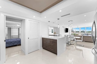 Location, Views, and Brand NEW! Completely renovated with high end, luxurious finishes. This open concept 2 bed/2 bath condo offers large tile floors throughout; quartz countertops, backsplash, and waterfall edges; LG stainless appliances; impact windows; new A/C and water heater; rain and handheld shower heads; free standing tub; square tiled shower drains; linear vent covers; custom built-in closets; raised kitchen/floating ceiling; LED lights throughout; sensor lights in bathroom, closets, and cabinets; and automatic blinds. The SE/SW exposure fills the space with natural light. Reclining sectional is comfortable spot to watch TV or enjoy the views. Private entrance to unit and easy access to covered parking spot. Close to PBI airport & world-class shopping, dining, diving, and fishing