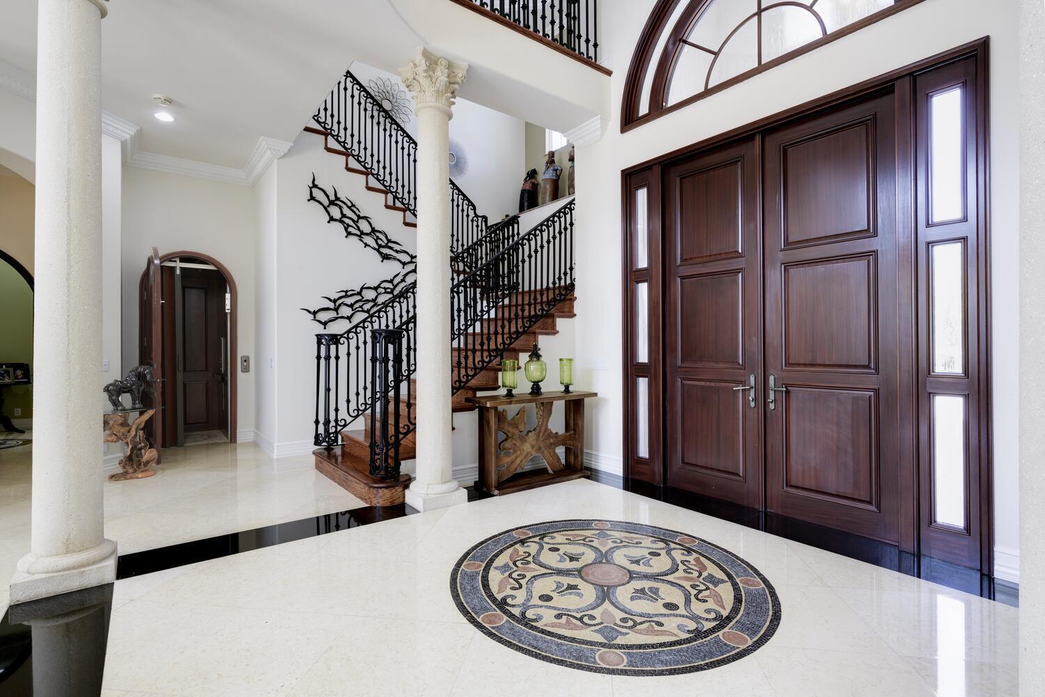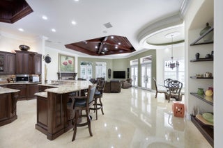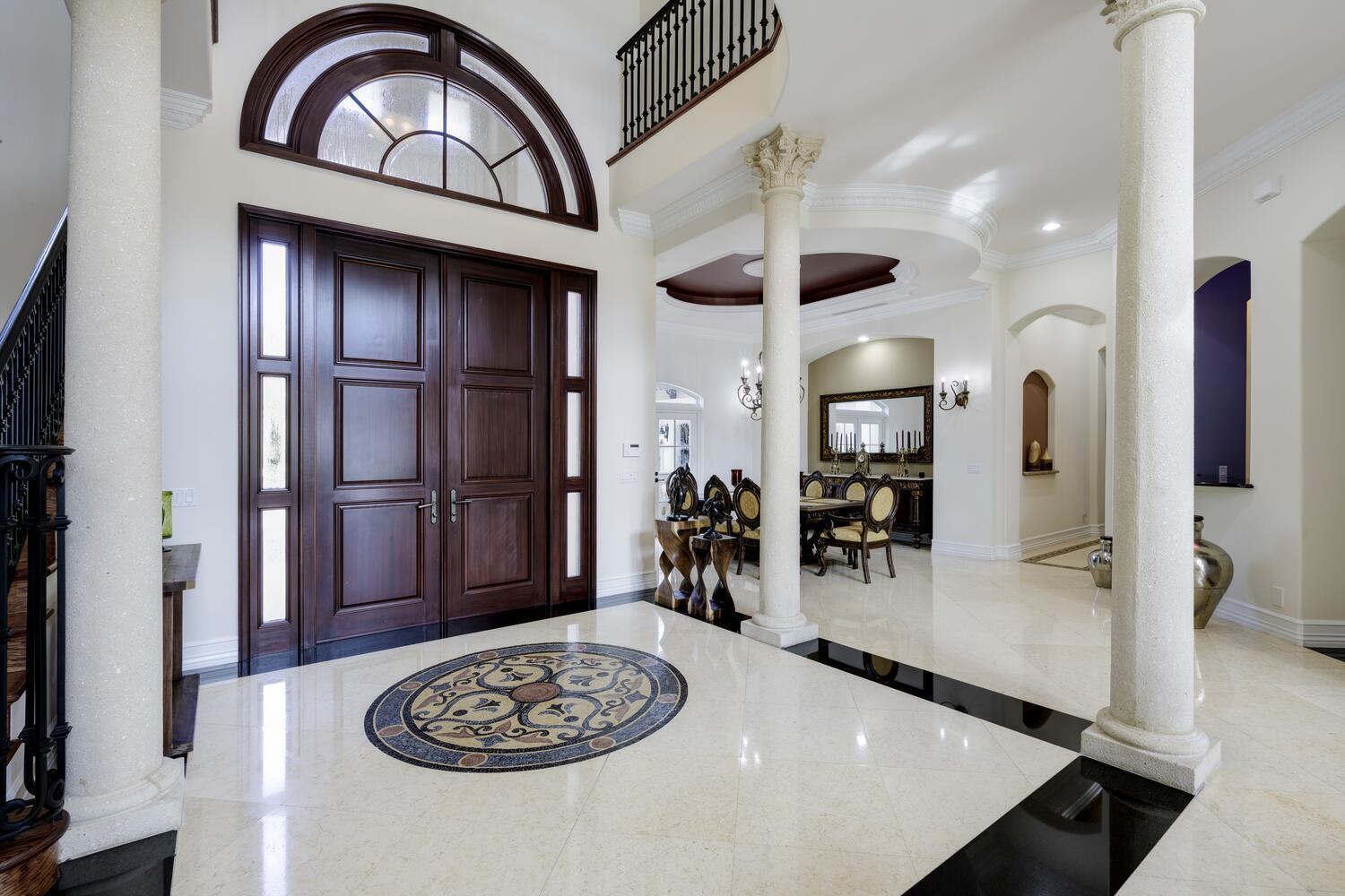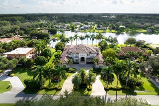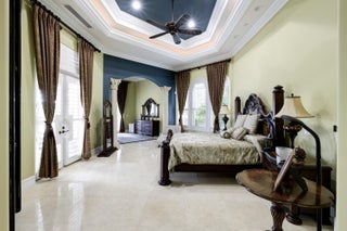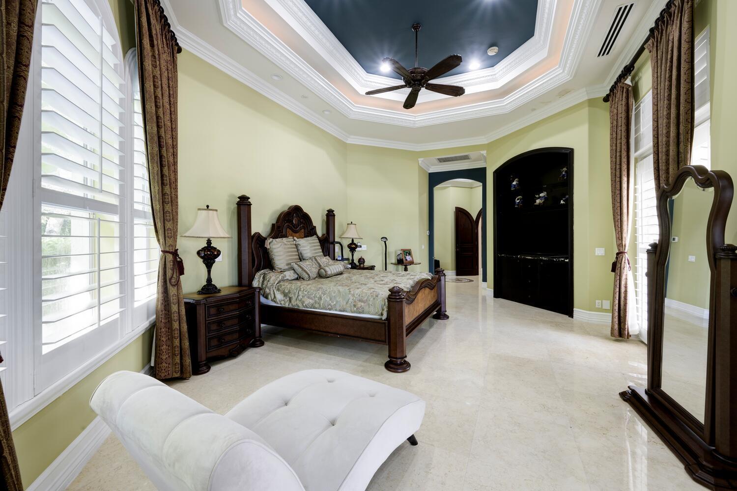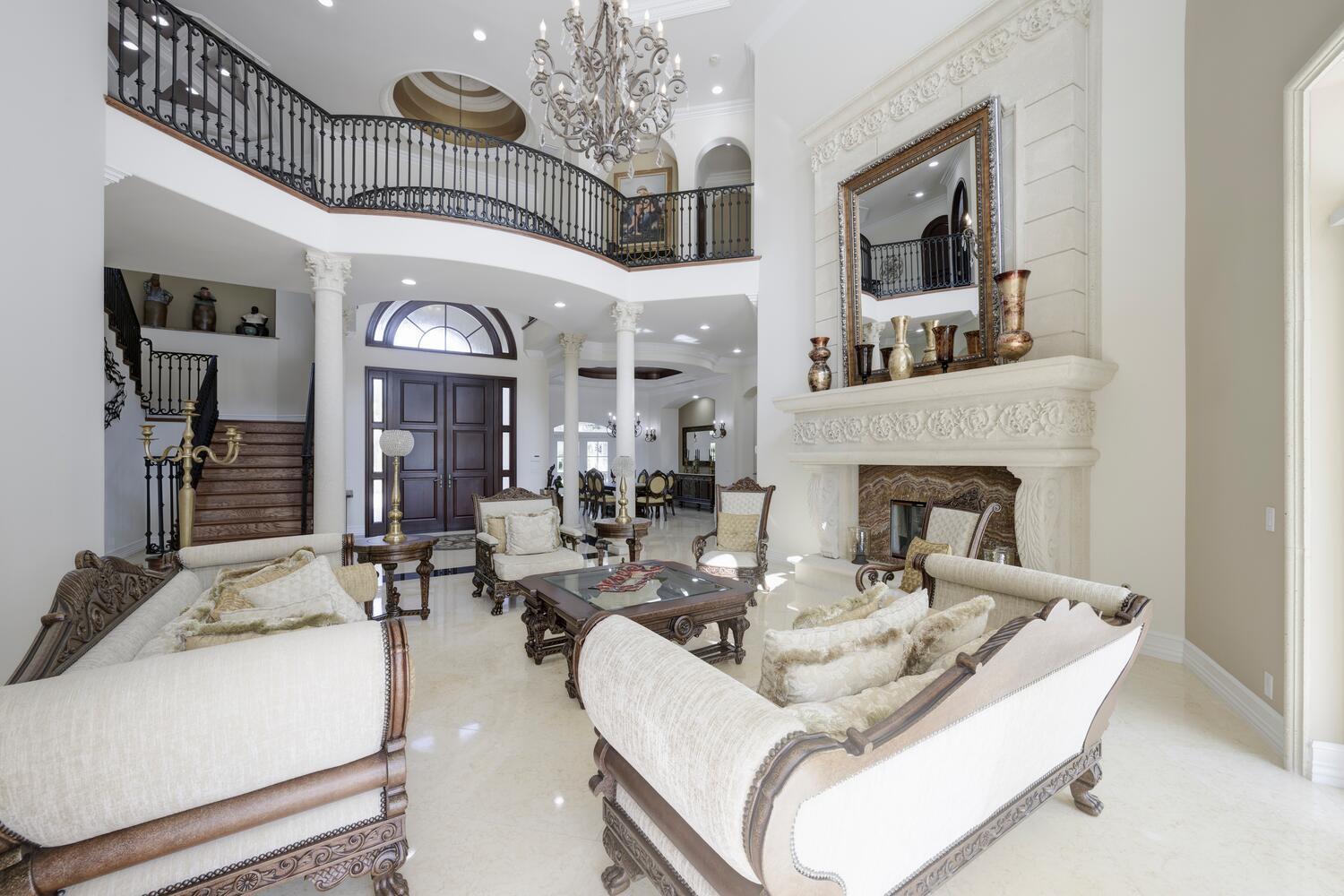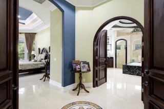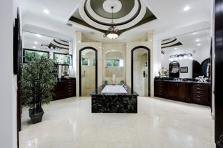 This stunning estate exceeds every expectation. A marble circular driveway leads to a grand foyer with 24'' Jerusalem Gold marble floors and a 30' atrium overlooking the pool and lake. The gourmet gas kitchen boasts Viking appliances, cherry cabinetry, Solaris granite, and a large prep island with rare Mystic sink. Enjoy the oversized family room with custom built-ins and seamless outdoor access. The primary suite offers a sitting area, dual walk-in closets, and spa bath. Outdoors, entertain with a full summer kitchen, bar, resort-style pool, and private sand volleyball court. Includes study, second master suite, cabana bath, dual garages, movie theater room, elevator, and upstairs media room with three ensuite bedrooms.