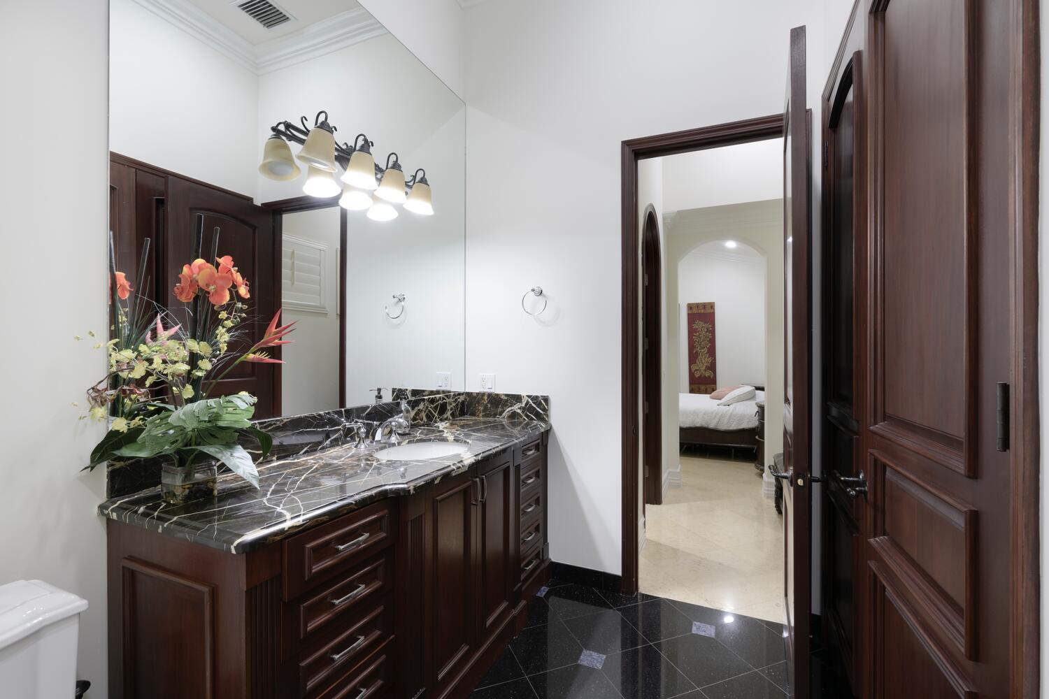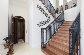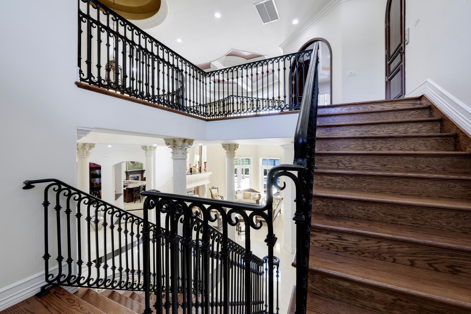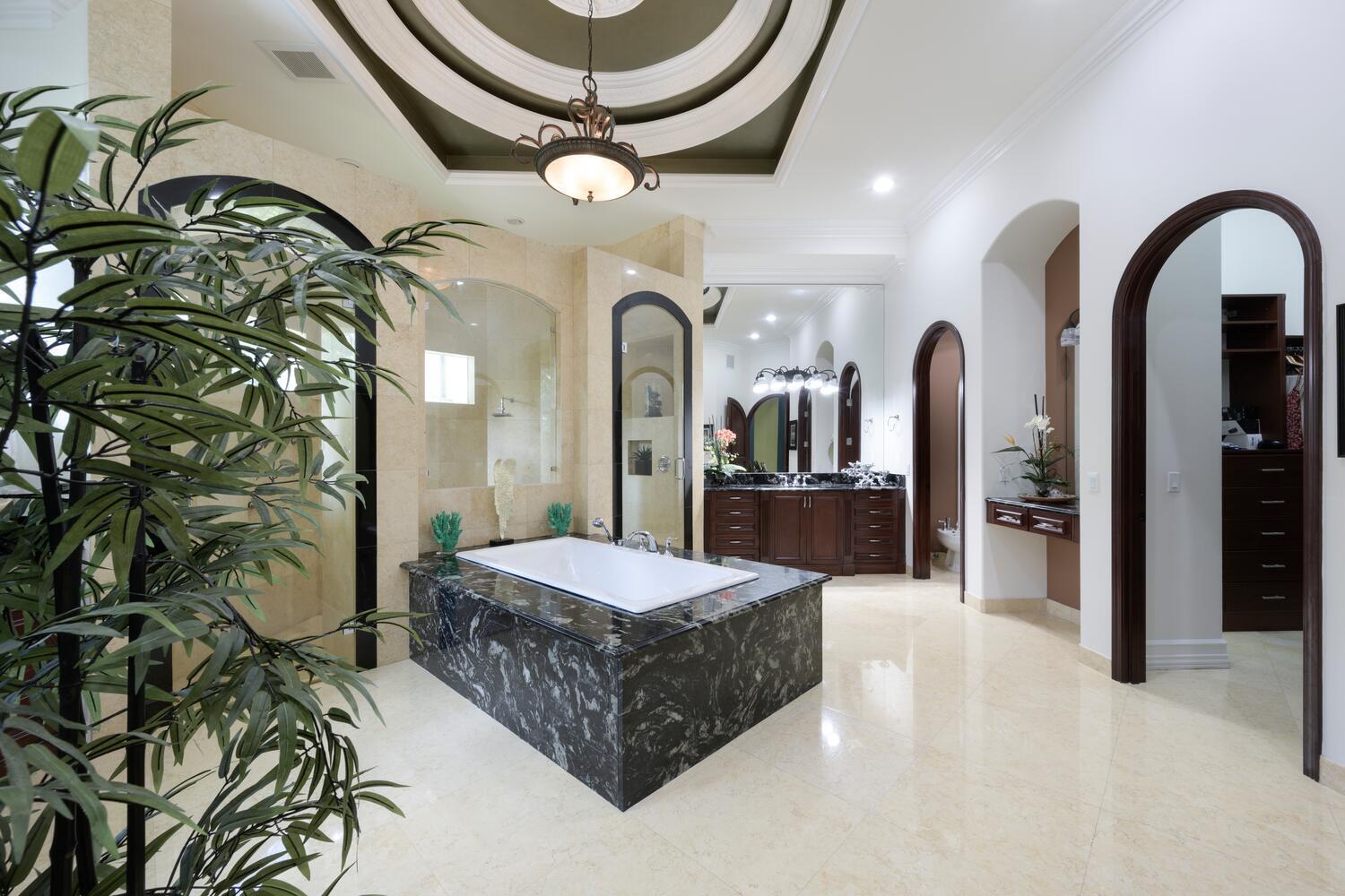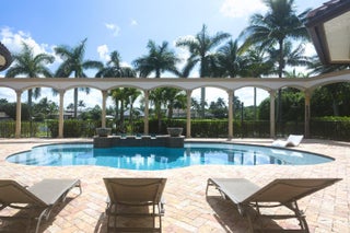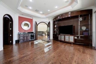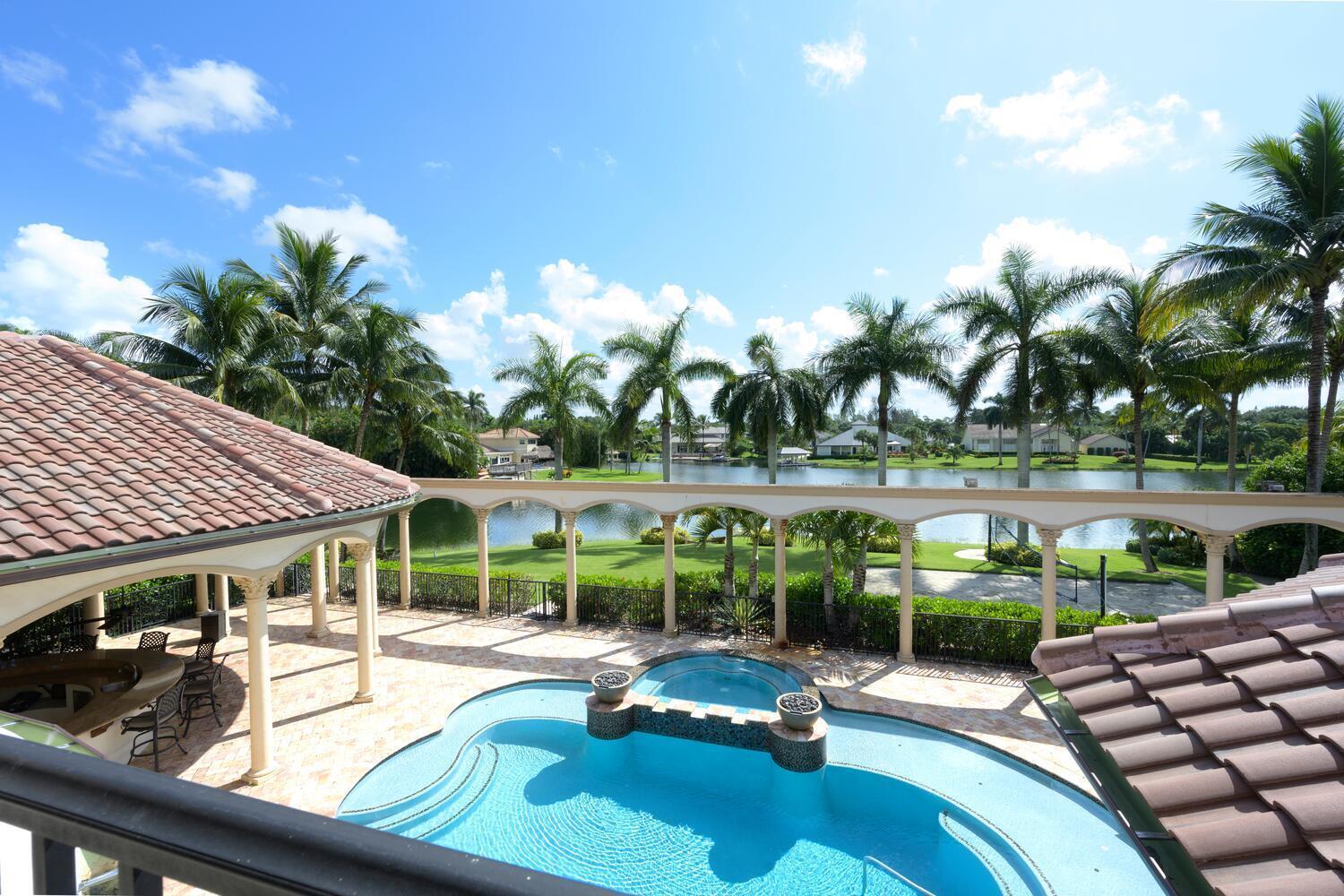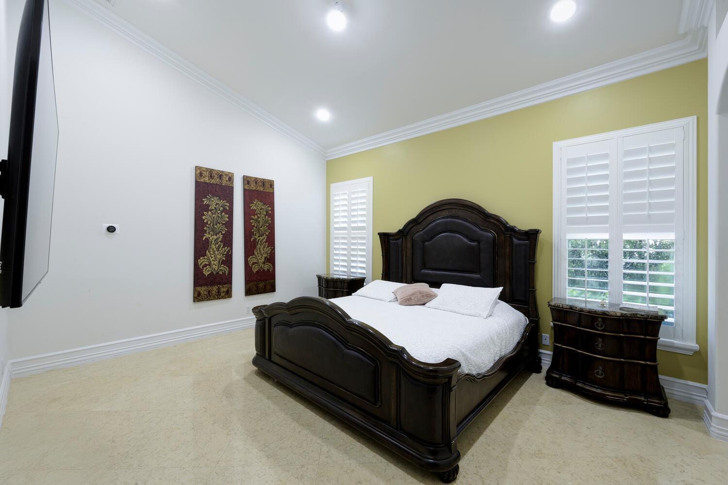 This stunning estate exceeds every expectation. A marble circular driveway leads to a grand foyer with 24'' Jerusalem Gold marble floors and a 30' atrium overlooking the pool and lake. The gourmet gas kitchen boasts Viking appliances, cherry cabinetry, Solaris granite, and a large prep island with rare Mystic sink. Enjoy the oversized family room with custom built-ins and seamless outdoor access. The primary suite offers a sitting area, dual walk-in closets, and spa bath. Outdoors, entertain with a full summer kitchen, bar, resort-style pool, and private sand volleyball court. Includes study, second master suite, cabana bath, dual garages, movie theater room, elevator, and upstairs media room with three ensuite bedrooms.