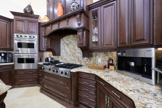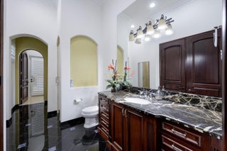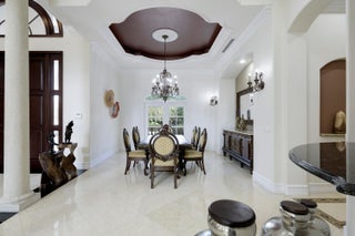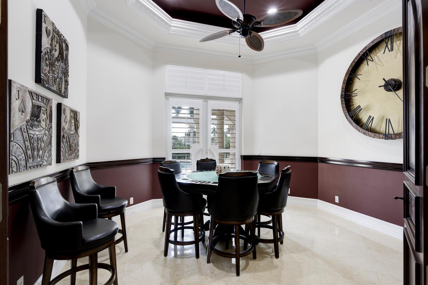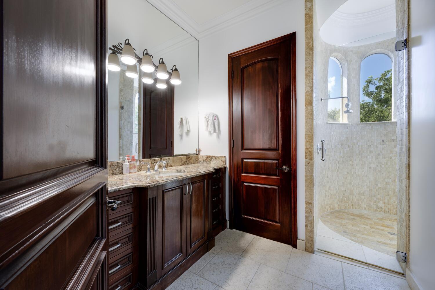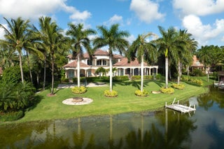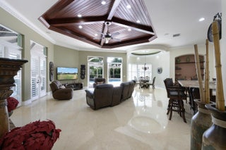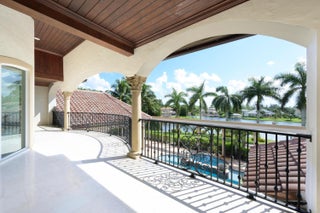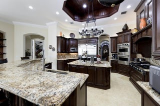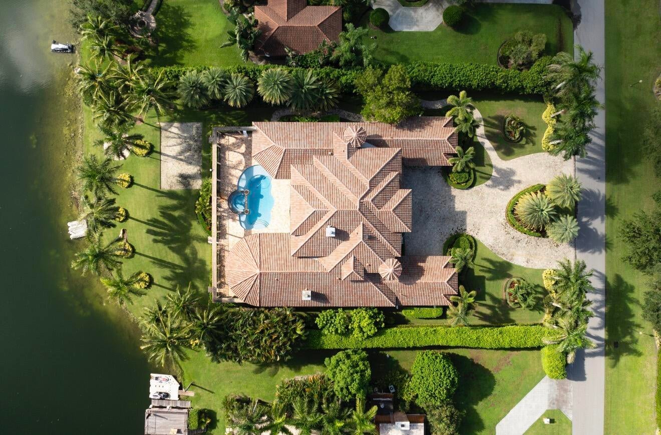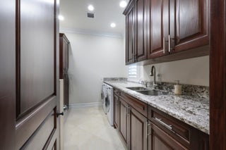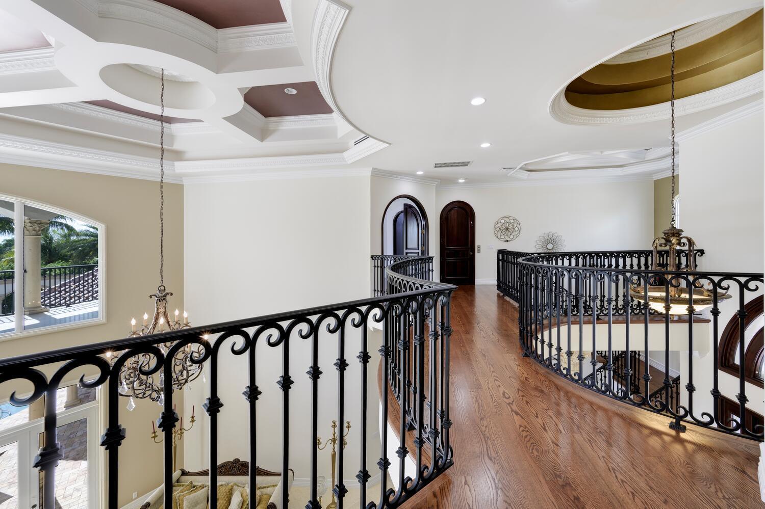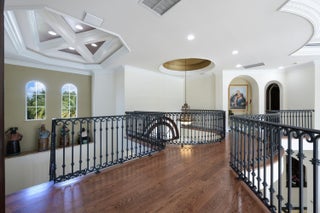 This stunning estate exceeds every expectation. A marble circular driveway leads to a grand foyer with 24'' Jerusalem Gold marble floors and a 30' atrium overlooking the pool and lake. The gourmet gas kitchen boasts Viking appliances, cherry cabinetry, Solaris granite, and a large prep island with rare Mystic sink. Enjoy the oversized family room with custom built-ins and seamless outdoor access. The primary suite offers a sitting area, dual walk-in closets, and spa bath. Outdoors, entertain with a full summer kitchen, bar, resort-style pool, and private sand volleyball court. Includes study, second master suite, cabana bath, dual garages, movie theater room, elevator, and upstairs media room with three ensuite bedrooms.