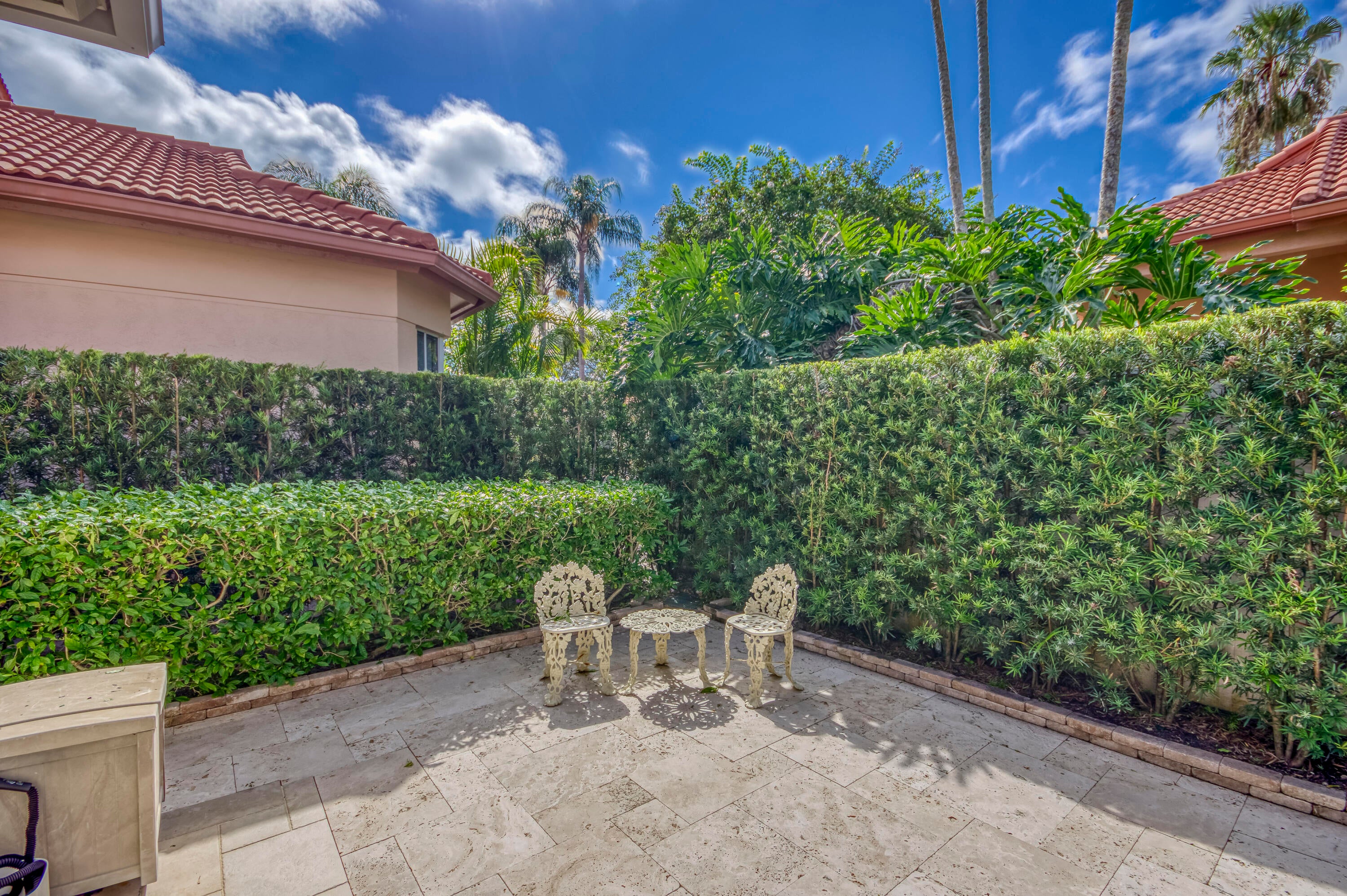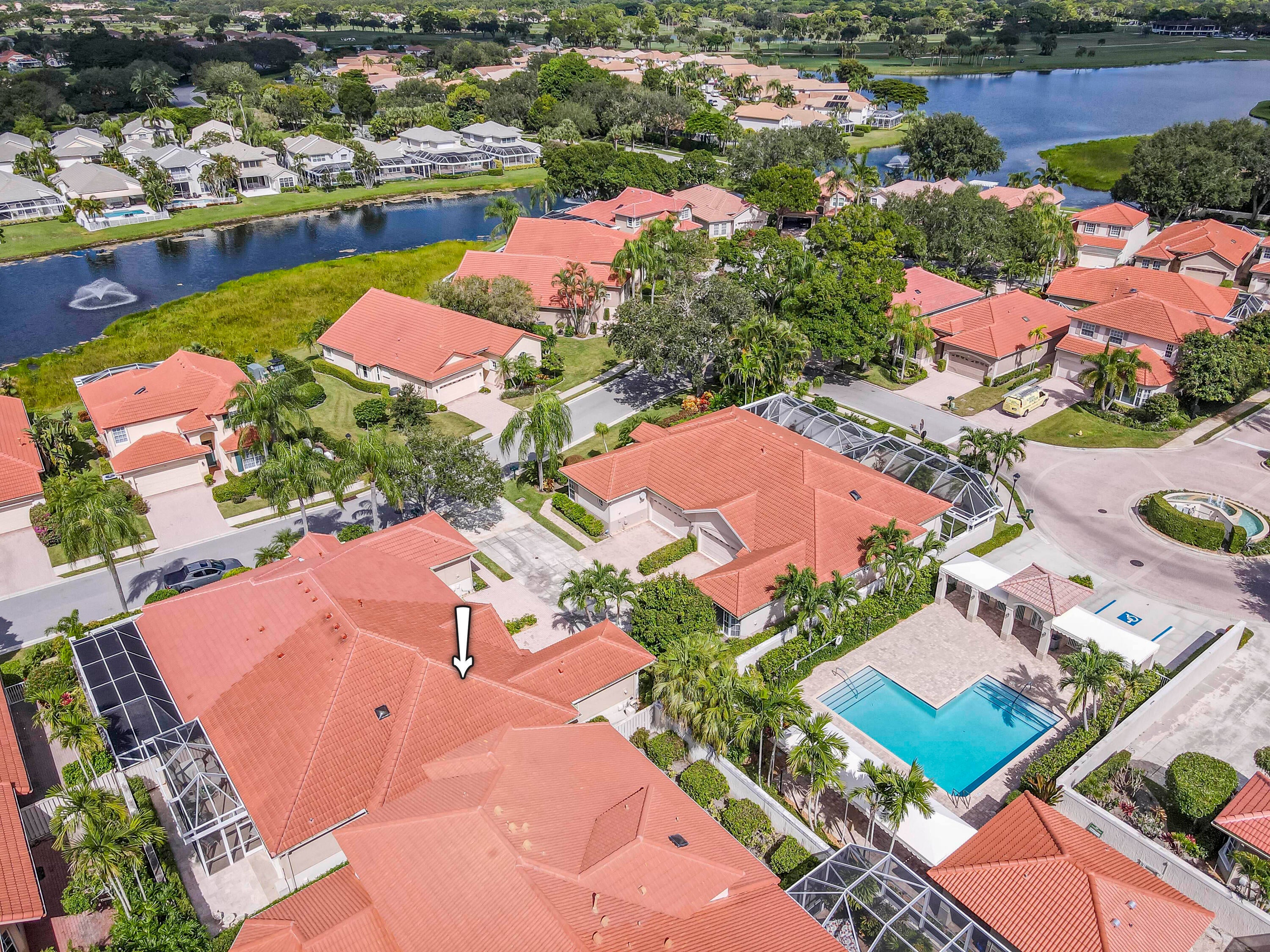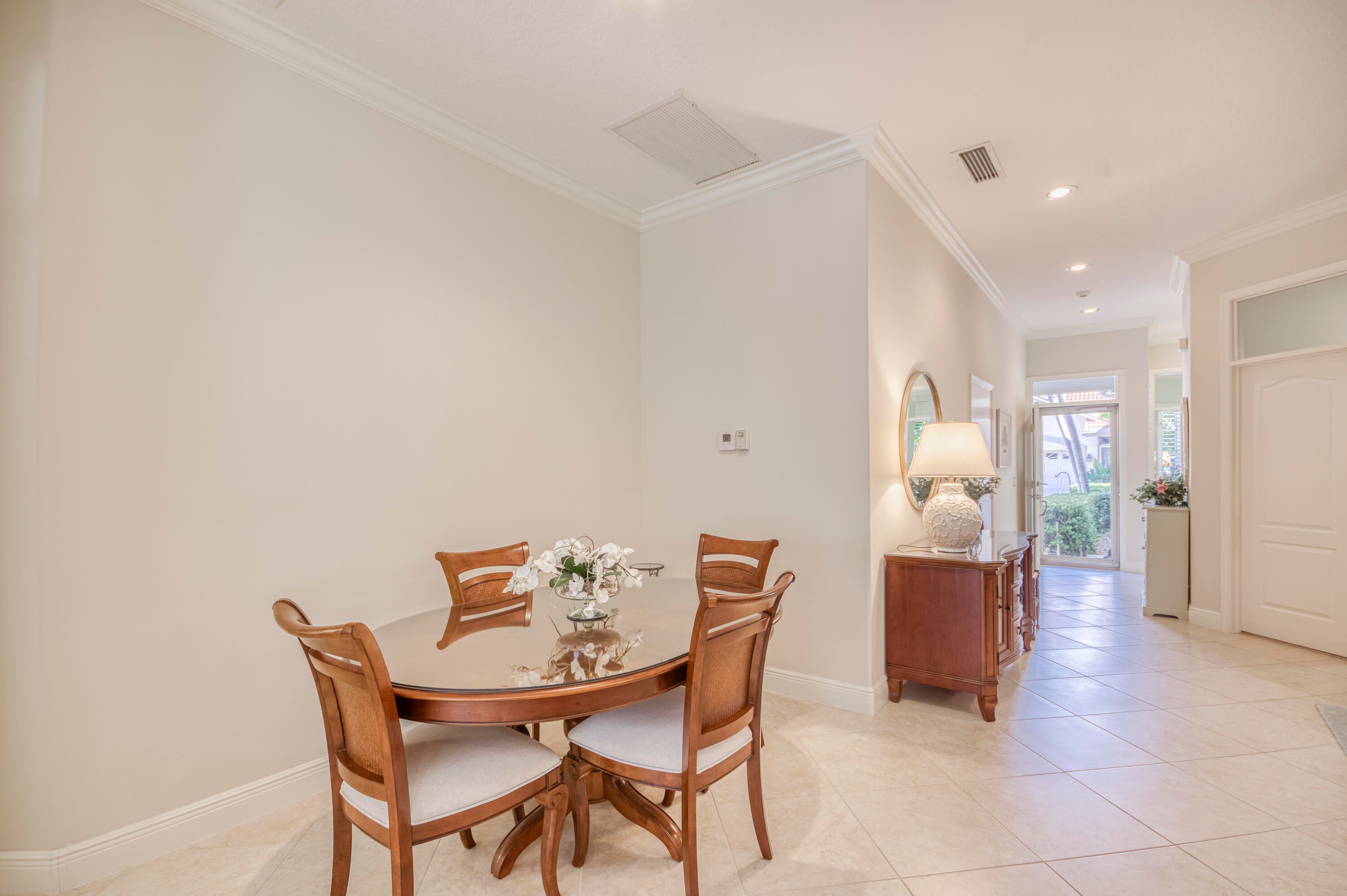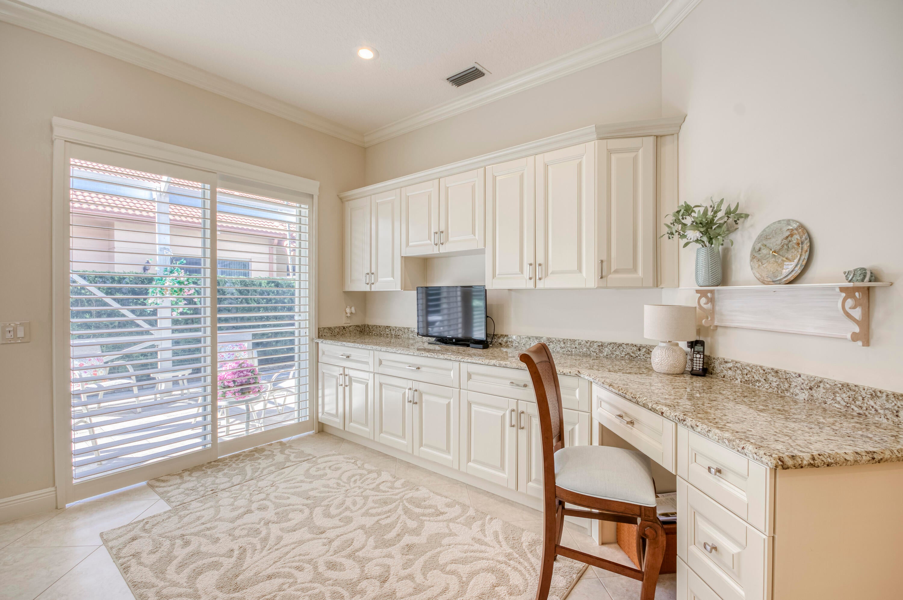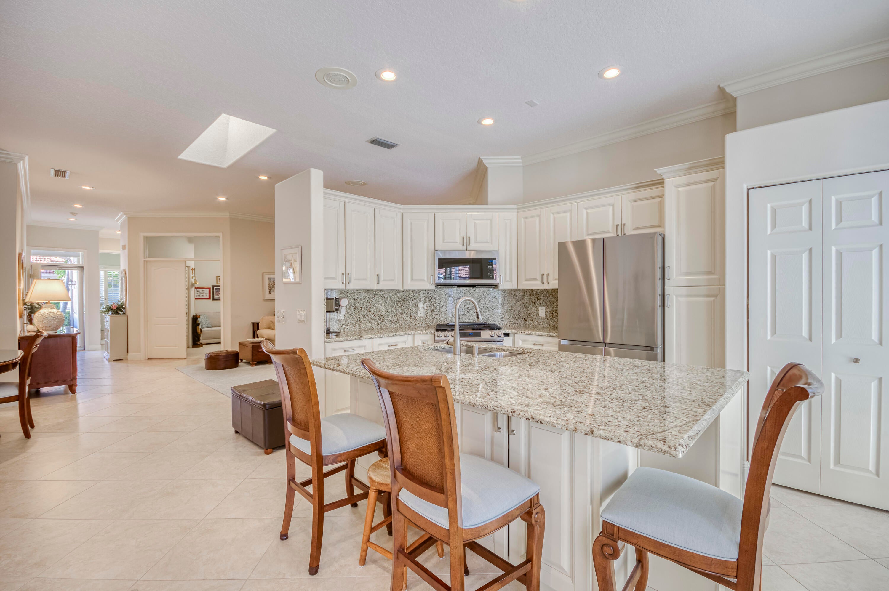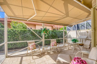 This bright and airy one-story CBS townhouse offers 3 bedrooms and 2 bathrooms within 1,620 sq ft of living space in the desirable Monterey Pointe subdivision of PGA National, Palm Beach Gardens. A soft neutral palette and light stone-look tile flow throughout the home, creating a welcoming and seamless ambiance. The spacious living room provides ample seating and entertainment space, enhanced by three plantation-shuttered windows and recessed lighting. Adjacent, the cozy dining room is bathed in natural light from a large skylight, ideal for intimate dinners or gatherings. The kitchen features ivory wood cabinetry with coordinating granite countertops and backsplash, a stainless-steel appliance package including a gas range, and an island snack bar with additional seating.Across from the kitchen, versatile upper and lower cabinets and a desk nook can function as a home office or coffee bar. The den offers flexibility as an office or guest room, highlighted by plush carpeting, three windows, and a large custom built-in desk/wall unit in an ivory satin finish. The primary suite serves as a serene retreat with direct access to the screened lanai, a spacious walk-in closet, and a large en-suite bathroom with dual vanities topped in ecru-toned quartz, a glass-enclosed shower, private water closet, and linen closet. Guest bedrooms are bright and tranquil, including one overlooking the front garden through a shuttered bay window. Outdoor living is enhanced by a screened lanai accessible from the kitchen and primary bedroom, complete with a roll-out awning for shade, as well as an open patio enclosed by lush hedges, perfect for dining or entertaining. Additional features include a roof replaced in 2022, A/C replaced in 2022 with a bi-yearly maintenance contract, hot water heater replaced in 2024, washer/dryer replaced in 2023, kitchen appliances replaced in 2021, a whole-house Halo air filter, and a whole-house water filtration/softener system.