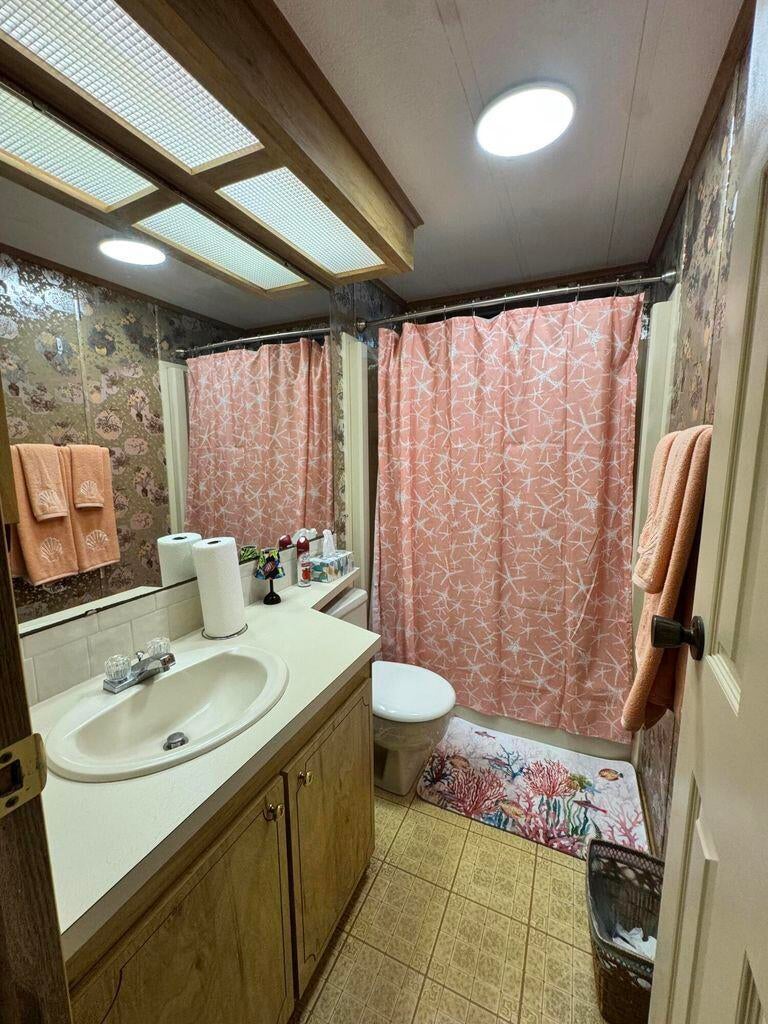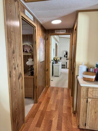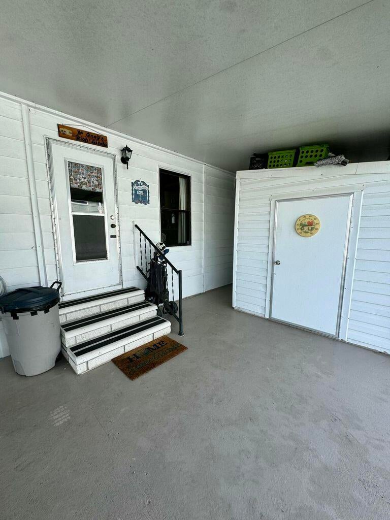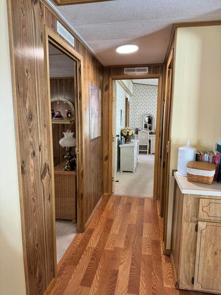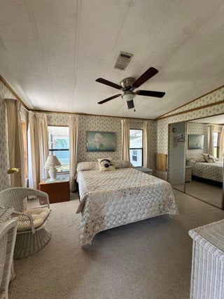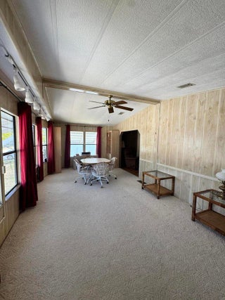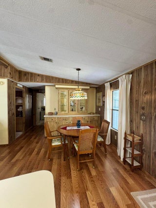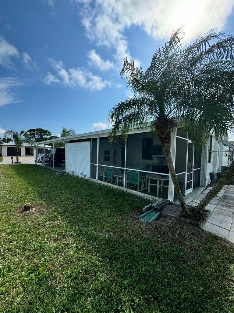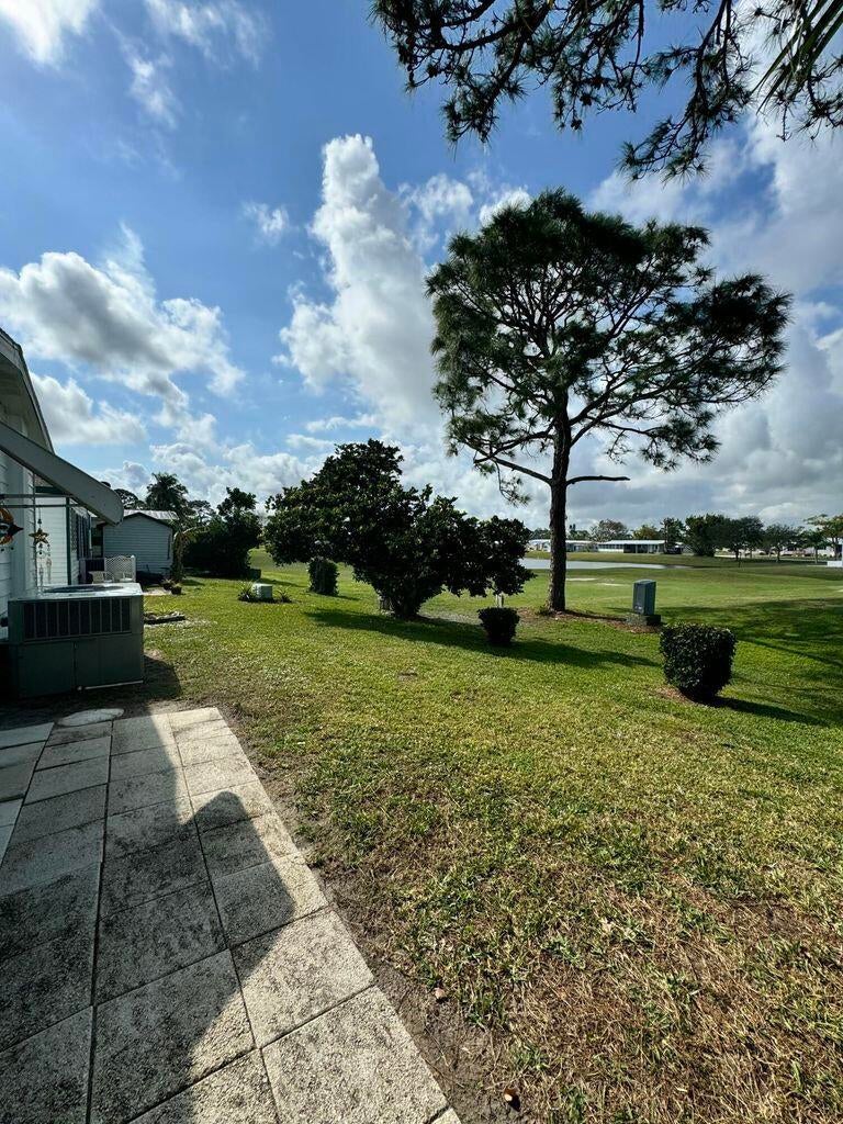 Lovely golf course view home. 2-bedroom, 2-bathroom in the desirable 55+Spanish Lakes Country Club Village community. NEW ROOF 2025. Newer A/C unit, 2023 4-ton with heat pump. The home has an open kitchen and built-in shelves in the dining area. Laminate and carpet floors. Front room with lots of natural light. Washer and Dryer 2025. Home is being sold furnished. Brand-new TV in the living room. Screened-in patio overlooking the 2nd hole. Great spot for morning coffee or evening cocktails. Lawn care and trash removal are included in the lot rent. The community features two pools, tennis, pickleball, bocce ball, and shuffleboard. Clubhouse and much more.