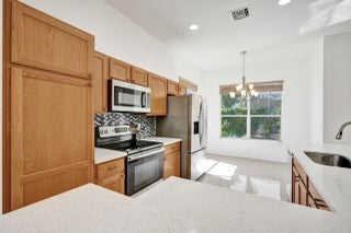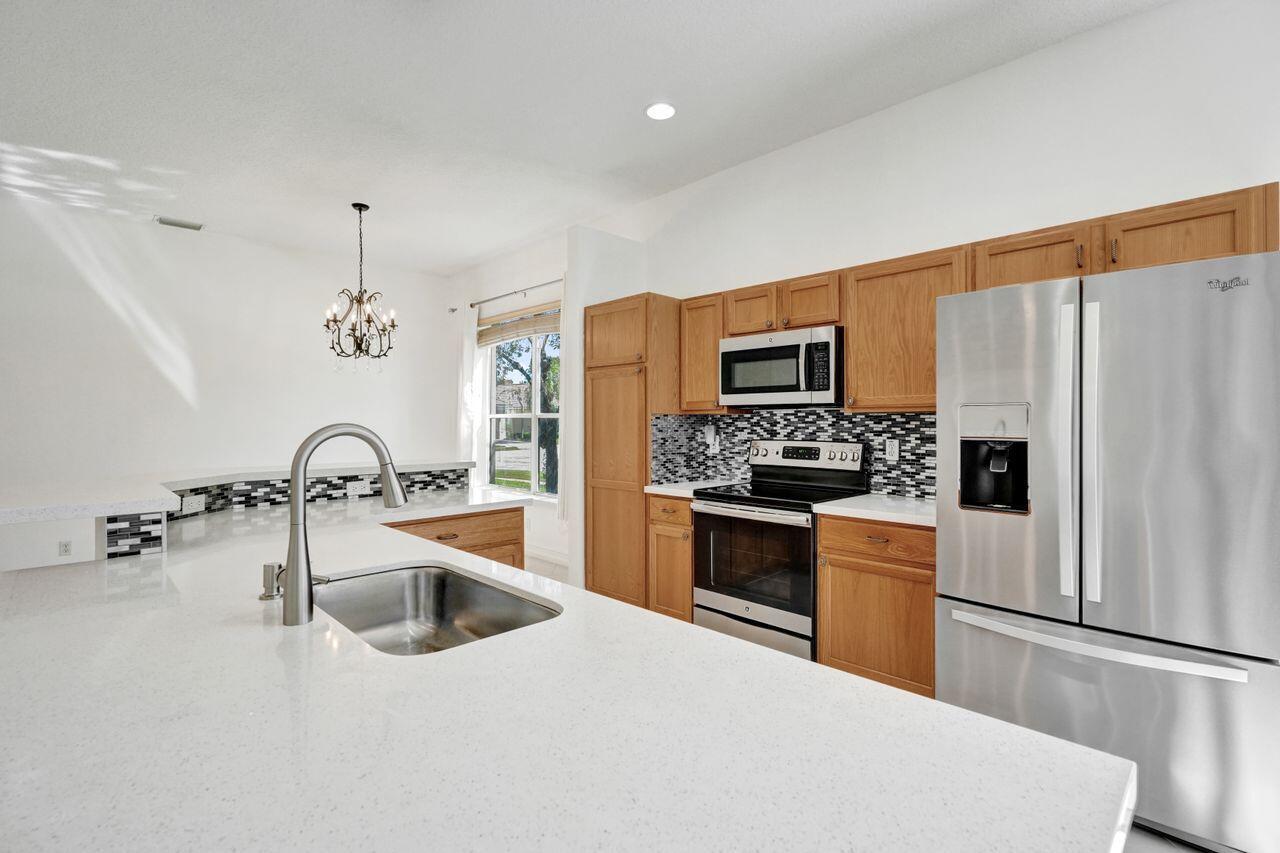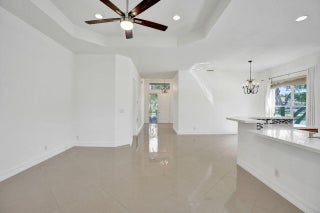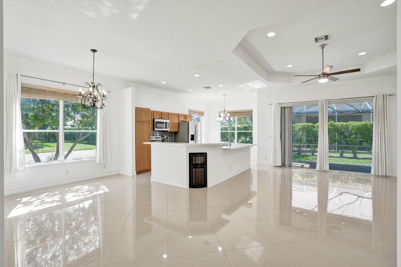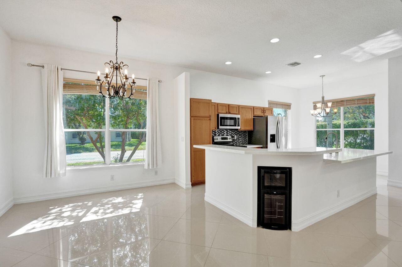Easy living in this 2 bedroom, plus den, single family home in the beautiful community of Andros Isle. With a freshly painted interior, this home features custom lighting, updated marble tile flooring in main living areas and is move in ready. The kitchen has bountiful counter space for preparing gourmet meals and a built in wine cooler for those that enjoy wine and features Quartz countertops and stainless steel appliances that provide easy care and maintenance. The primary bath has been updated and includes a soaking tub and separate shower. Situated on a corner lot in the desirable community of Andros Isle, the low monthly dues provide amenities including 24/7 guard gate, clubhouse, lawn care, WiFi, CaTV, monitored security, pool, tennis, gym, basketball, play area and so much more.