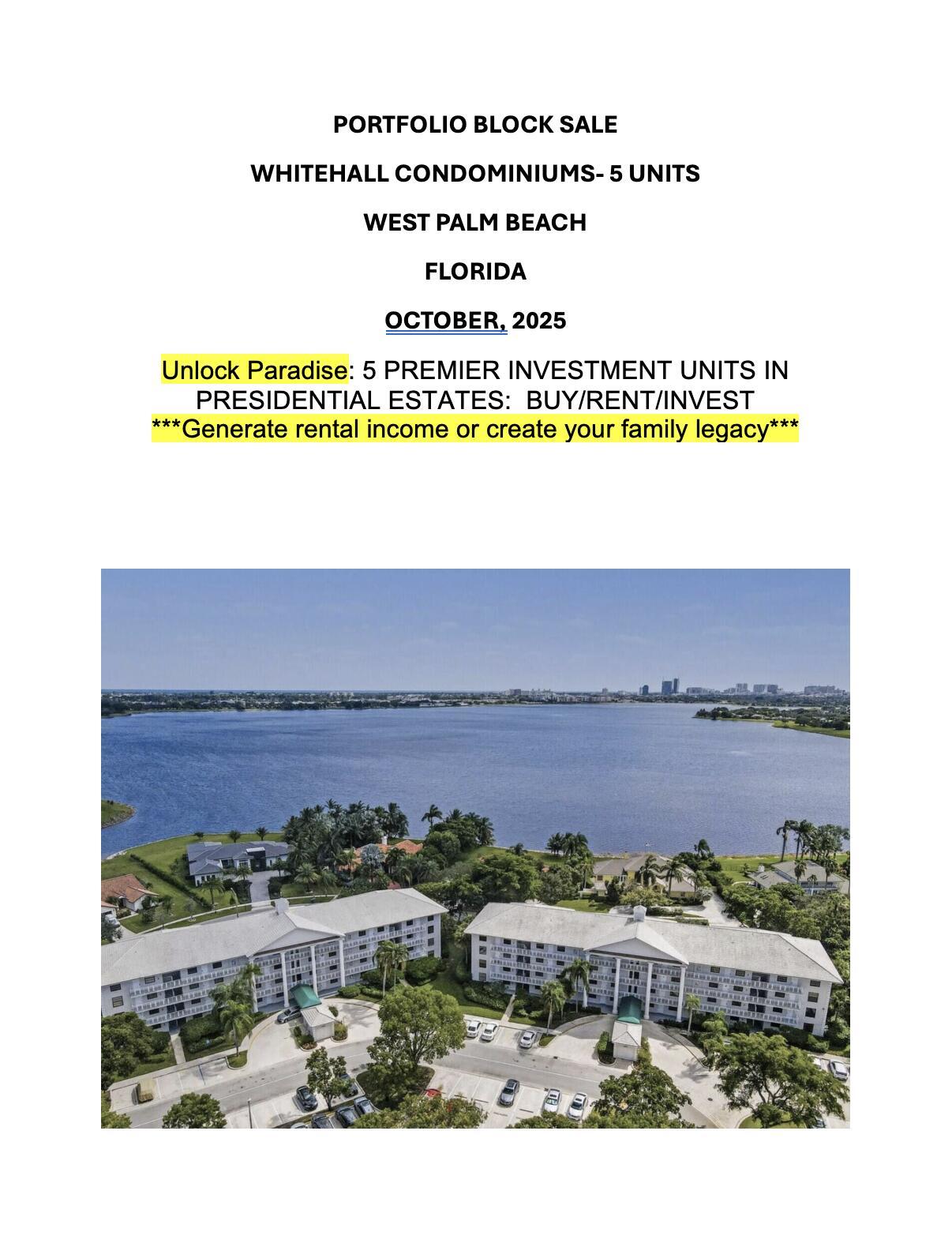 BLOCK SALE: Unlock Paradise: FIVE (5) PREMIER INVESTMENT UNITS IN PRESIDENTIAL ESTATES: Average CAP RATE: 6.17%. BUY/RENT/INVEST***Generate rental income or create your family legacy***UNIT #2: AMAZING PENTHOUSE UNIT IN GATED COMMUNITY 2BA/2BA, BONUS ROOM FOR OFFICE SPACE, & IN UNIT LAUNDRY WITH STORAGE'' Apartment is located In the heart of West Palm Beach, in Land Of The Presidents. This apartment is central to all that Palm Beach has to offer. Next to Dutchman's Pipe, Jack Nicklaus Golf Course, with ''No Mandatory Membership'', Two (2) large bedrooms, two (2) bathrooms, plus an additional room that could be used as a home office or storage. Plenty of parking for you and your guests, with plenty of natural light and a beautiful view of the Clubhouse with swimming pool. Located in a 24hr manned gated community of Million Dollar homes on Embassy Drive and next to the Palm Beach Outlets Mall with plenty of shopping, Whole Foods, Starbucks, Target, Home Depot etc... Please see below more nearby destinations. PBI International Airport The Breakers Rosemary Square / City Place Palm Beach Outlets Lake Worth Beach Norton Museum Flagler Museum P.B. Maritime Museum Surfing Fl. Museum Delicious Restaurants Plenty of Shopping Wellington, FL Polo Fields - Equestrian jumping MLB - Houston Astros & Washington Nationals Minor League Baseball teams in state of the art complex.