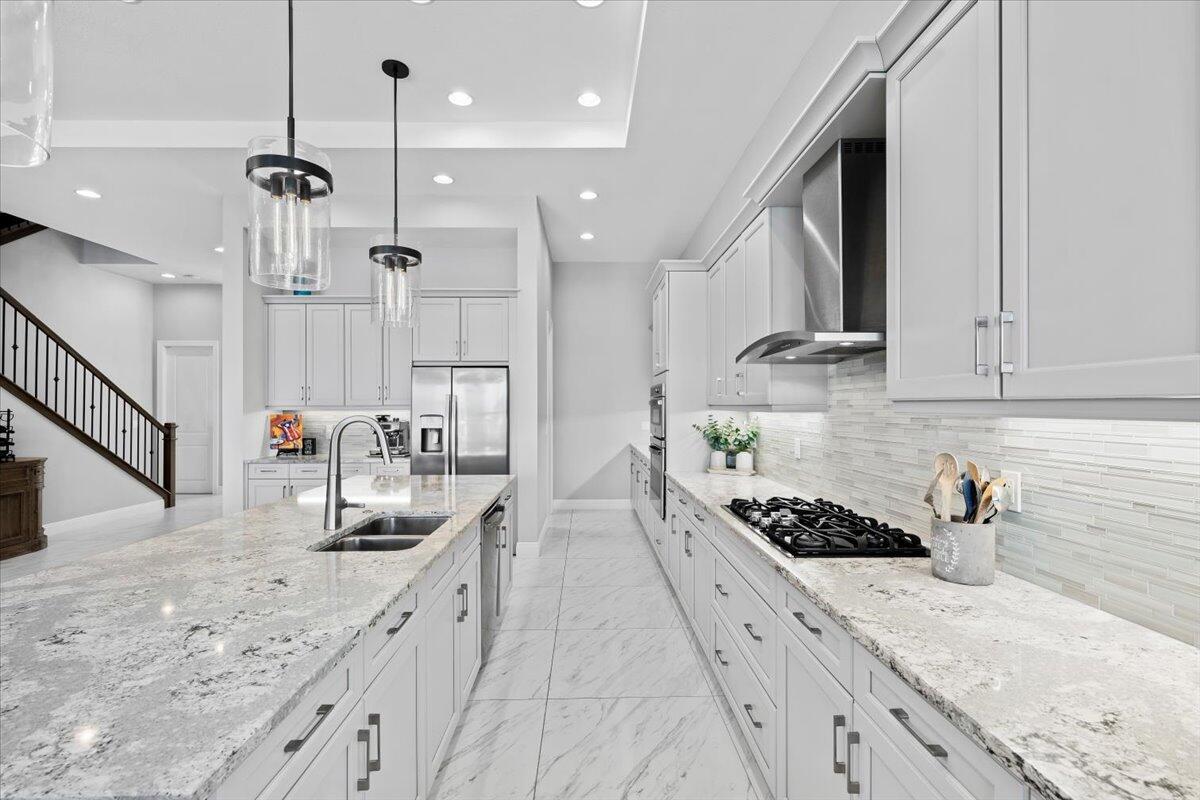 Highly upgraded Mondrian model with an oversized pool, impressive lake views and a custom outdoor kitchen and covered entertainment area with drop down screens. The master bedroom and den are conveniently located on the first level of this home with two guest suites and a huge loft upstairs. The oversized 3 car garages include the extra square footage option that allows room for 3 vehicles plus plenty of storage. Real wood flooring adds visual warmth to the master suite where you wake up overlooking the pool and lake. Located in the center of the community as well as the center of the lake, this backyard features the best views Artistry has to offer. Finishing touches include plantation shutters, light fixtures, high end built in master closet and a heated pool and spa.