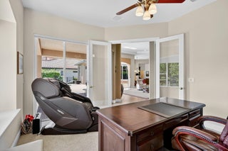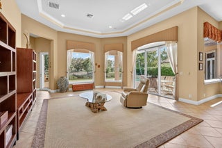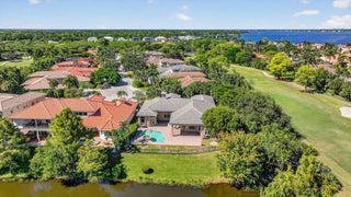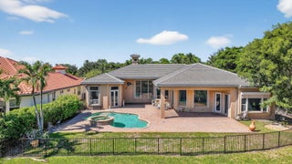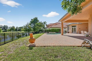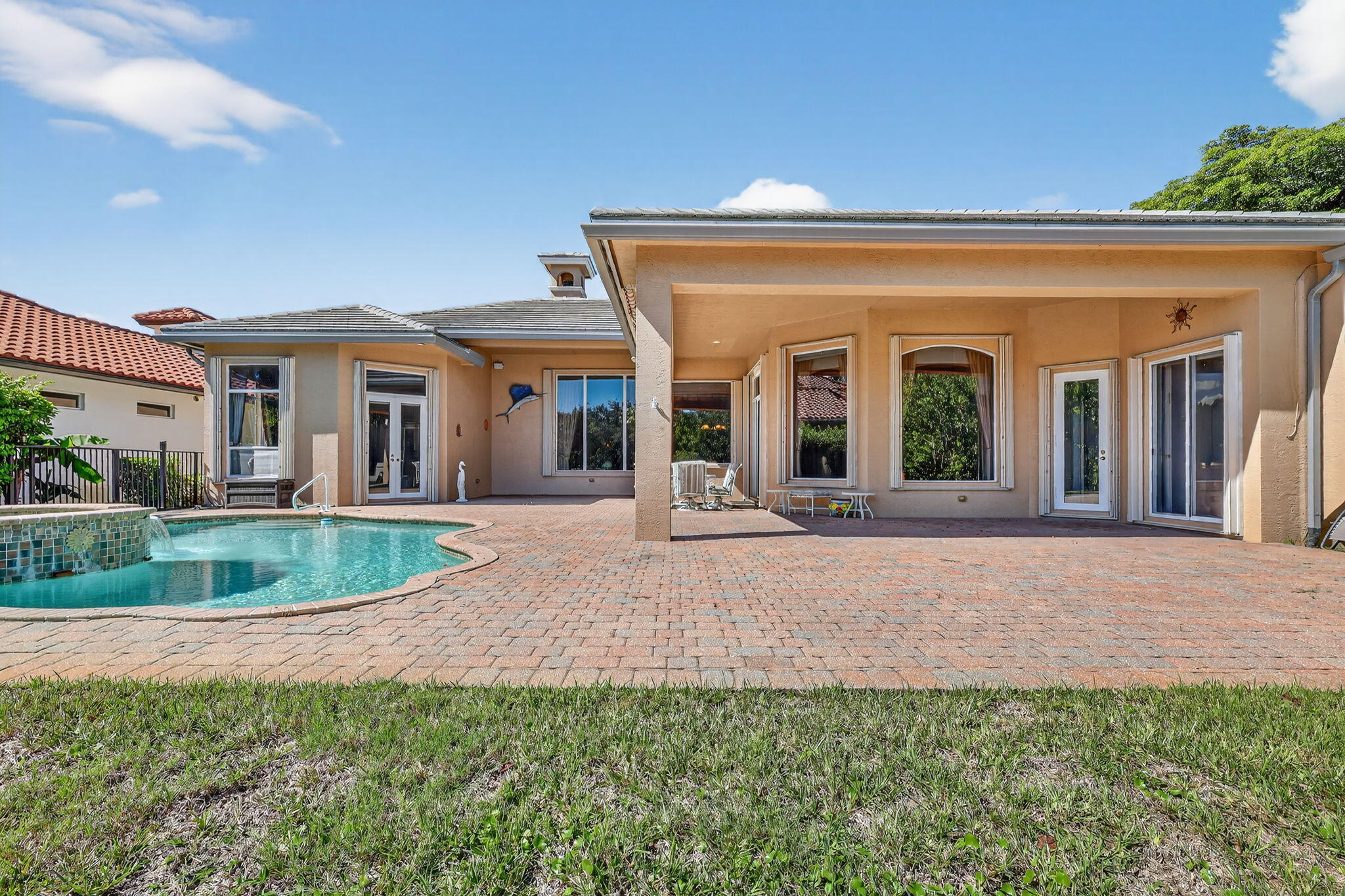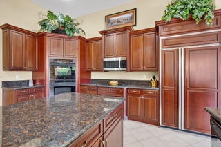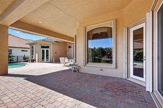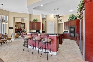 With over 3600 sq ft, this 1-story Toll Brothers built home boasts 4 bedrooms, 3.5 baths along with a den/office. New roof in 2023. Whole house generator, Enjoy a wonderful chef's kitchen with double islands, Butler's bar, granite, ample counter seating as well as eat-in breakfast area. Entertain formally in the living and dining room or casually under the large covered patio with outdoor pool overlooking an expansive lake view with golf course beyond. Tucked on a cul de sac, privacy with panoramic water describes the views. Whether a golfer or boater, Palm Cove has what you want. A newly renovated golf course (membership not mandatory) or 93 slip marina, with boat slips available for purchase. If that's not enough, the clubhouse has fitness center, heated pool, tennis courts,playground and social activities galore!! Come live the dream at Palm Cove