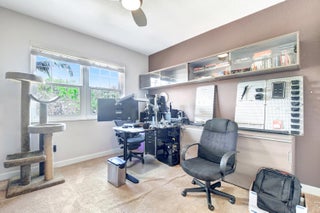 Step into a luminous two-story residence nestled in a gated community. The first floor features formal living and dining rooms, a bright, open family area, a modern kitchen, and a guest bedroom with full bath. Upstairs, four spacious bedrooms and a laundry room await. The primary suite offers dual walk-in closets, dual sinks, a Roman tub and separate shower. Outside, enjoy a private tropical garden setting with mature fruit trees and green foliage, all under a canopy of natural light.