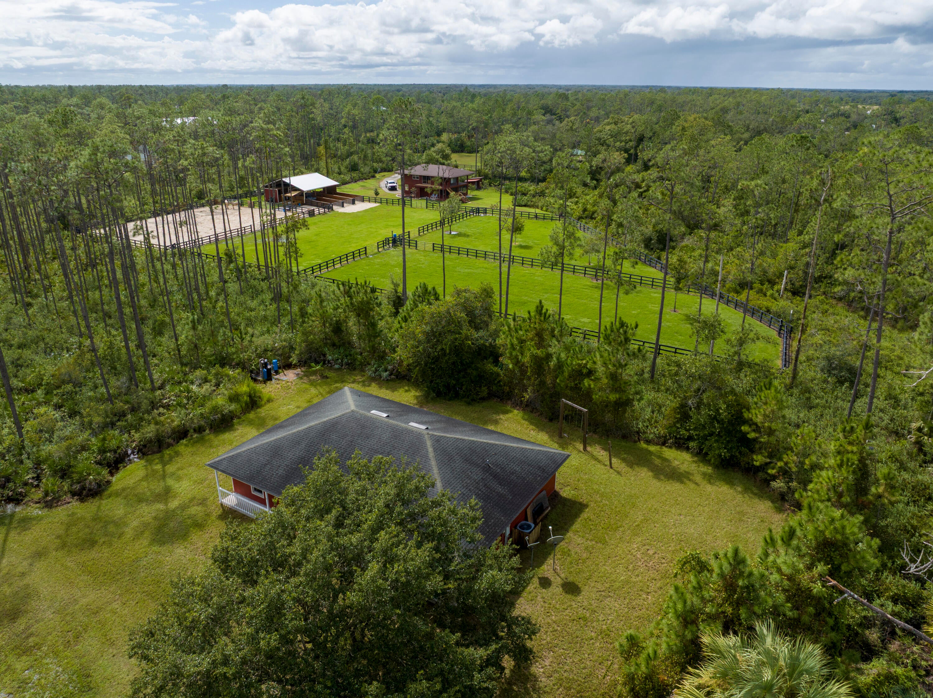 Your 2.53-acre country retreat awaits at the exclusive Indian Hammock Hunt & Riding Club. Tucked among lush, mature native trees, this freshly painted three-bedroom, two-bath home offers the perfect escape into nature. From the welcoming front porch, enjoy the peaceful sights and sounds of deer, wild turkey, quail, and even horses nearby.Inside, the home has been thoughtfully updated with brand new kitchen appliances, including a stove, refrigerator, and dishwasher, along with new windows, a new A/C thermostat, and a new water softener system and pump. Move-in ready and surrounded by serenity, it's the ideal blend of modern comfort and natural beauty.For guests, two charming cottages provide inviting accommodations for weekend visits. Horse lovers will appreciate thestalls and space for their four-legged companions to share the country lifestyle. Set within a private, gated community spanning over 3,600 acres, with 2,400 acres preserved as pristine conservation land, Indian Hammock offers an unparalleled array of amenities designed for those who love the outdoors. Residents enjoy access to a private airstrip for small aircrafts, trap and skeet ranges, rifle and pistol facilities, and a five-stand shooting area. The community also features a heated swimming pool, fitness center, and a beautiful clubhouse with a restaurant and private event space, along with tennis and pickleball courts, RV parking, guest cabins, stables, and a full equestrian arena with miles of scenic riding trails. All amenities are exclusively for members and their guests, creating a secure, welcoming environment. Just an hour and a half from Palm Beach County, Indian Hammock is more than a home, it's a lifestyle and the perfect weekend getaway.
