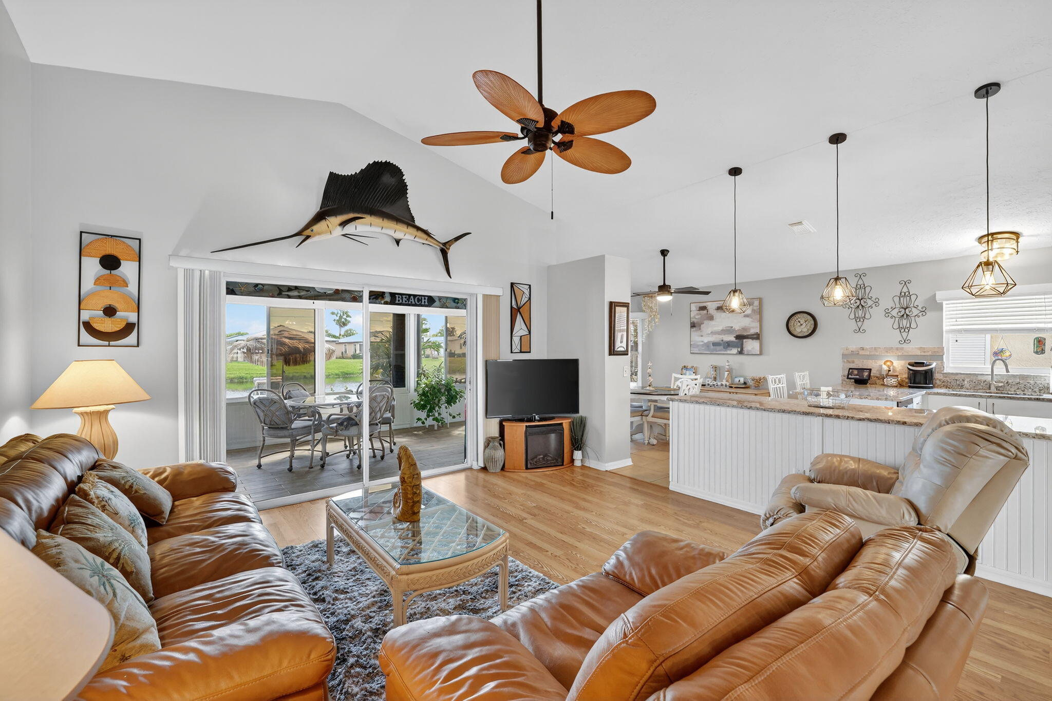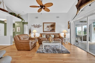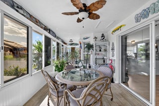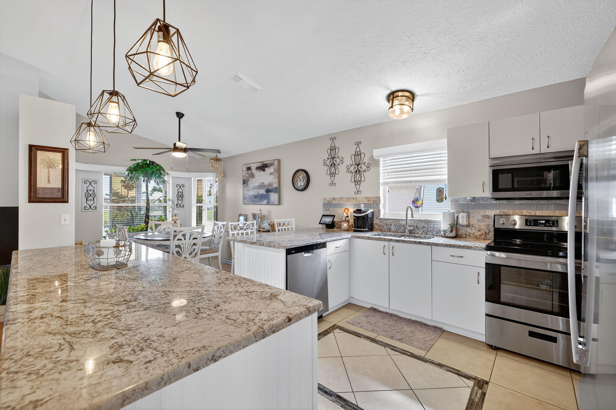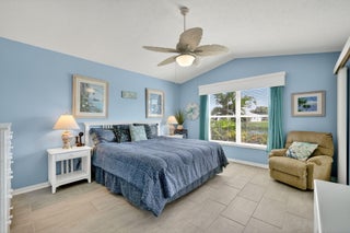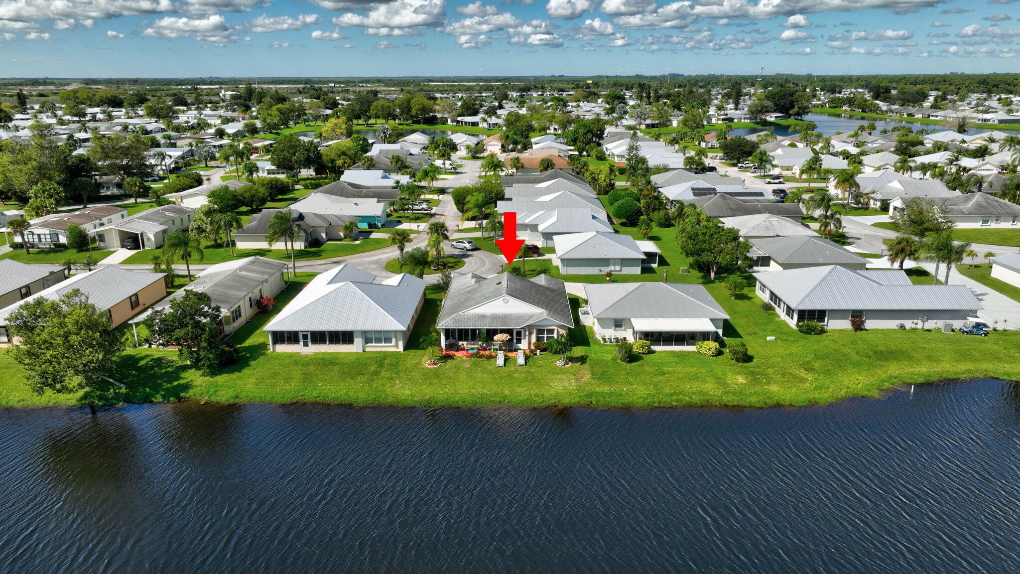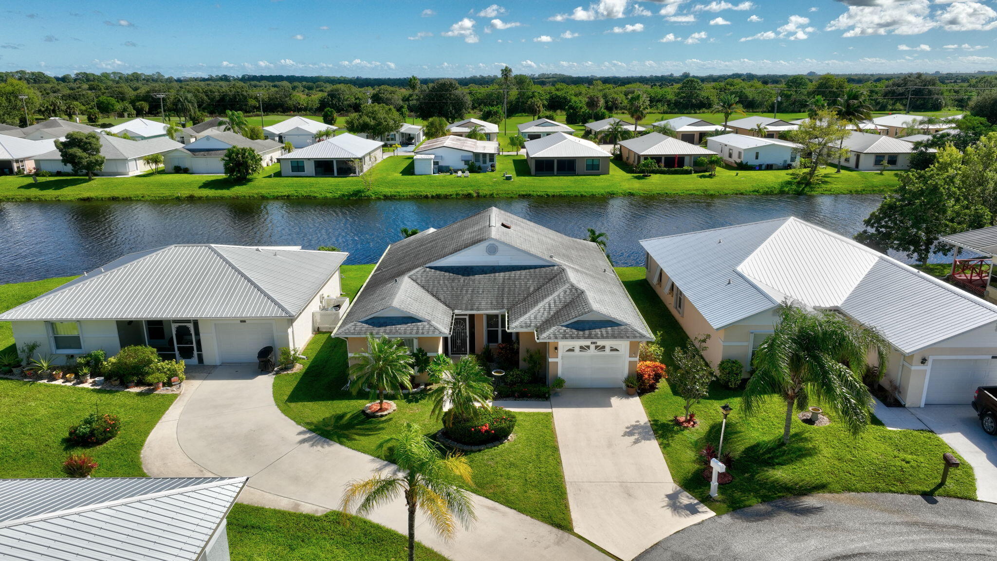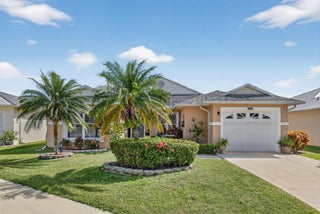 Beautiful lake view 2-bedroom 2-bath home. This home is located in the 55-plus Spanish Lake Fairways community. This community is a LAND LEASE community. The home features an open kitchen with granite countertops and white cabinets, accompanied by newer appliances. The kitchen overlooks a spacious living room and dining area. The primary suite has two closets. One is a walk-in closet. The home has laminate and custom tile throughout, no carpet. A lake view is visible from the living room, kitchen, and primary suite. The house is beautifully landscaped and situated on a private cul-de-sac. The home features accordion shutters for added protection against storms. The land lease includes trash removal, lawn care & amenities: private golf course, pickleball, tennis, and shuffleboard. Must