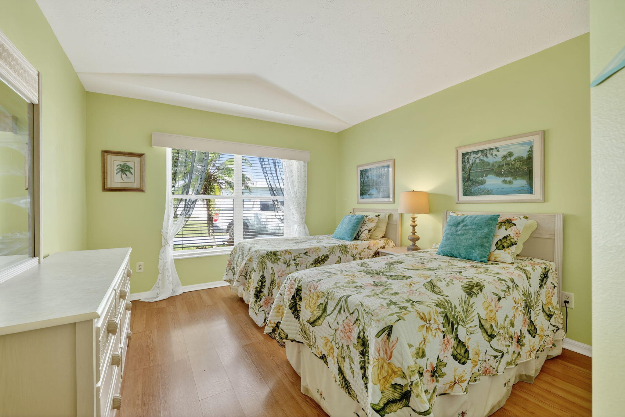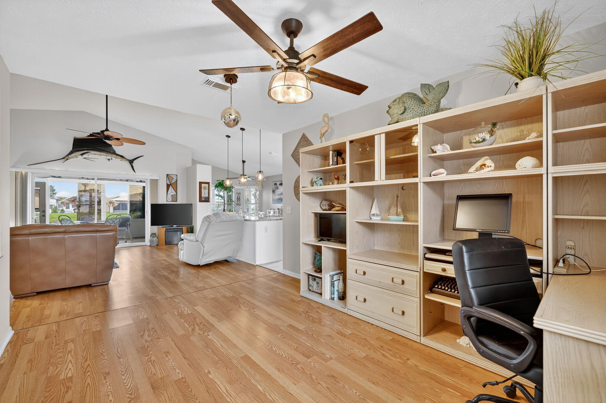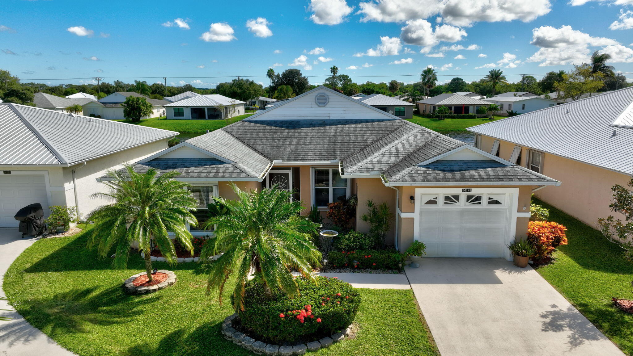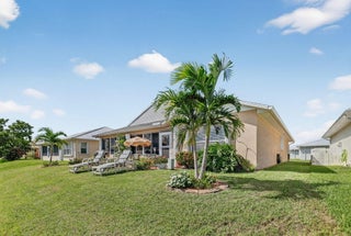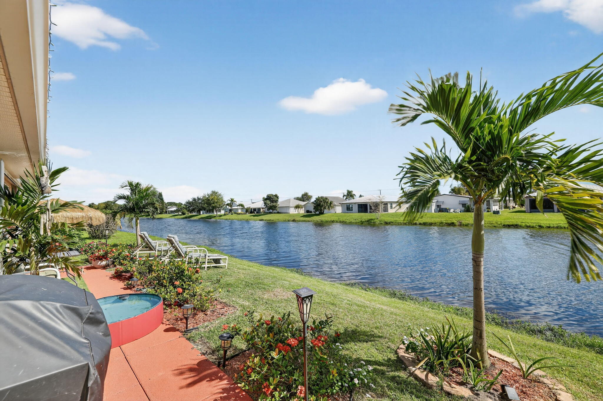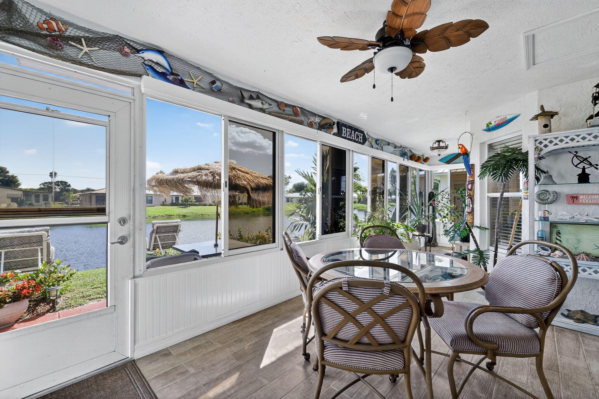 Beautiful lake view 2-bedroom 2-bath home. This home is located in the 55-plus Spanish Lake Fairways community. This community is a LAND LEASE community. The home features an open kitchen with granite countertops and white cabinets, accompanied by newer appliances. The kitchen overlooks a spacious living room and dining area. The primary suite has two closets. One is a walk-in closet. The home has laminate and custom tile throughout, no carpet. A lake view is visible from the living room, kitchen, and primary suite. The house is beautifully landscaped and situated on a private cul-de-sac. The home features accordion shutters for added protection against storms. The land lease includes trash removal, lawn care & amenities: private golf course, pickleball, tennis, and shuffleboard. Must