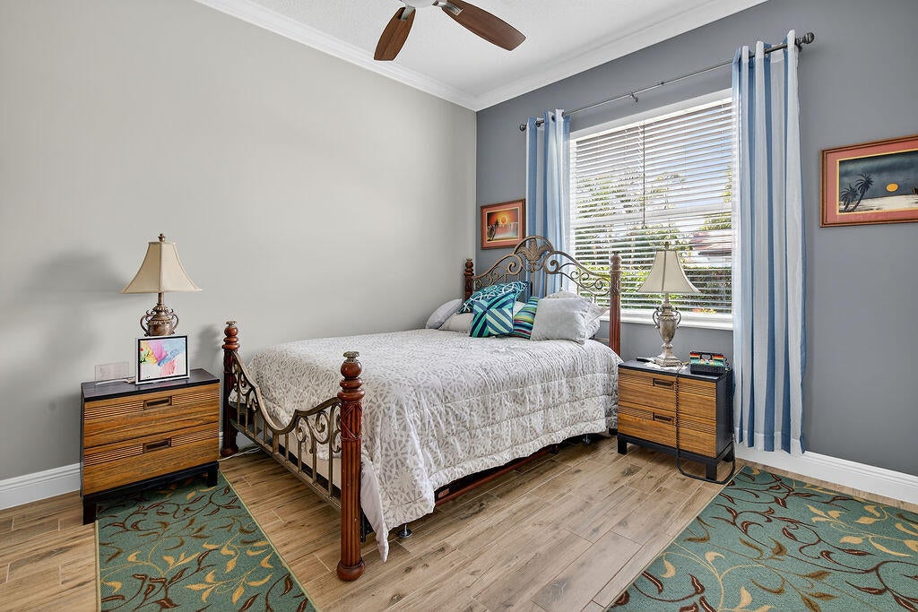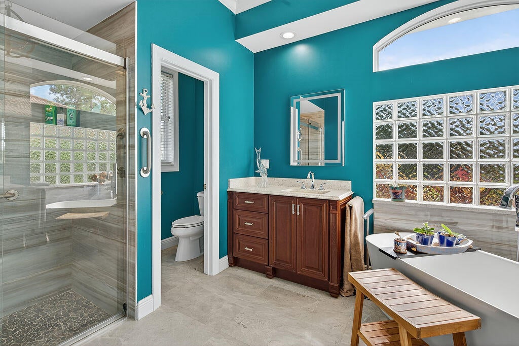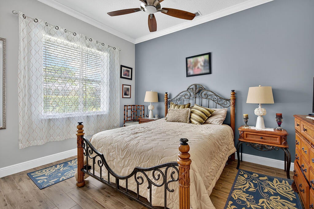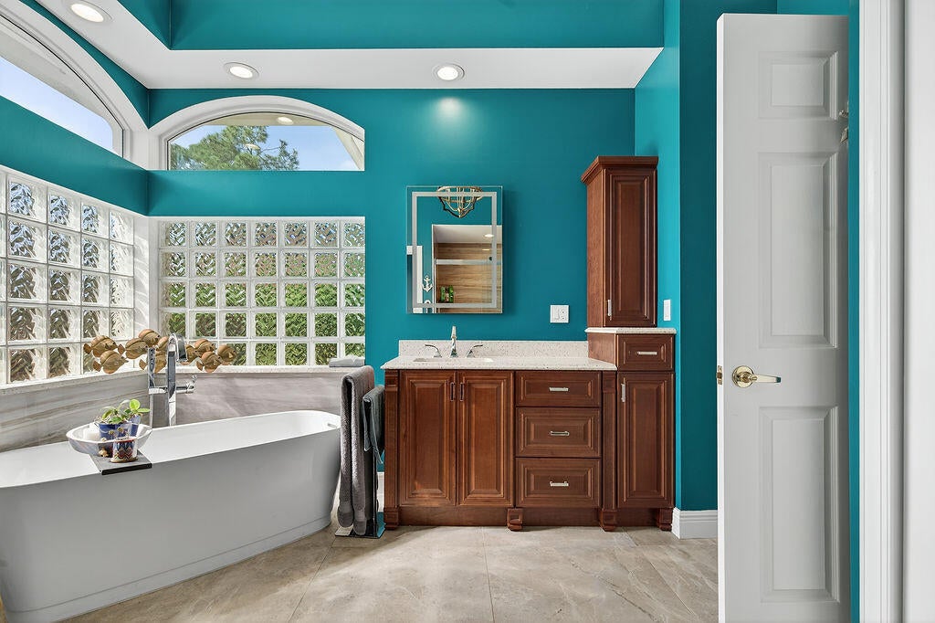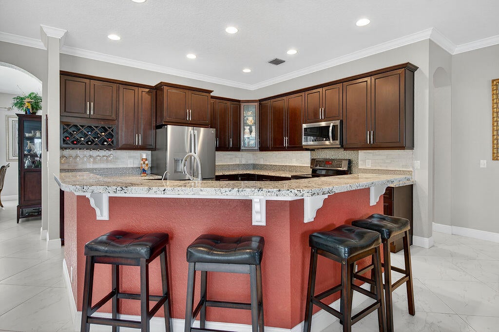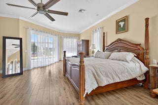 Fabulous move-in ready 5 BR + office, 4.5 BA home with pool on a stunning 1 acre lot in Bayhill Estates. This one story home offers 3,600 SF of living space with a split floor-plan and magnificent views of the18th hole of the PGA Estate Course and a sparkling lake. Generously sized rooms and 24'' porcelain tile give the home a modern feel. The updated kitchen opens to the family room and breakfast area, all overlooking the tranquil lanai and golf course. Large primary suite with 2 walk-in closets and luxurious renovated bathroom. All other bathrooms have been renovated as well. The outdoor living is just as stunning as the interior with a pool with lanai that was replaced in 2015, lush landscaping and lighting and plenty of yard space beyond.