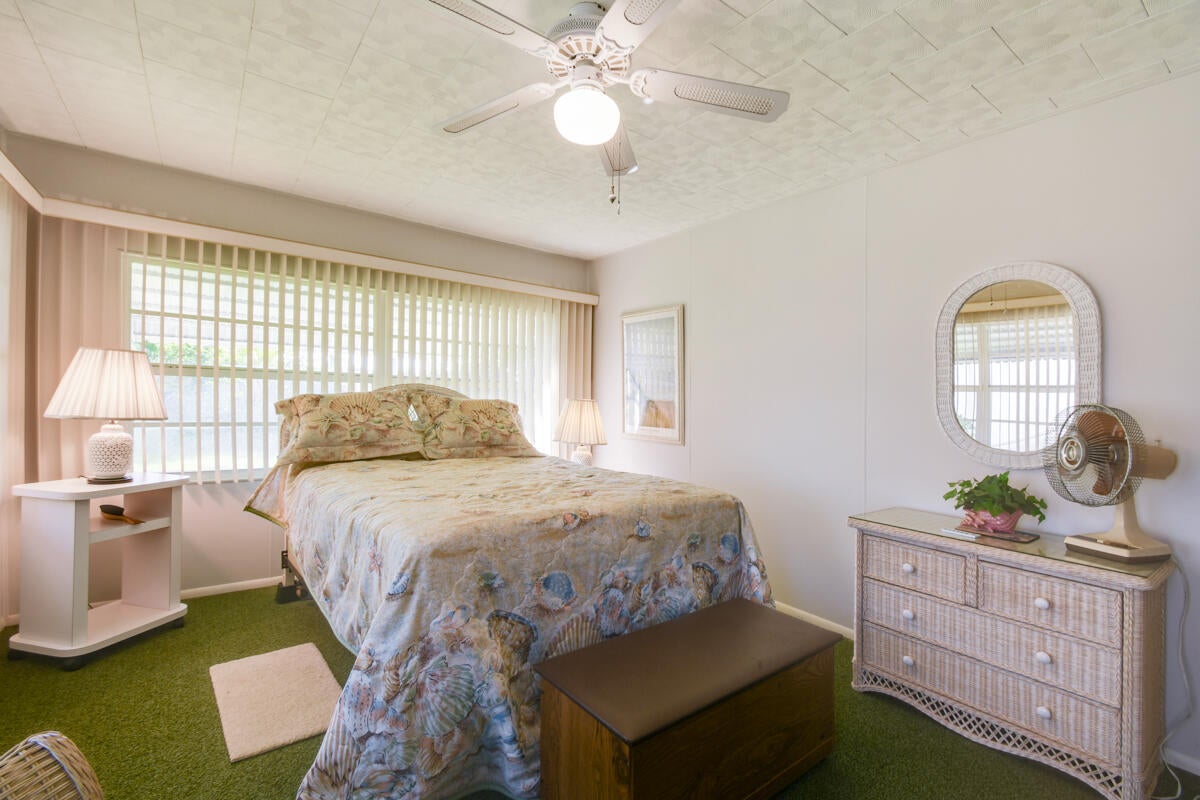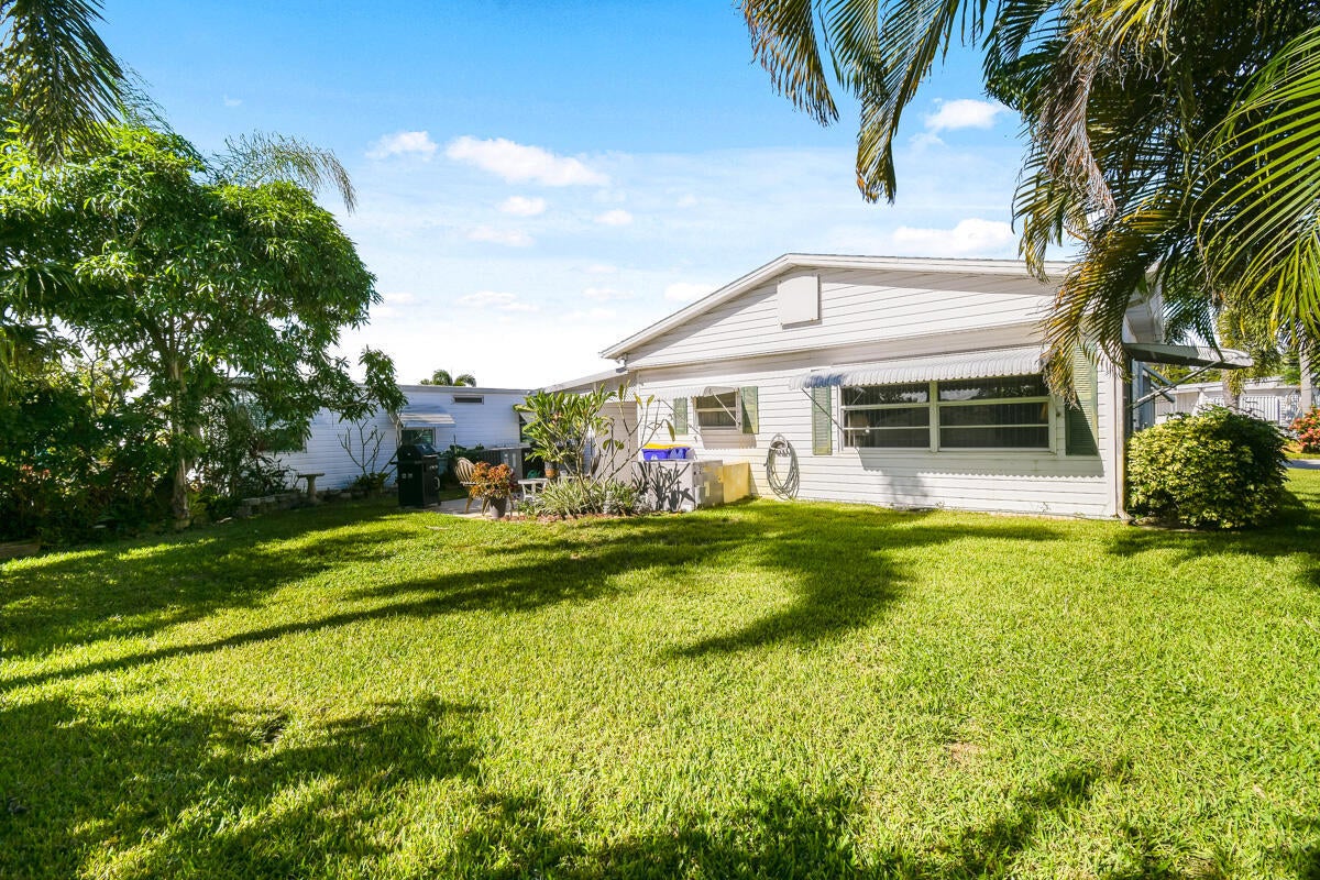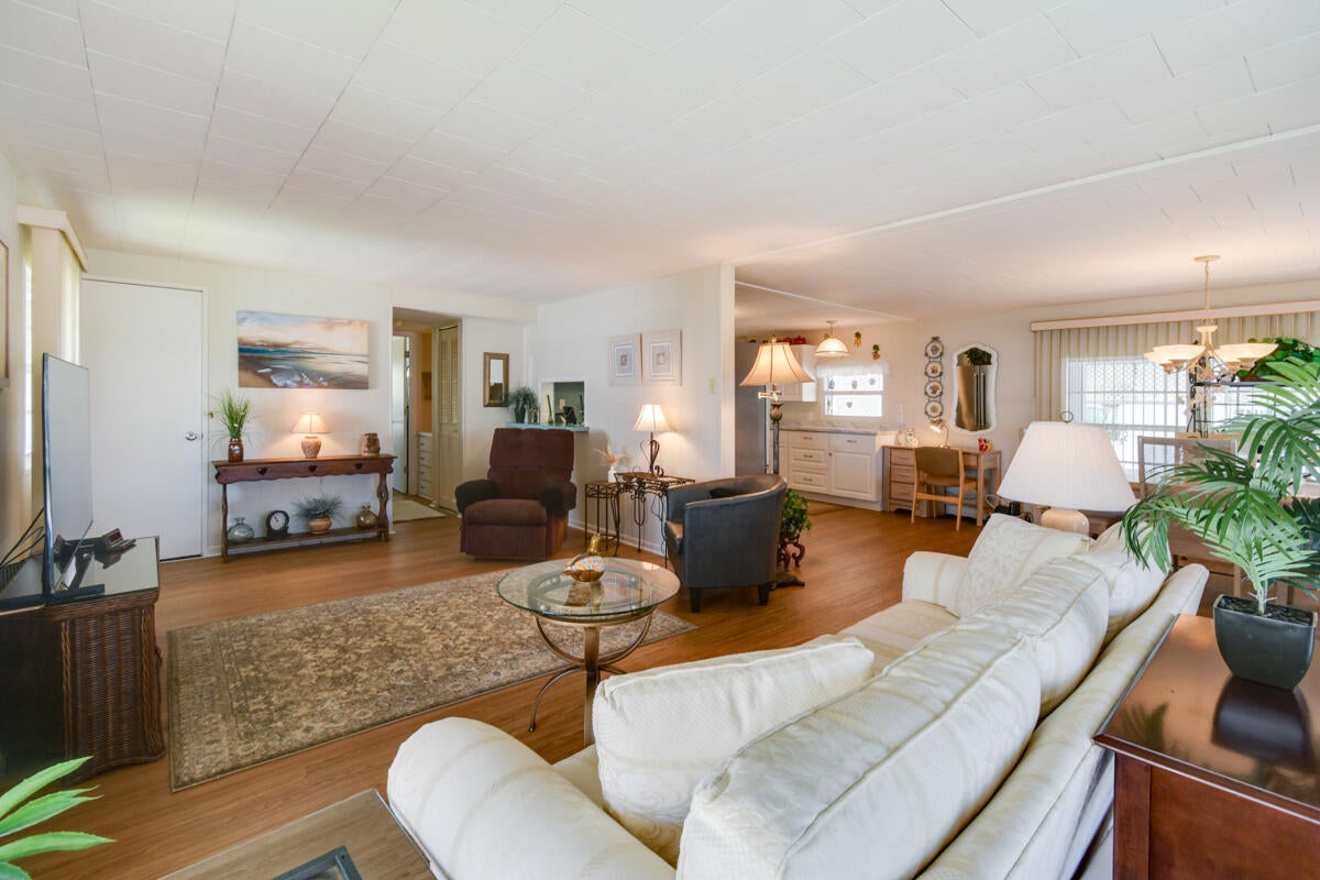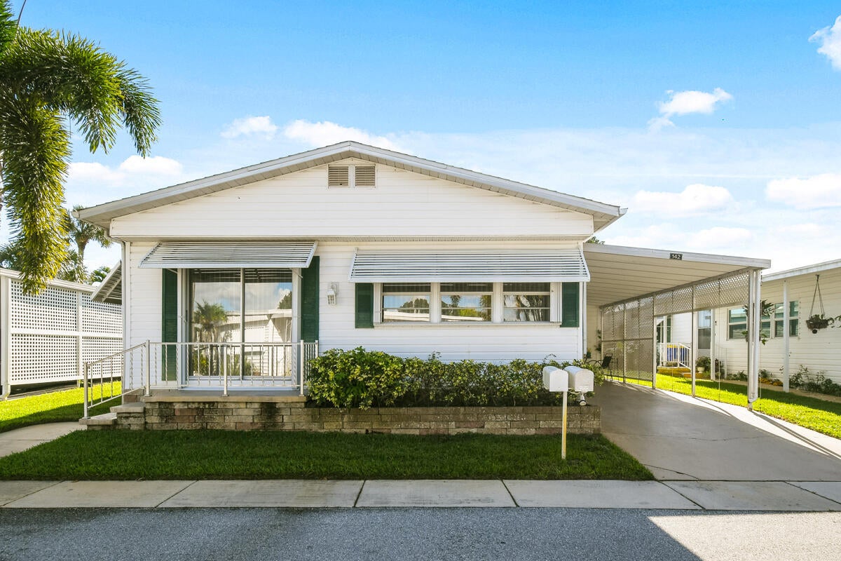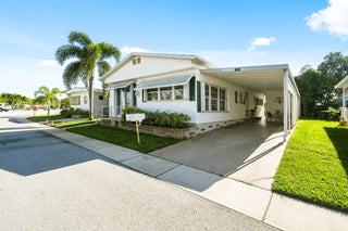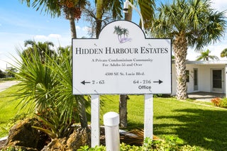 Move-In Ready! Spacious & well-maintained 2-bedroom, 2-bath mobile home in the highly sought-after Hidden Harbour 55+ community. This fully furnished home features a bright open floor plan with laminate flooring in main areas & carpet in bedrooms. Enjoy a large living room, dining area, & functional kitchen layout. The enclosed carport adds privacy & usable space, & the backyard features an open patio plus an attached storage building with washer & dryer. Updates include a new A/C (2020) & accordion hurricane shutters (2022). Community amenities: Clubhouse with pool, shuffleboard, community room, marina access (fee/availability), & on-site manager. Monthly fee includes: Basic cable, water, sewer, lawn care, trash, & use of recreational facilities.Buyer requirements: No rentals or pets allowed. Buyer must complete application, background check, & interview for approval. Close to beaches, golf, parks, dining, & morethis home offers easy Florida living in a vibrant, active community.