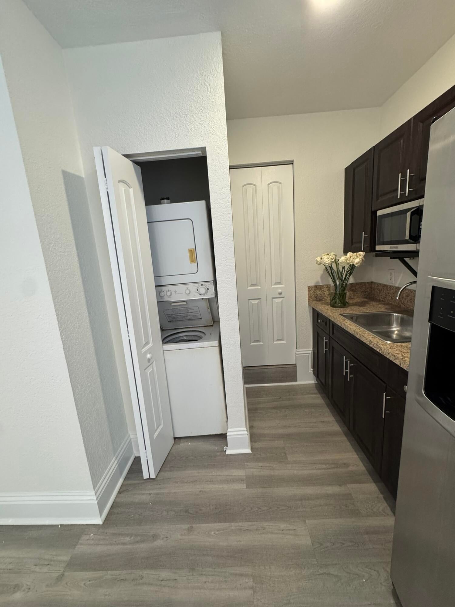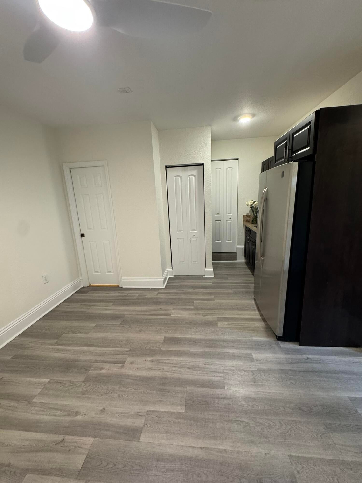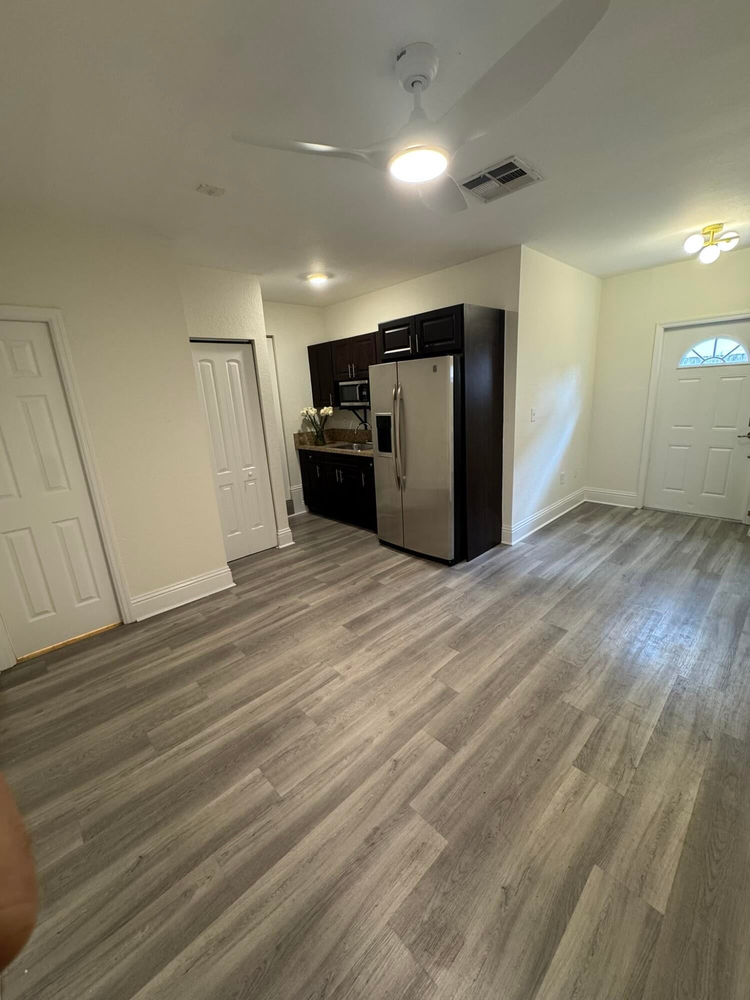 Private studio apartment available with its own entrance and independent air conditioning. The unit includes a washer and dryer, large fridge with ice maker, microwave, burners, closet, and a private bathroom with shower. Utilities such as electricity, water, sewage, trash, cable, internet, and parking are all included. The apartment features newer gray plank flooring and fresh paint.
