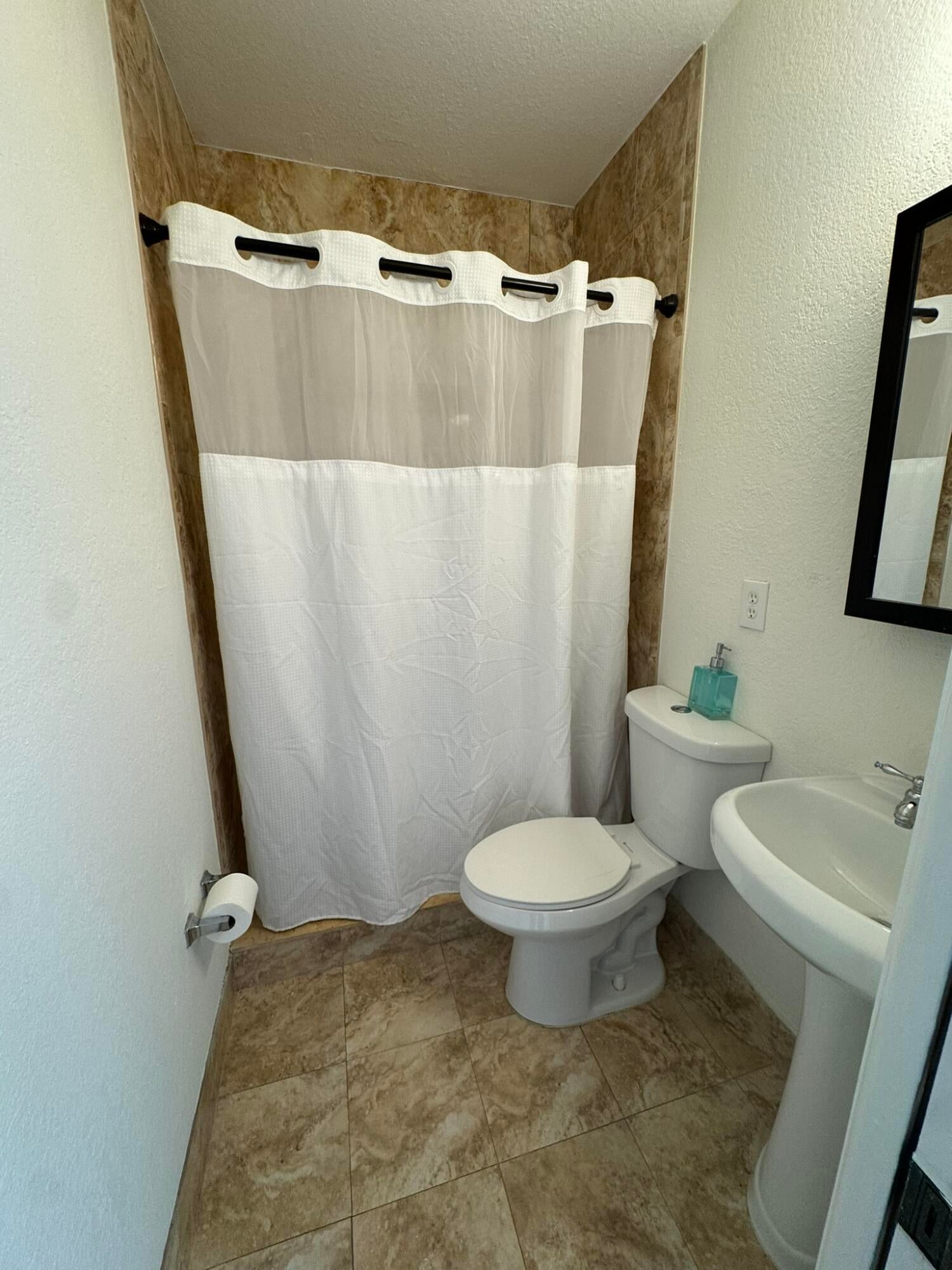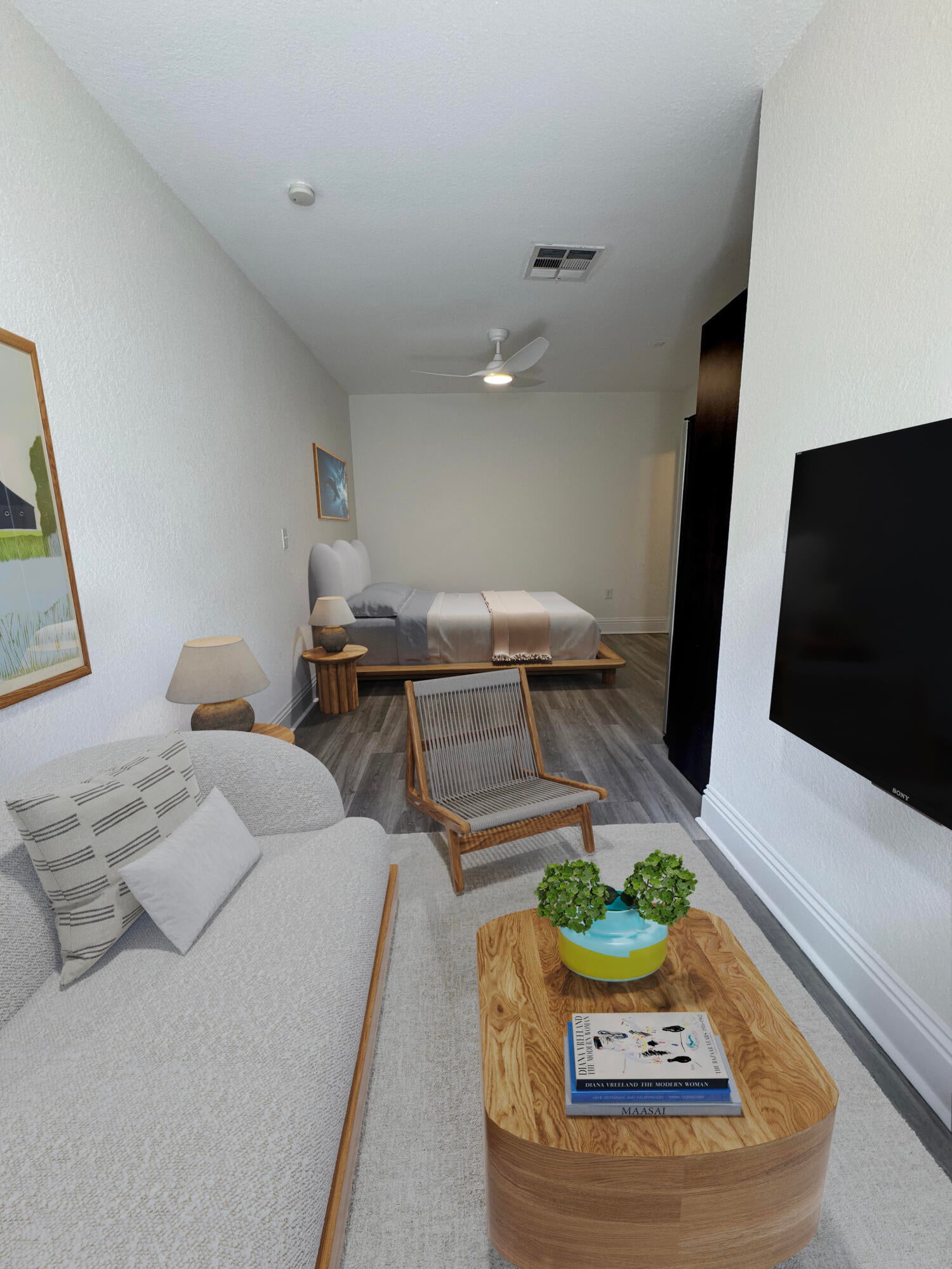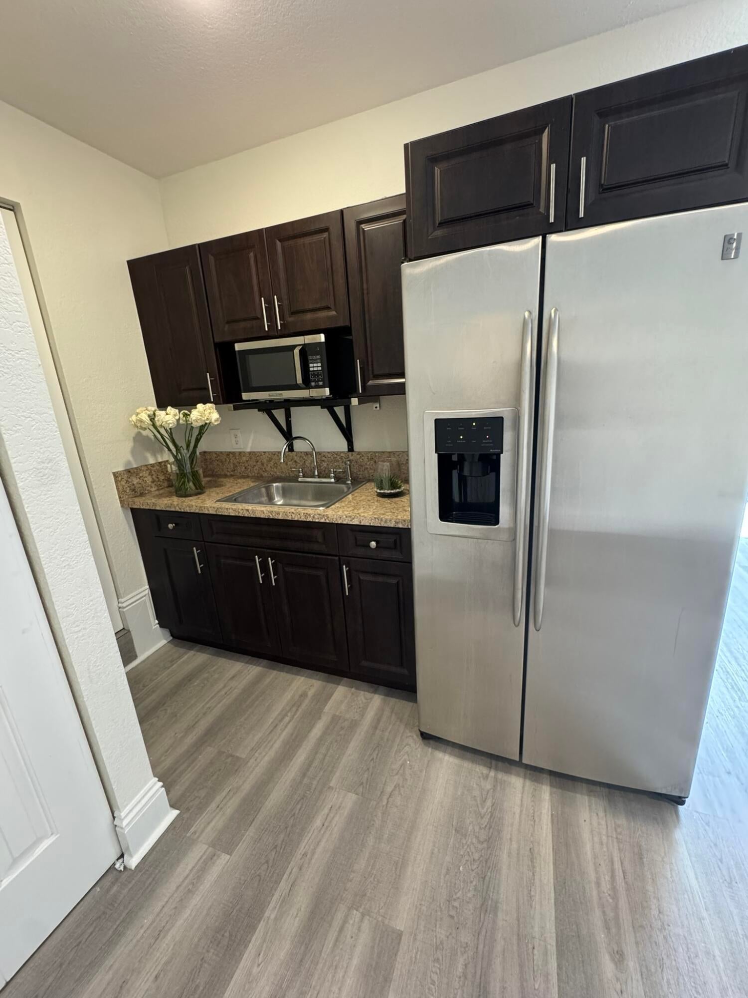 Private studio apartment available with its own entrance and independent air conditioning. The unit includes a washer and dryer, large fridge with ice maker, microwave, burners, closet, and a private bathroom with shower. Utilities such as electricity, water, sewage, trash, cable, internet, and parking are all included. The apartment features newer gray plank flooring and fresh paint.