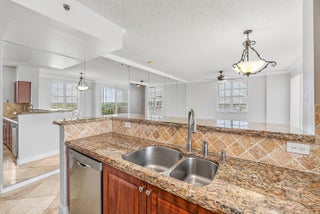 Gorgeous Designer Corner Residence with Every Upgrade! Rare 9th-floor northeast corner unit in the heart of Downtown West Palm Beach showcasing panoramic, unobstructed city and water views from a private wraparound balcony. This designer home features top-of-the-line appliances, granite and quartz countertops, tumbled marble, and elegant travertine and ceramic tile flooring throughout. The spacious split-bedroom plan includes two ensuite bedrooms, generous walk-in closets, and a beautifully updated kitchen with rich cherry cabinetry and a breakfast bar. Additional highlights include a new washer and dryer, updated bathrooms, and gated covered parking for two vehicles. The building boasts a new roof and central A/C (2024), allows pets, and is investor-friendly, buy today, tenants in place