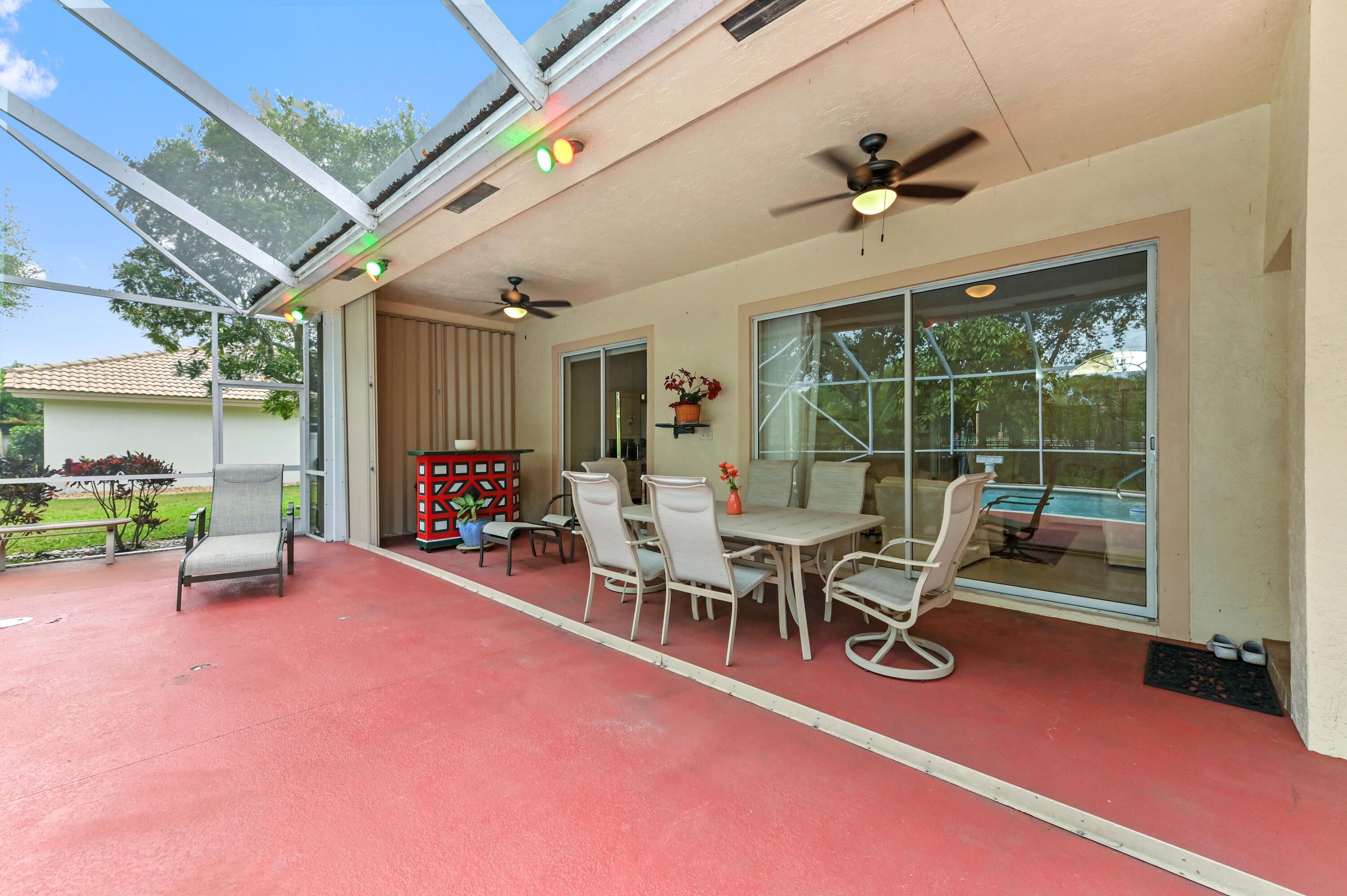 Auto Sprinkler, Covered Patio, Custom Lighting, Fruit Tree(s), Screened Patio, Shutters, Open Porch