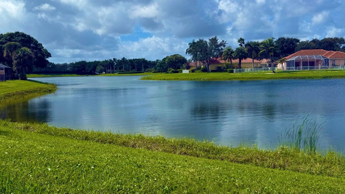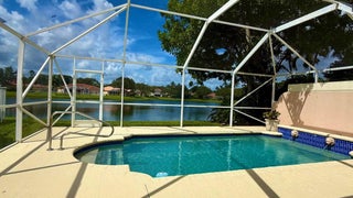 Spectacular wide lake view from the custom screened pool of this 2BR/2BA Capri model villa. Ideally located just a short walk from the Town Center with Centanni's Restaurant, community pools, fitness center, and more. New laminate flooring in main living areas. The Great Room offers a built-in entertainment unit and vaulted ceilings for a bright, open feel. Accordion storm shutters, laundry room with full-size washer, dryer, and utility sink, central vacuum, and alarm system. Enjoy serene lakefront living with resort-style amenities right at your doorstep!The heart of this unique residential community is its waterfront Town Center where you can grab lunch or dinner at the on-site "Centanni" Italian restaurant; enjoy the tennis and pickle ball experience on the eight Har-tru lighted courts with on-site tennis instructor and active tennis program. Take a swim in one of the three heated pools, fish from one of the many picturesque bridges; stop by the library, play ping pong or pool. Also located in the Town Center is the full service Illustrated Properties real estate office, beauty salon, mail facility and children's playground. Enjoy 12 miles of scenic pedestrian pathways, take a bike ride or enjoy a vigorous work out in the renovated fitness center or play bocce - all for the exclusive use of River Walk residents! Yoga, mahjong, bridge, aqua aerobics, foreign language classes, crafts and more are some of the other fun activities offered! River Walk offers luxury resort-style living, without extravagant ''country club'' fees! Conveniently located near the turnpike, Palm Beach International Airport, the Outlet Malls, Kravis Center, Downtown, and Palm Beach Island.