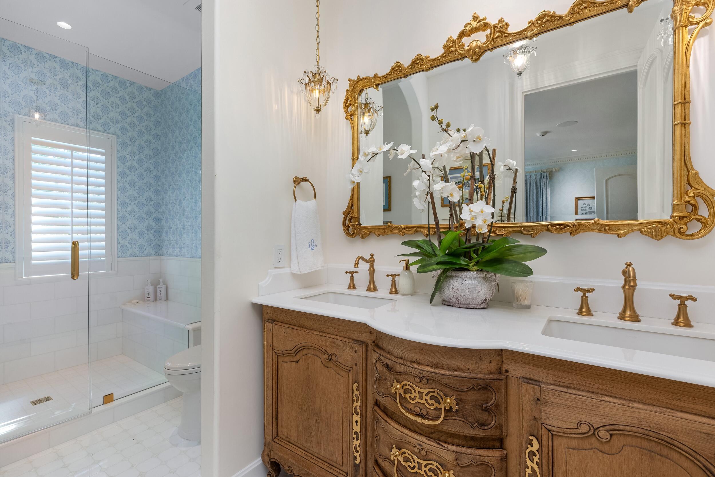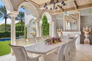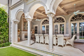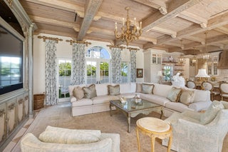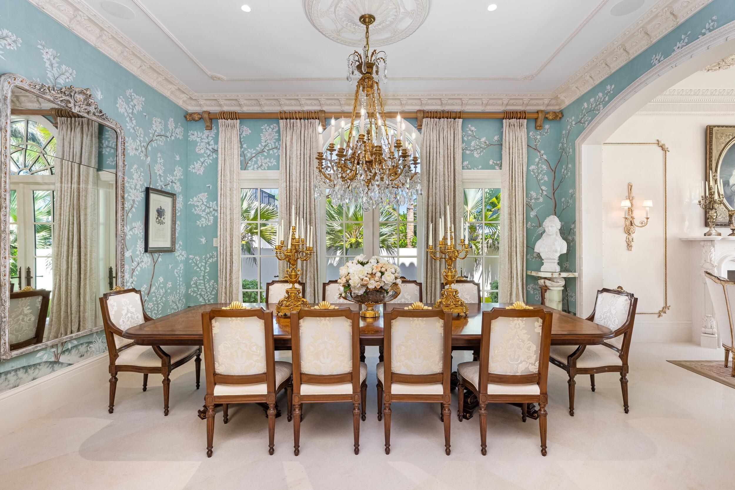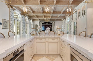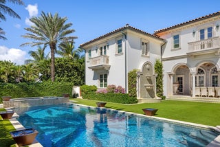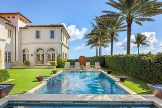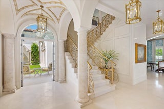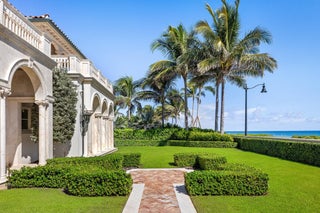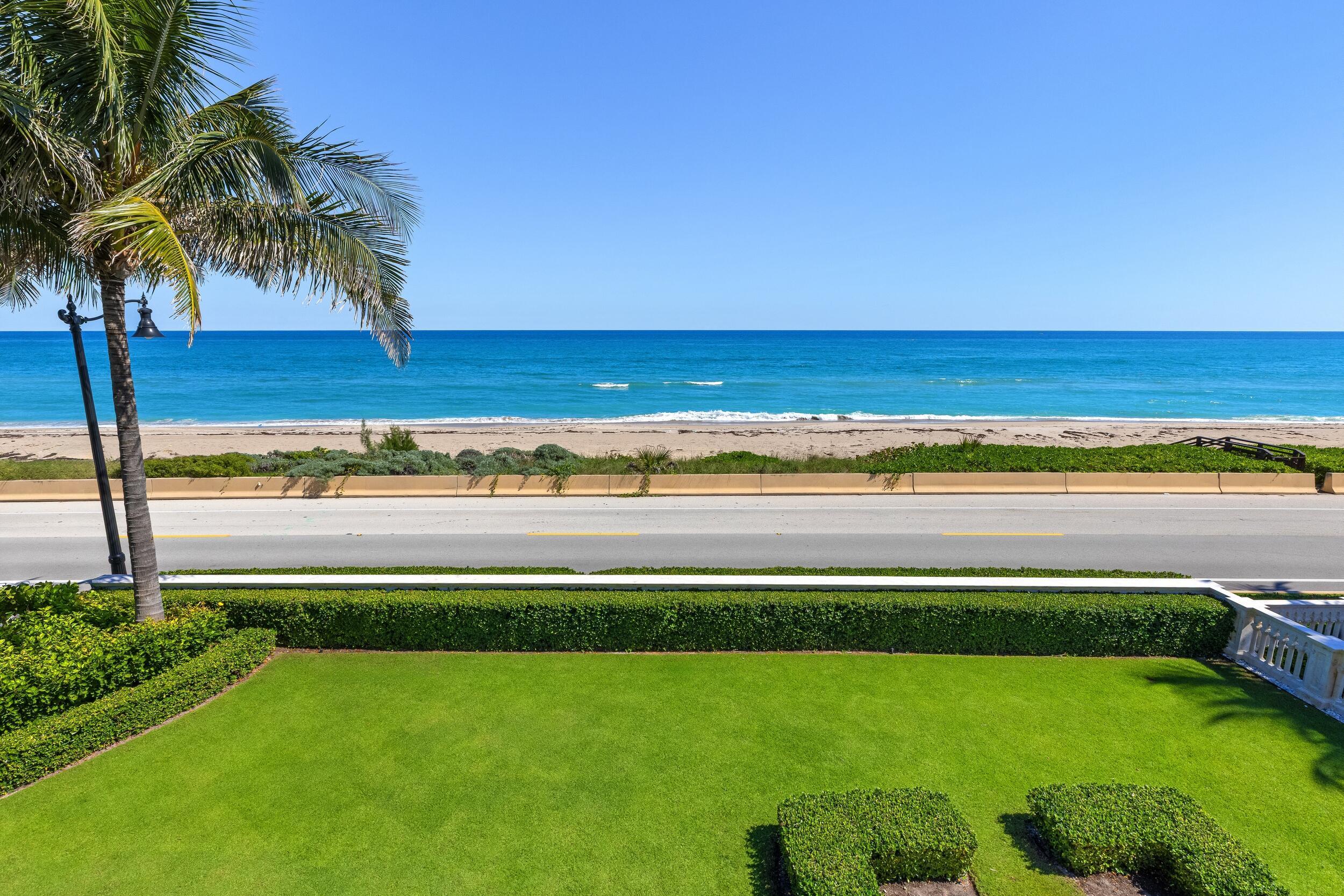 Gorgeous Oceanfront Estate on Billionaires Row - This pristine Mediterranean home features private beach access, commanding ocean views, and 10,000+/- spacious square feet. The interior and exterior space abounds, taking full advantage of the breathtaking ocean views. Exquisite artistry and finishes, impeccable attention to detail, and exceptional craftsmanship throughout. Extensive marble work throughout the home including precast around the windows, dentil moldings, balcony railings, and fencing. Gorgeous marble columns both inside and out. Imported French wooden inlay flooring and marble flooring with onyx inlay throughout the first floor. Stunning wood paneled office with built-ins. Extensive rebuild just completed from the roof to the hardscape with impact windows, brand newgenerator and A/C system, and impeccably maintained landscaping. No detail has been overlooked with applied molding on most walls and doors, detailed crown molding in nearly every room, and gorgeous venetian plaster. Oceanfront Primary Suite features sitting room, wet bar, dual baths and closets, and oversized east-facing balcony with expansive water views. Sophisticated, oceanfront living room with custom valances, applied molding, and detailed fireplace leads to large formal dining room. Stunning kitchen and family room with pecky cypress coffered ceilings. Chef's kitchen features gorgeous La Cornue stove, oversized island with seating for ten, and breakfast room. French doors throughout allowing for an abundance of natural light. Exterior highlights include the romantic covered loggia with fireplace and marble columns. The loggia steps and fountain feature stunning hand painted tiles. Newly built courtyard pool and spa. Copper gutters and imported bronze fixtures. Additional highlights include 5BR/6.2BA, elevator, card room, and 3-car garage.