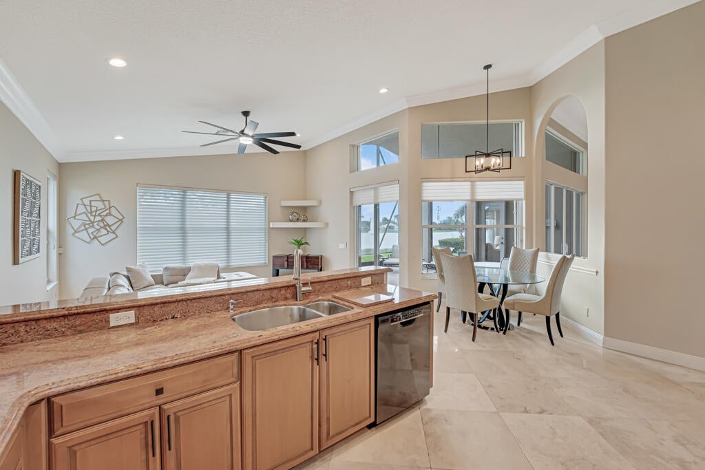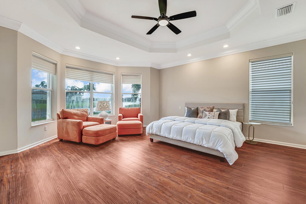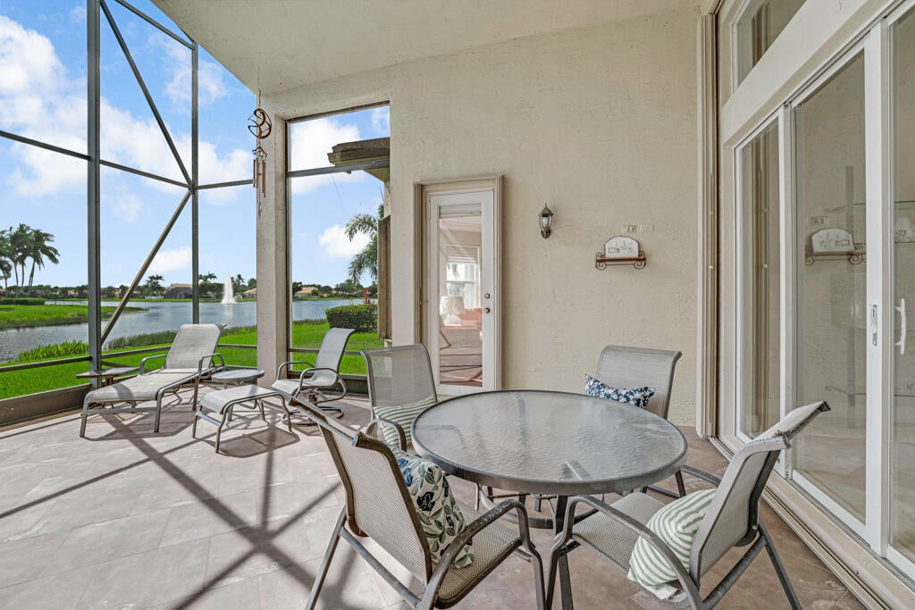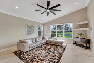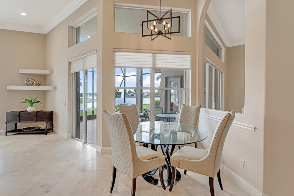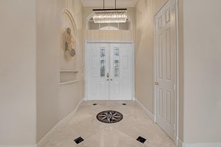 Magnificent MAIN LAKE WITH FOUNTAIN VIEWS make this 4 bedrm, 2 1/2 bath model home one of the most desirable in the community! A rare find, gorgeous marble floors & double entry doors greet you with light and bright open, airy space throughout! Gorgeous new lighting fixtures, LED high hats, super high ceilings, & a huge screened lanai with beautiful flooring , privacy overlooking water water everywhere create instant peace & serenity! No carpeting! Accordian shutter protection throughout! Walk to clubhouse, social tropical pool, full Serv restaurant, 6 pickleball crts, 3 Bocce crts! 10 tennis crts, 2 indoor racquetball CRTs, indoor whirlpool,resistance pool, lap pool too! Suana,steam, massage, Beaty salon, STATE OF ART FITNESS CTR! Country club lifestyle without the dues! LOVE THIS HOUSE!HOA FEE of 750 per month includes the following plus more: Outside painting of your home In home security system monitored Cable Tv incl HBO and more Hi speed wi-fi/internet Manned 24 gate security Irrigation system for your home Lawn maintenance & most landscaping $400 credit at restaurant per year Roof cleaning periodically Full time social director State of art fitness center and equipment so much more!!! live your best valencia life!