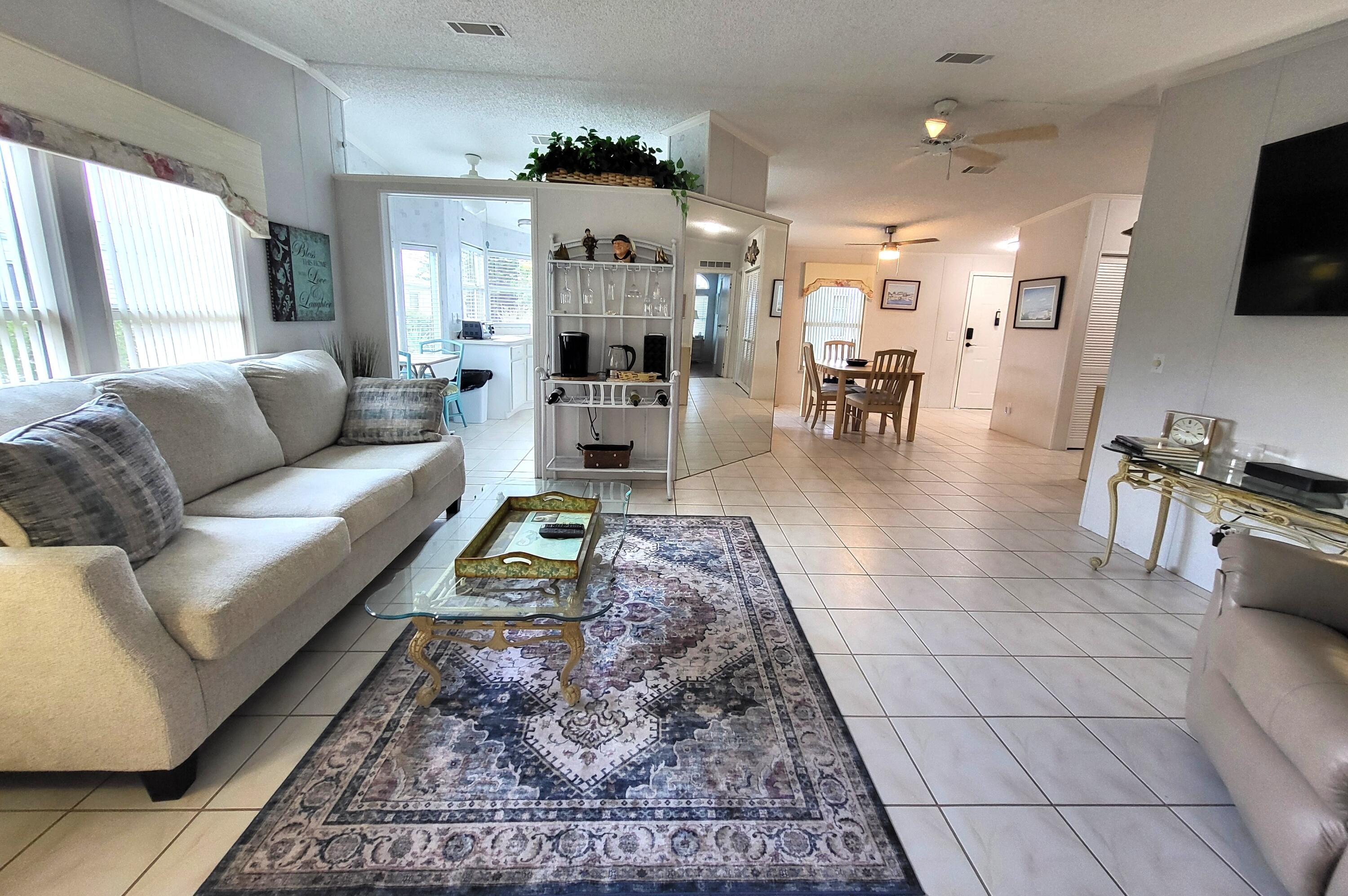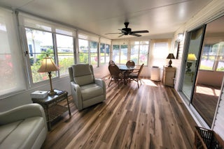 LAND OWNED! Beautiful 2 Bedroom, 2 Bath Turnkey Home in Savanna Club 55+ Community. This one-owner, fully furnished, home has been beautifully maintained, offering over 1,200 sq. ft. of comfortable living space and a bright, open layout designed for easy Florida living. Inside, you'll find a large Florida room overlooking a lake, and a bright living room, dining area, and kitchen--perfect for entertaining friends or enjoying a quiet morning coffee. The primary suite features a large closet, granite vanity, and an easy access shower. Your guest bedroom and full guest bath make visitors feel right at home. Step through glass sliders into your enclosed Florida room (lanai) with impact windows, AC, and a ceiling fan -- an ideal spot to relax all year round while taking in your lovely lake view. Additional highlights include laminate and tile flooring throughout (no carpet!), hurricane-impact windows (2019), PVC plumbing (2019), new water heater (2024), new electric panel (2025), roof (2019), a new washer (2025), and a new microwave (2025). There's also a wide double driveway leading to the large storage compartment/golf cart garage. Located on a quiet cul-de-sac, this home is part of an active, vibrant 55+ community with low HOA fees and many amenities: 18-hole golf course, 3 clubhouses and pools, fitness center, tennis, pickleball, shuffleboard, billiards, library, theater, and an on-site, 4-star restaurant.