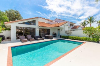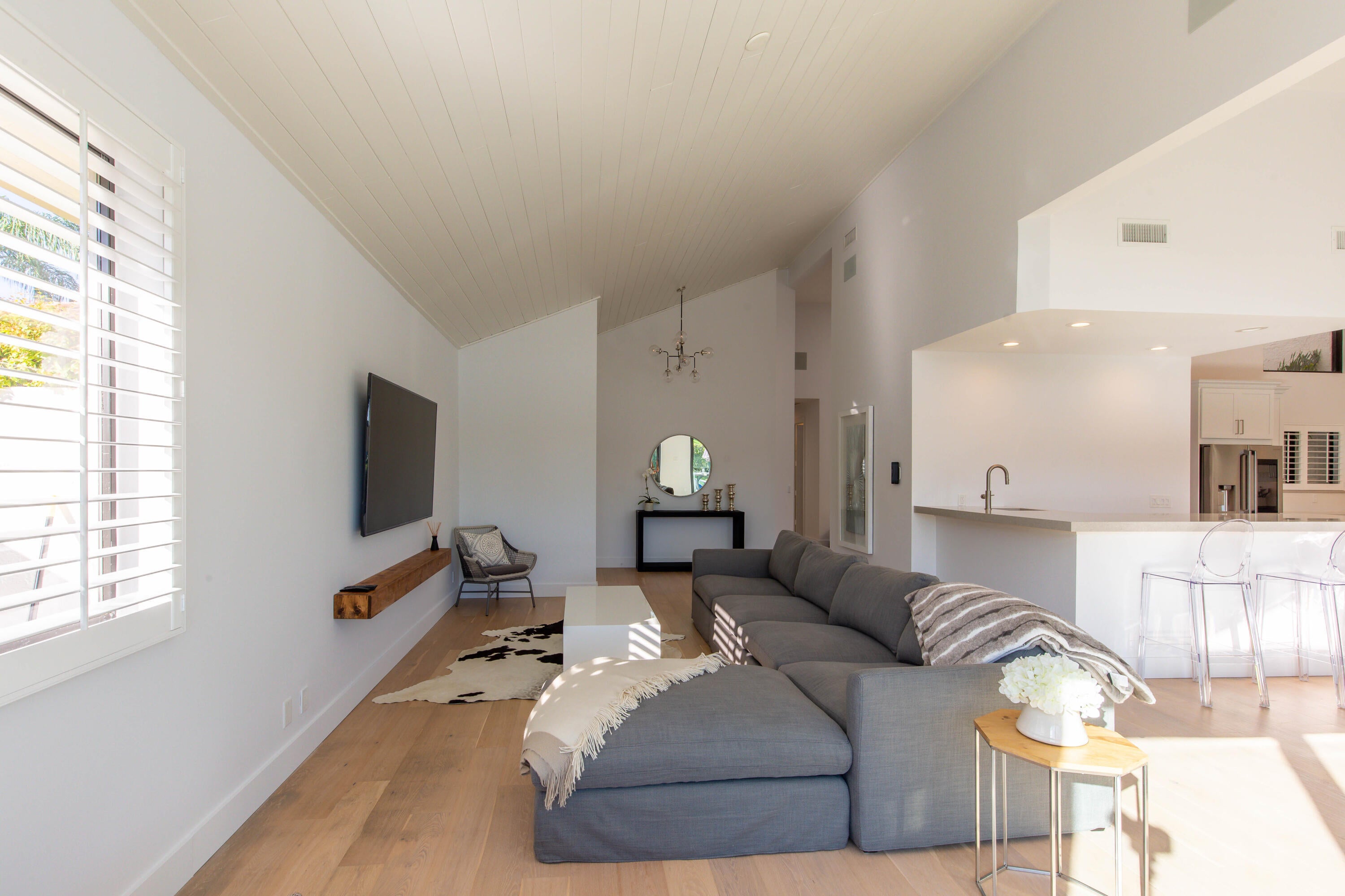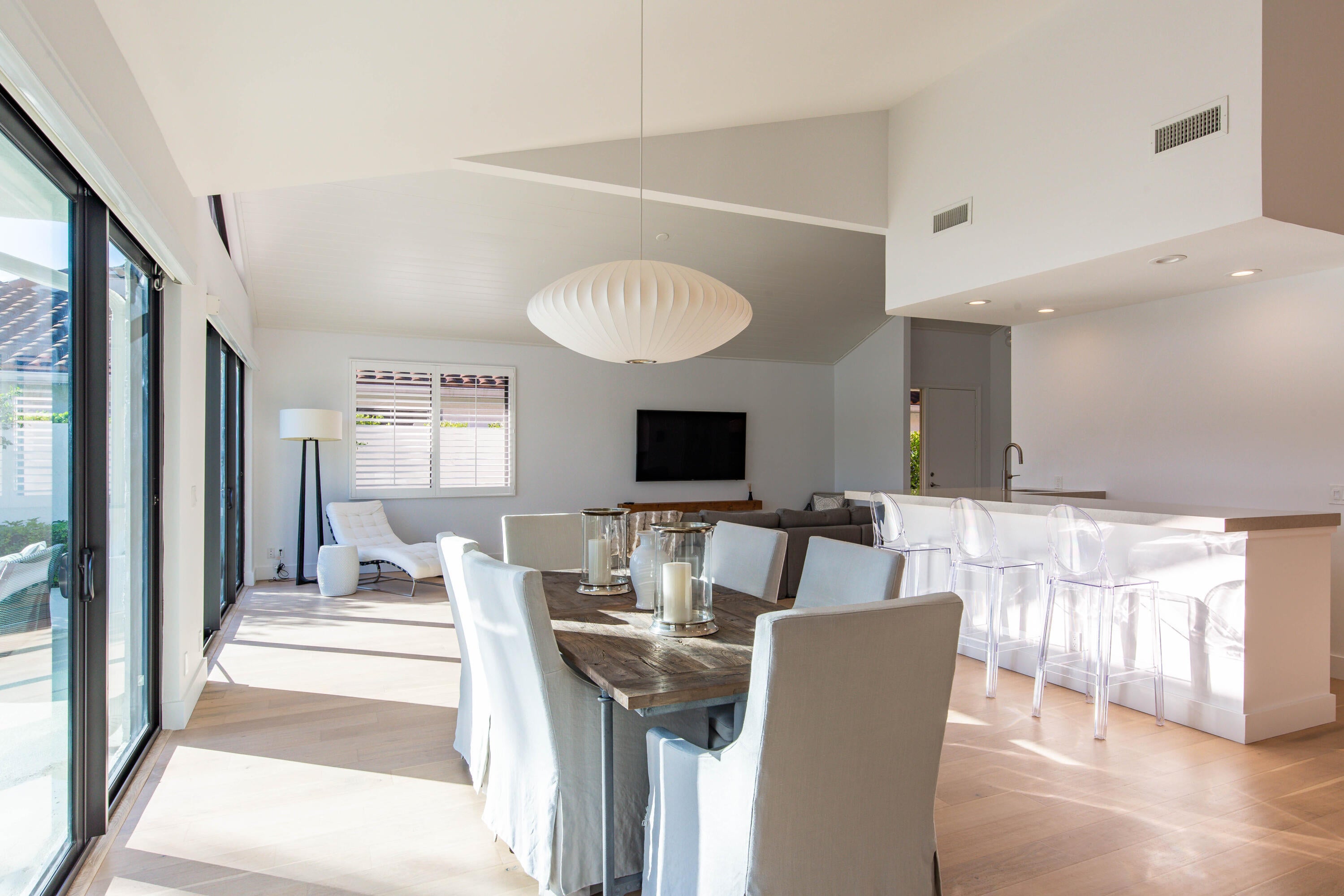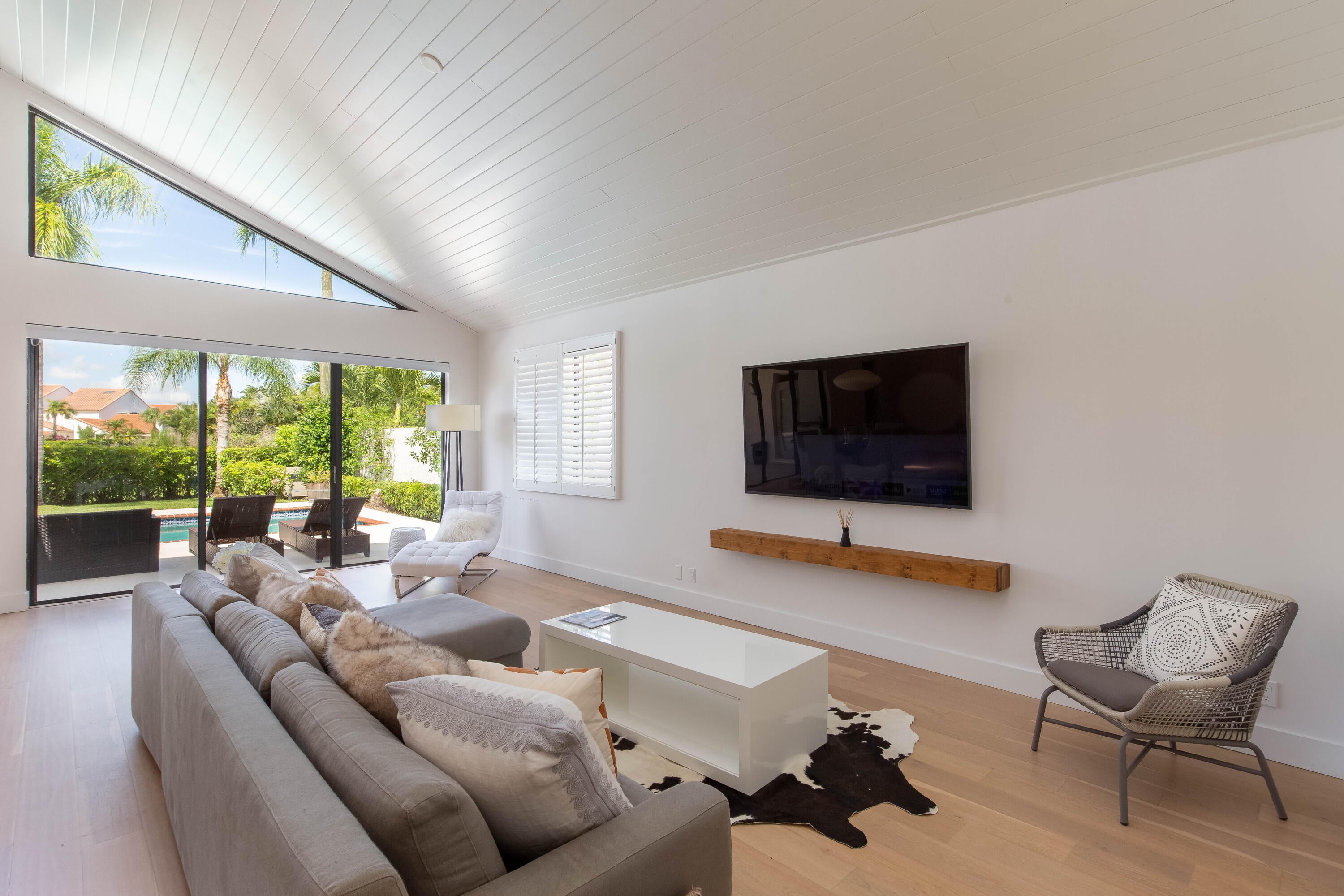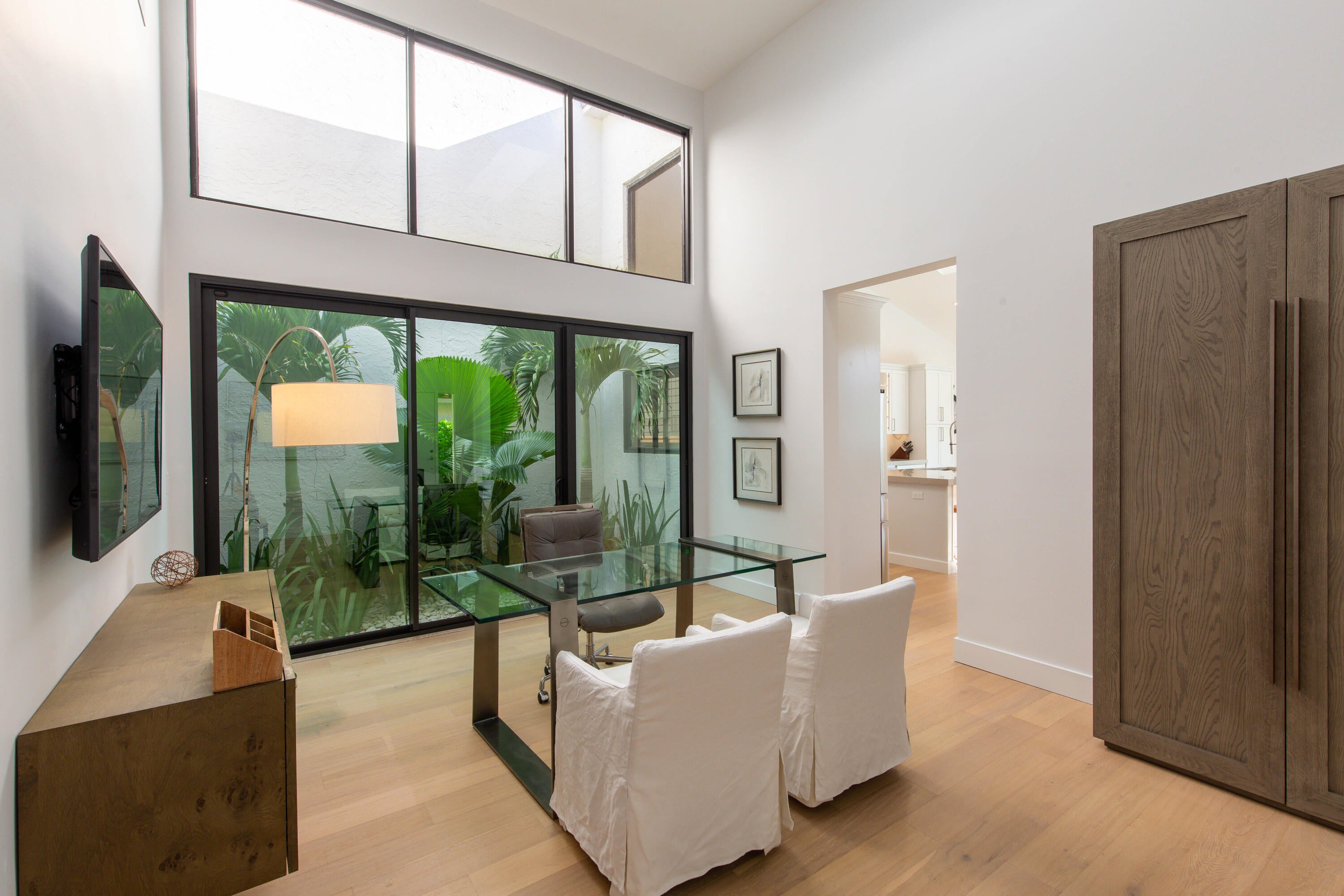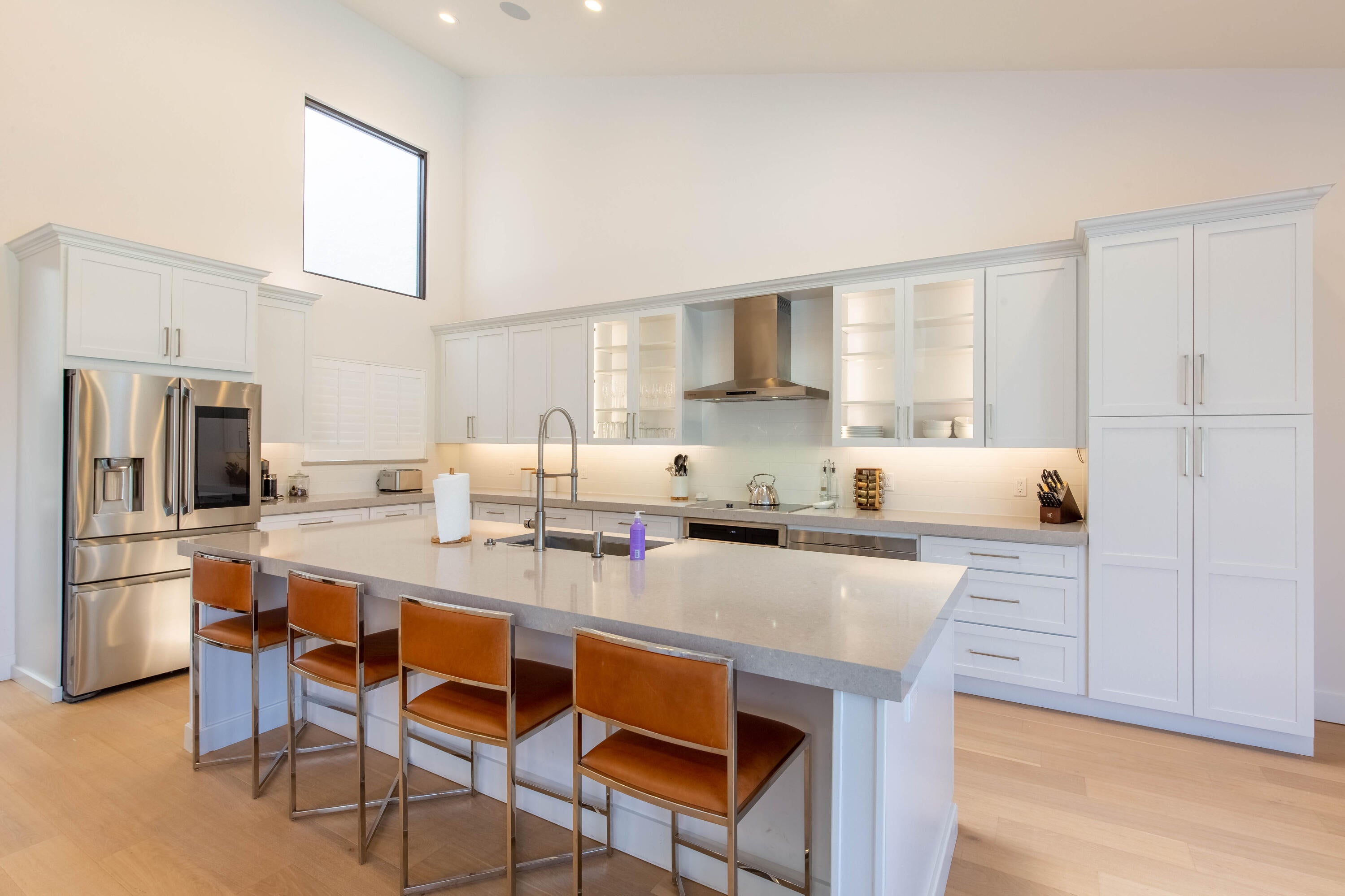 This 3 bedroom/3 bath/2 car garage and gorgeous pool home features a sophisticated, remodeled interior with vaulted ceilings, wood floors in the main living areas and will soon be outfitted with windows and impact doors and freshly painted. The sleek and modern kitchen is very spacious, fitted with a large center island with bar seating and new high end, stainless steel appliances. Next to the kitchen is a separate bar with bar seating, perfect for entertaining. High ceilings and floor-to-ceiling windows give a welcoming, bright and spacious feel.