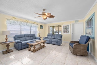 Light & Bright furnished corner unit that is close to POOL & Club House. Tile floors in living areas, indoor/outdoor carpet in FL RM, & carpet in bedrooms. Crown molding throughout, FL RM has AC vent therefore is including in total living area. Electric panel has been changed. Kitchen equipped with all major appliances & features newer Formica counters. Sellers installed additional storage cabinets in Guest Bedroom. AC new in 2016; water pipes are PVC through attic. Accordion shutters on all windows except for front FL RM window which had been changed. Disappearing screen doors on front & back doors. Open Patio with outdoor furniture + grill. Unit is situated on the most western street of HP therefore a canal at the back of the unit. Perfect Seasonal Home & priced to sell quick, Call Now