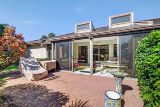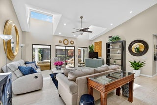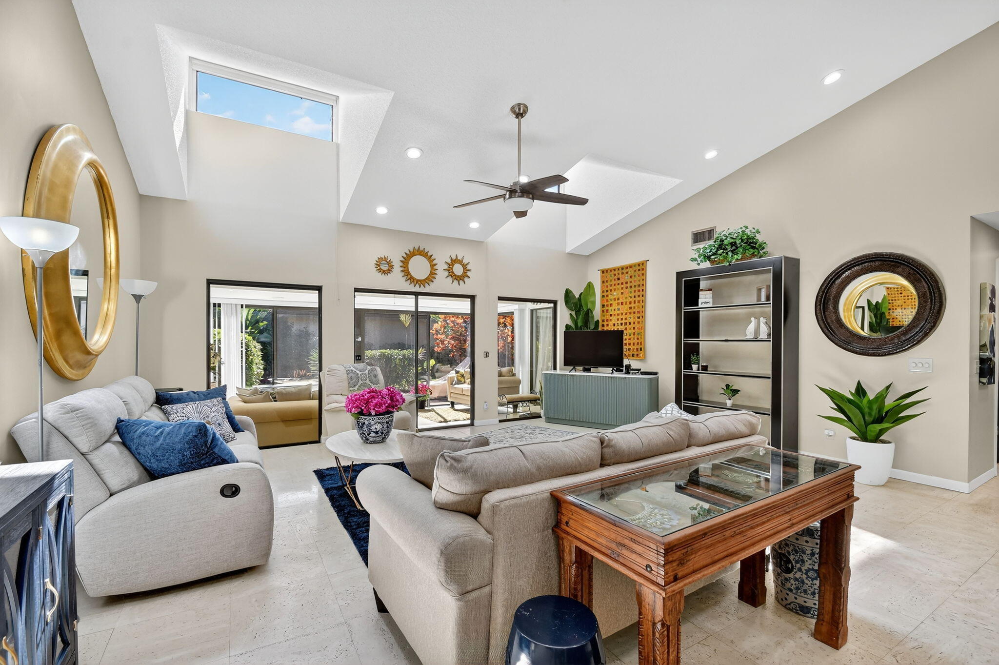 All ages community! Welcome to this elegant 3-bedroom, 2.5-bath corner villa nestled within the gated community of The Fountains of Palm Beach. Offering 2,046 square feet of beautifully designed living space, this residence impresses with vaulted ceilings, skylights, and a bright, open floor plan.HOA covers Water, Roof replacement+ maintenance, Trash, Cable, Wi-Fi, Building Insurance, Driveway + front door painting, 24/7 Security patrol, Manned gate. Roof was replaced in 2018.The modern kitchen features sleek finishes and flows seamlessly into the spacious living and dining areas, ideal for both relaxation and entertaining. A glass-enclosed Florida room extends your living space, opening to a private patio perfect for enjoying Florida's year-round sunshine.Additional highlights include travertine flooring, generous walk-in closets, ample storage, and a convenient one-car garage. Residents of The Fountains enjoy exceptional amenities such as a tropical pool (walking distance), lush landscaping, and 24-hour gated security. Centrally located near the Florida Turnpike, I-95, shopping, dining, and the beach, this villa offers the perfect blend of comfort, convenience, and low-maintenance South Florida living at its finest. Social membership and golf membership is available but NOT required!