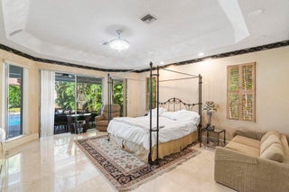 Inpressive estate home of 5 bedrooms & 4 1/2 baths with a fabulous pool area & spacious grassy play field! This elegant 2-story home offers 22' volume ceilings & crown moldings; Saturnia marble floors. The island kitchen features ivory 42'' cabinets, granite counters, onyx backsplash,stainless steel appliances,a breakfast nook & a full bath. The Family Room is perfect for entertaining with a decorative fireplace & bar area. The Primary Suite has great closet space. An office & secondary bedroom complete the main floor. A staircase with wrought-iron banister leads to the second floor which has wood floors throughout-3 bedrooms,2 baths, a loft & a spacious balcony. The inviting backyard features a covered lanai with marble pavers,an open area with an oversized pool and a large grassy area.