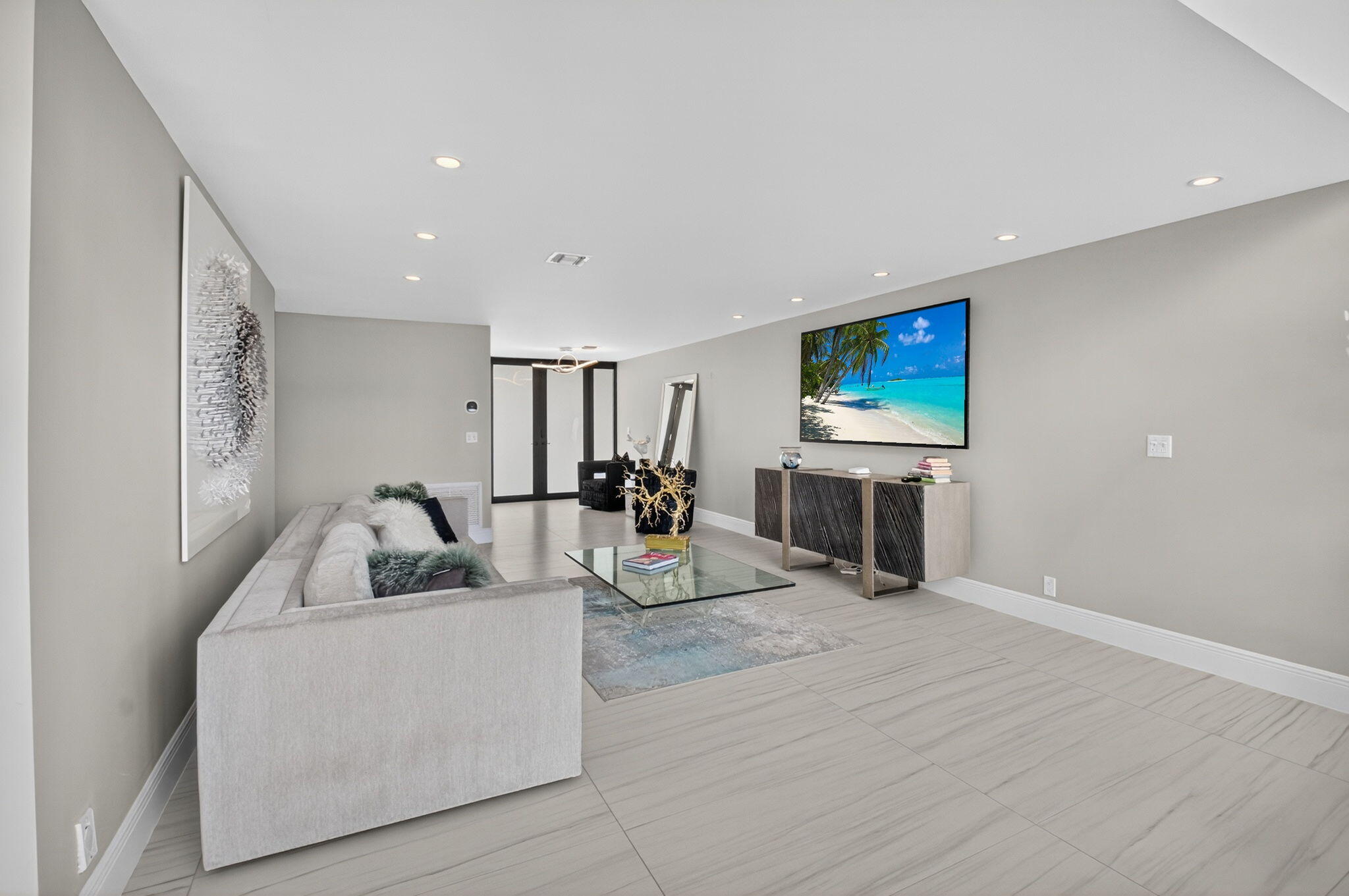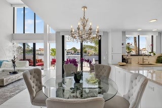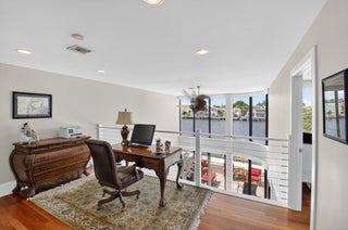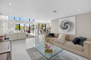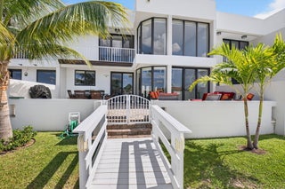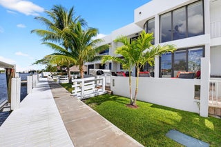 Enjoy an elegant, modern townhouse lifestyle on the intracoastal, with beach access! A dramatic double-height living room showcases curved, floor-to-ceiling impact glass windows with motorized shades. Watch breathtaking sunsets and the boats going by from your terrace, living and dining room, kitchen, office and primary bedroom! Upstairs is luxurious cherrywood flooring, frosted glass French doors and ample closets! The Office is next to a grand primary suite, with an oversized spa-inspired bath. The 2 guest suites have terraces, modern baths with inlay tiles and glass shower enclosures. Entertain alfresco on the expansive deck and barbecue area with a retractable awning. A 20-foot boat lift holds up to 10,000 lbs. The side garden features a Tiki hut and a convenient day dock.