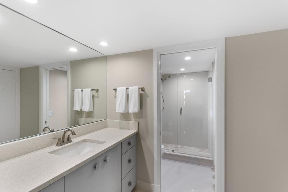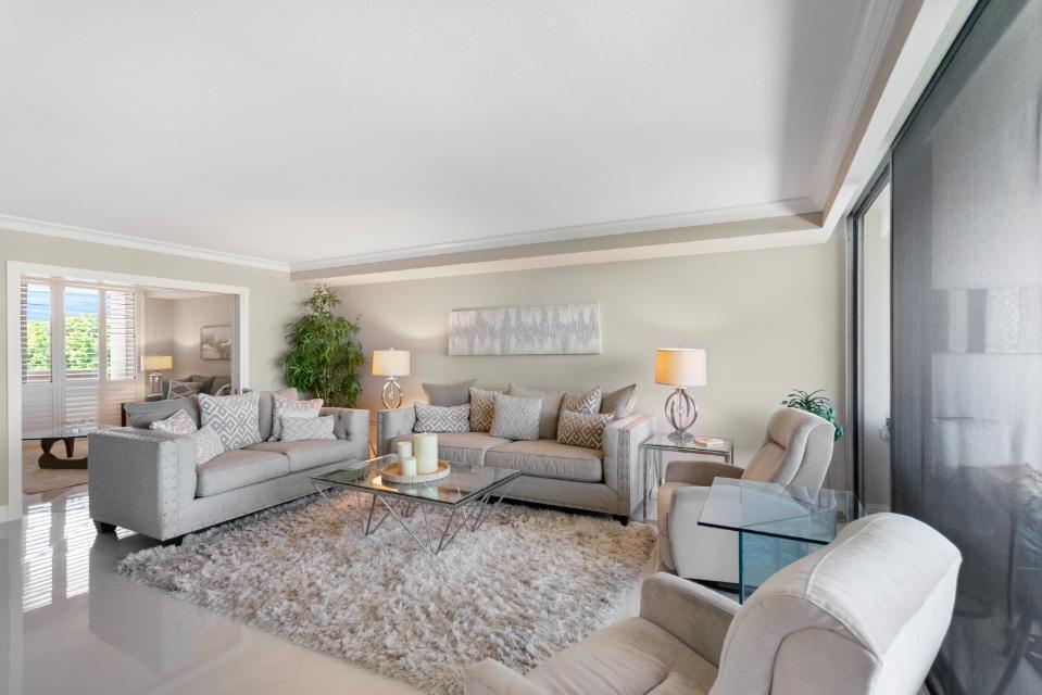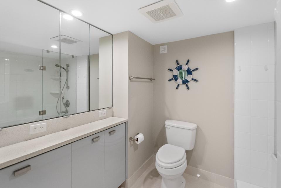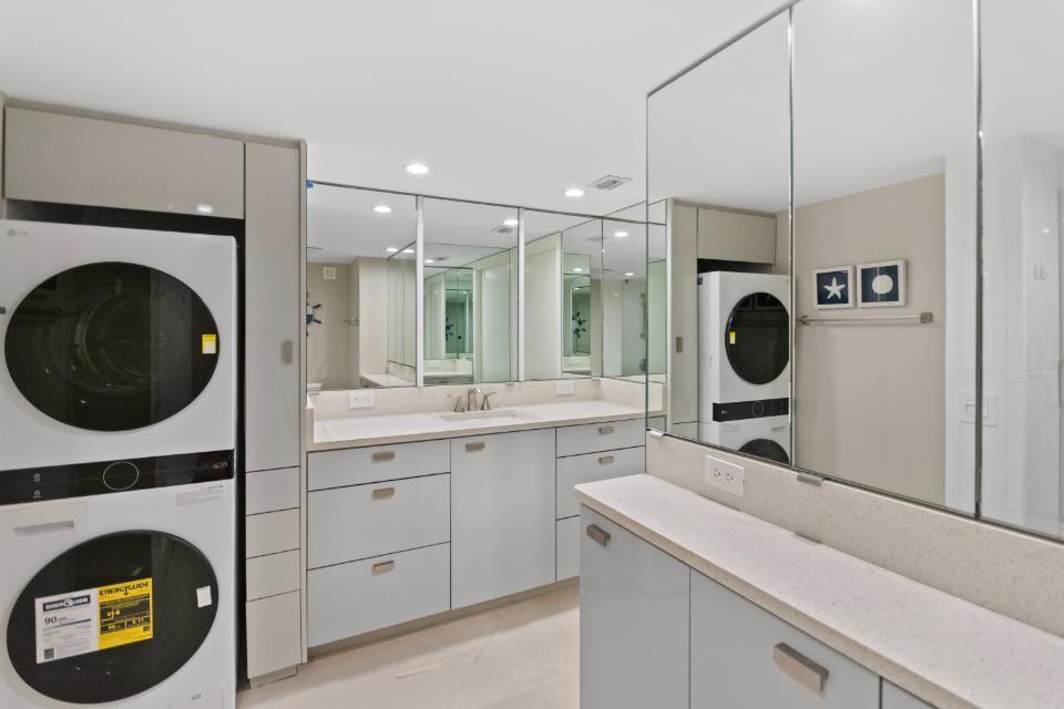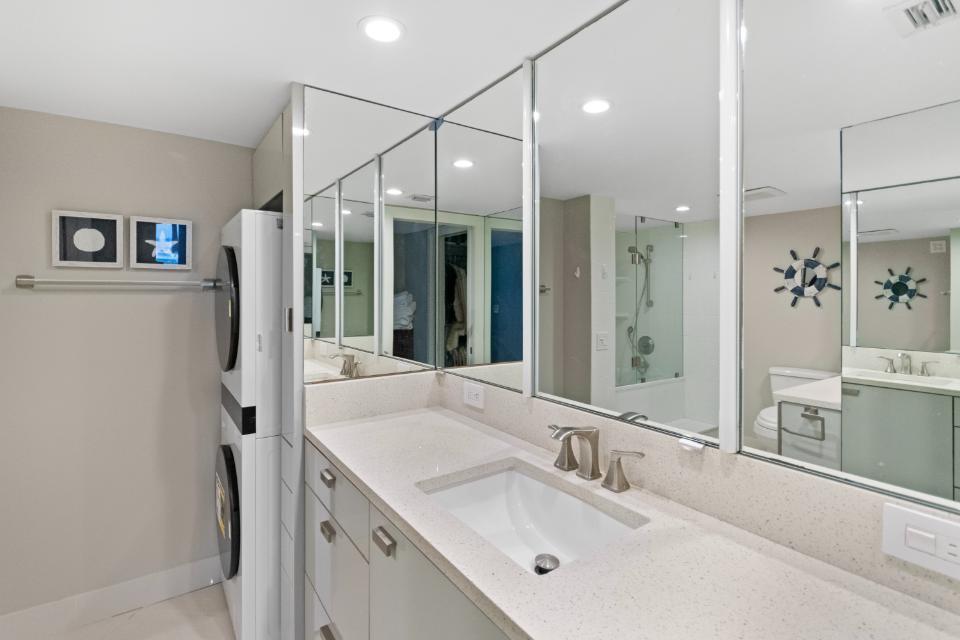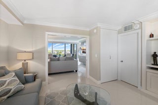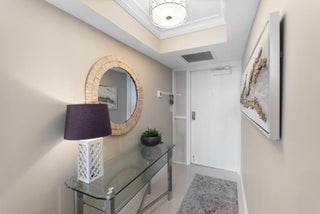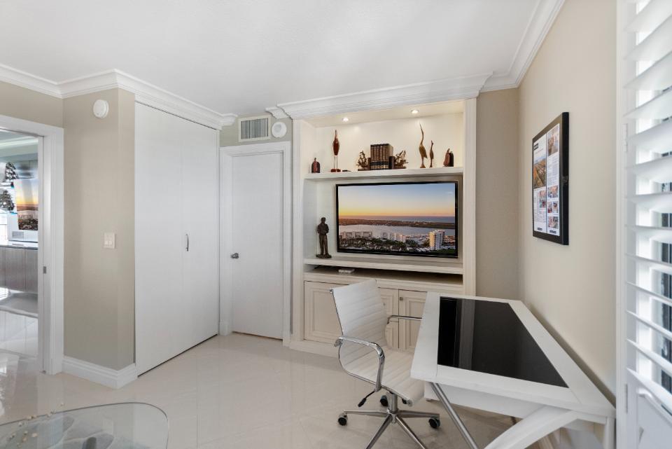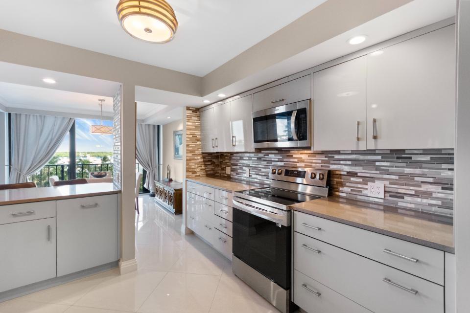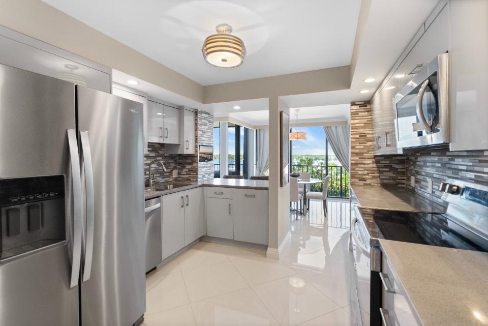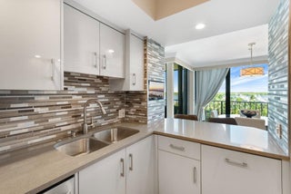 Tastefully renovated 2BR/2BA split-bedroom convertible floor plan in Quay South. This 5th-floor condo offers beautiful marina and Intracoastal views. The updated kitchen features modern cabinetry and stainless steel appliances. The spacious primary suite includes a walk-in closet, a tub/shower combo, modern cabinetry with ample storage, and a new washer and dryer. The guest bathroom has been upgraded with a walk-in shower.The convertible bedroom includes a closet and functions as a full second bedroom. Built-in entertainment centers in both the guest bedroom and living room add style and storage. Enjoy gorgeous views from every room and take in the sunrise from your private balcony.Additional features include one assigned covered parking space, guest parking, a waterfront pool, fitness center, and a 24-hour manned gatehouse. Conveniently located near shopping, dining, golf, tennis, and miles of beaches.