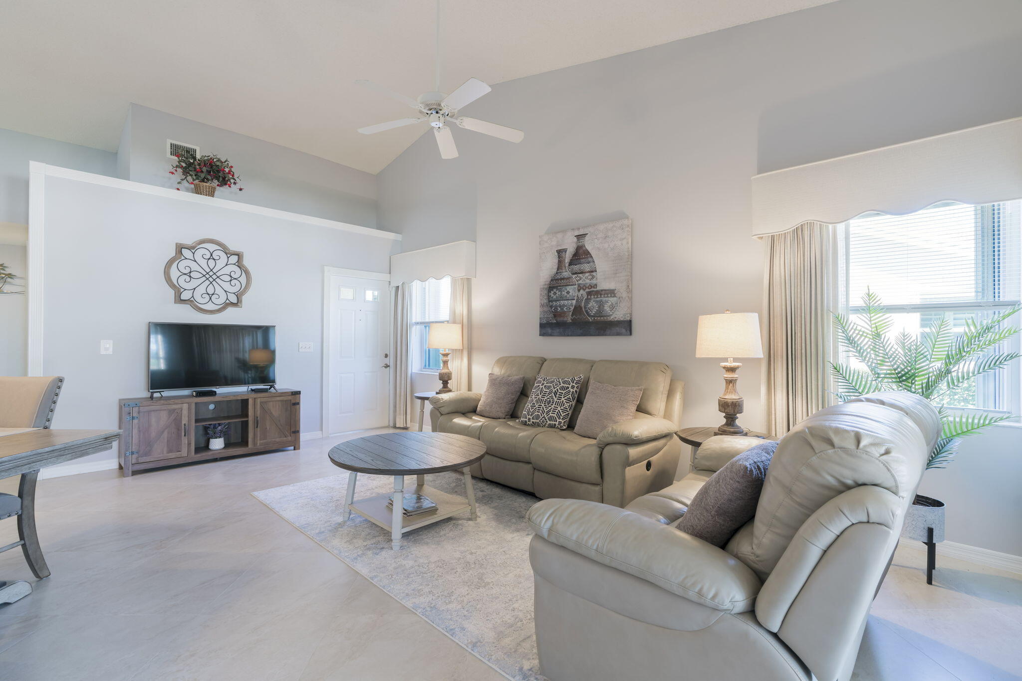 Beautiful 2-Bedroom, 2-Bath CBS Villa in the Prestigious Gardens of St. Lucie Community. This beautifully maintained, light and bright home features vaulted ceilings, tile floors, and a desirable split-bedroom floor plan. The kitchen offers granite countertops and an inviting eat-in dining area. The spacious primary suite boasts a volume ceiling, a large walk-in closet, and a private ensuite bath. The split layout provides comfort and privacy, while the air-conditioned Florida room offers the perfect spot to relax year-round. Additional highlights include a large 2-car garage with pull-down attic stairs for extra storage and a full screened sliding door. Enjoy peace of mind with accordion hurricane shutters and a brand-new roof (2025). All furniture is included. St. Lucie Gardens isa private community of just 112 villas featuring a clubhouse and pool overlooking a serene lake. The neighborhood is known for its strong infrastructure, with underground utilities and the added reliability of sharing the same power grid as the nearby hospital. Ideally located close to shopping, dining, the Civic Center, the Wildlife Center with hiking trails, medical facilities, and just 9 miles to beautiful Hutchinson Island beaches and downtown Stuart, this home perfectly blends comfort, convenience, and community. Low HOA includes: Cable, Common Areas, Lawn Care, Pest Control, Pool Service, and Reserve Funds.