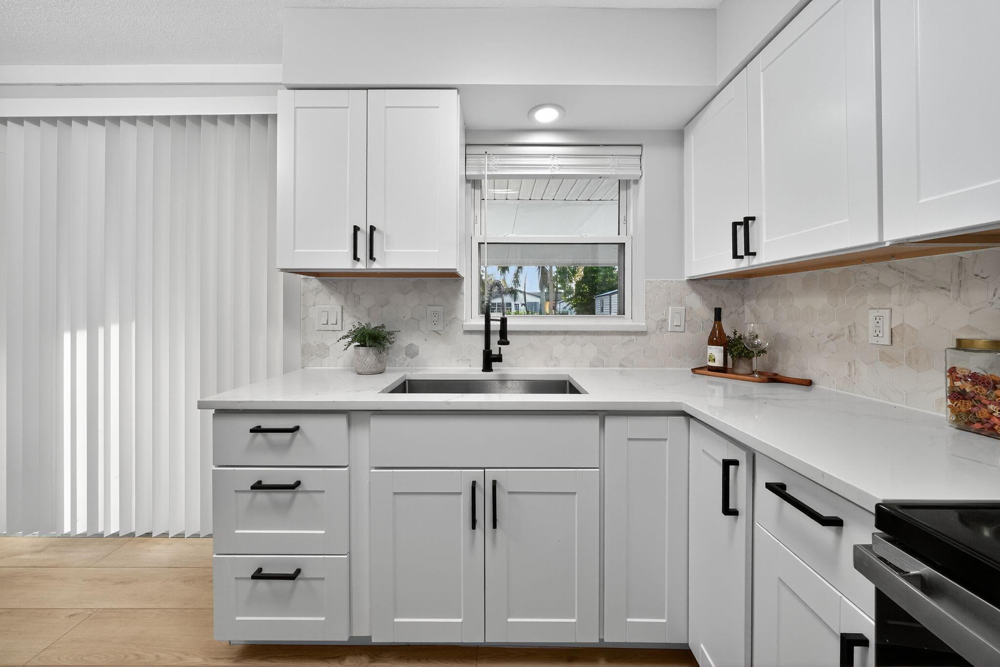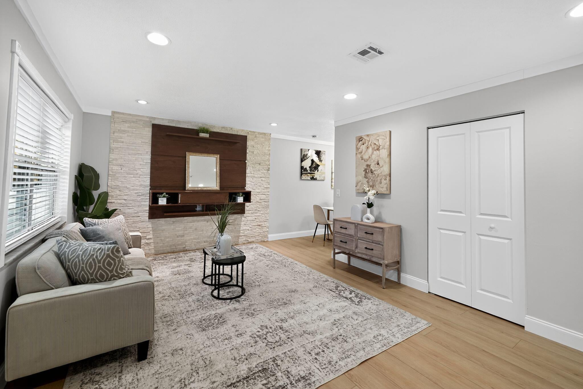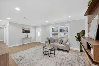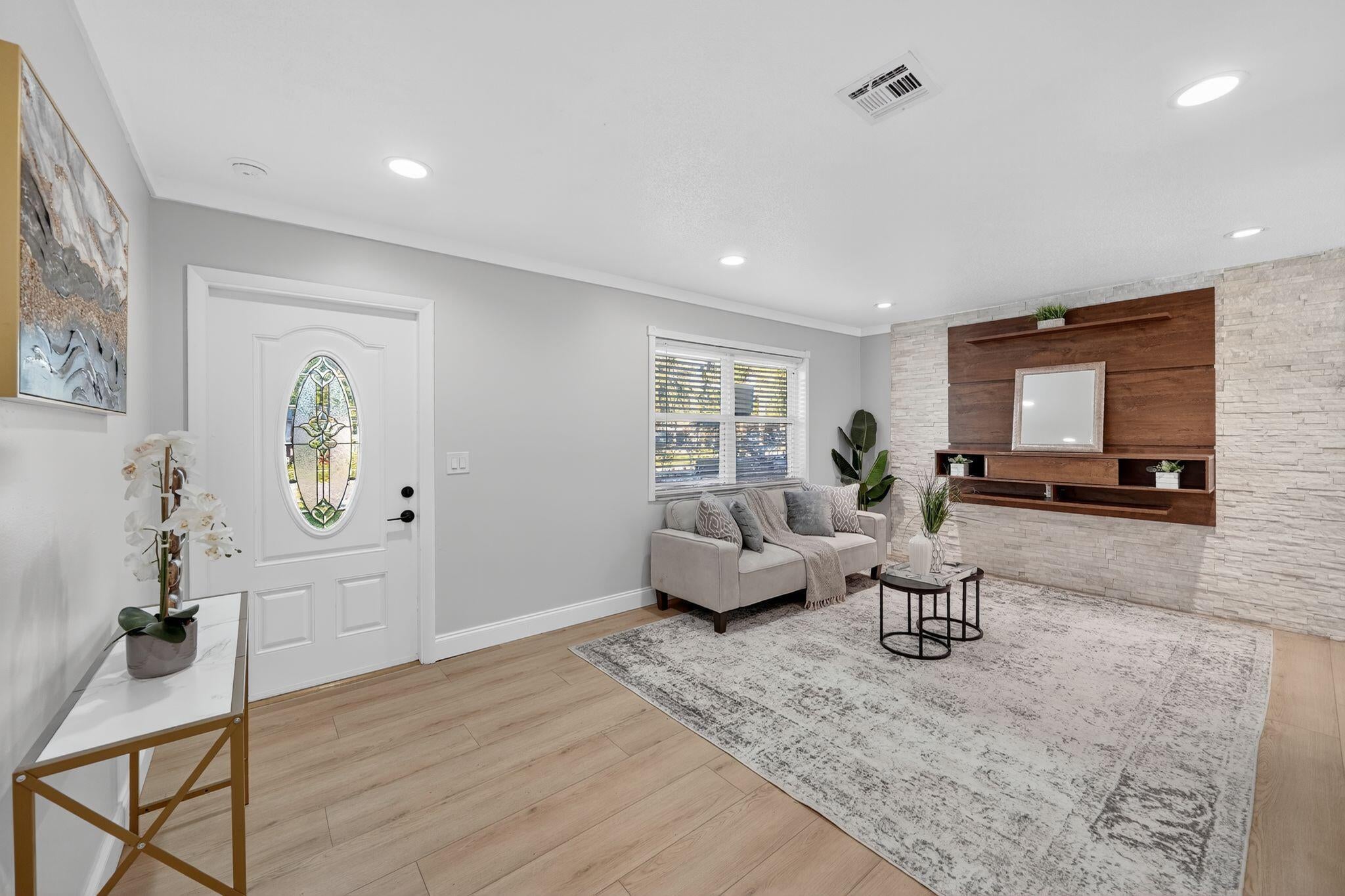 Come see this beautifully remodeled 2 bedroom/1 bathroom concrete-block home with a large, covered lanai in the back, a fenced-in yard and extra storage shed! New exterior and interior paint, refinished driveway, stunning interior upgrades including new luxury vinyl flooring throughout, ALL NEW Kitchen with new cabinets, backsplash, quartz countertops and stainless-steel appliances. Gorgeous accent wall in the living room gives the home a cozy feeling. Fully remodeled bathroom with a new tub, toilet, vanity, mirror and retiled shower. BRAND NEW 2025 ROOF! NO HOA. Schedule a showing now!