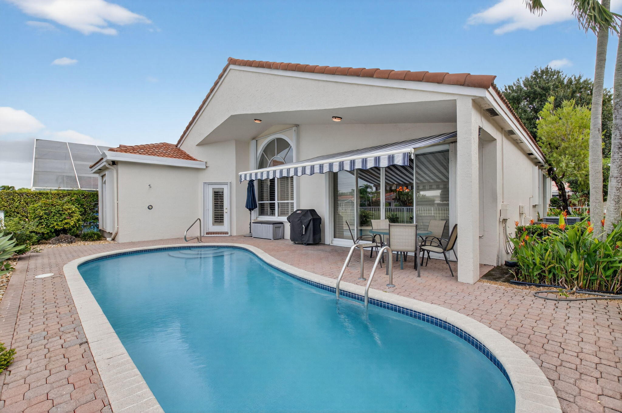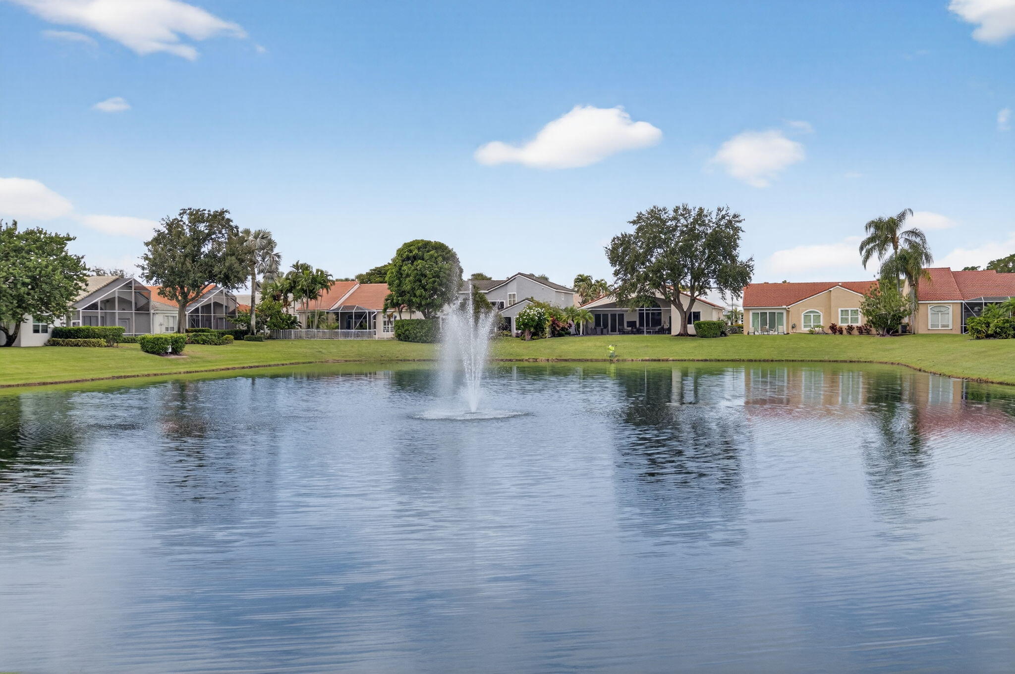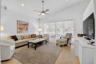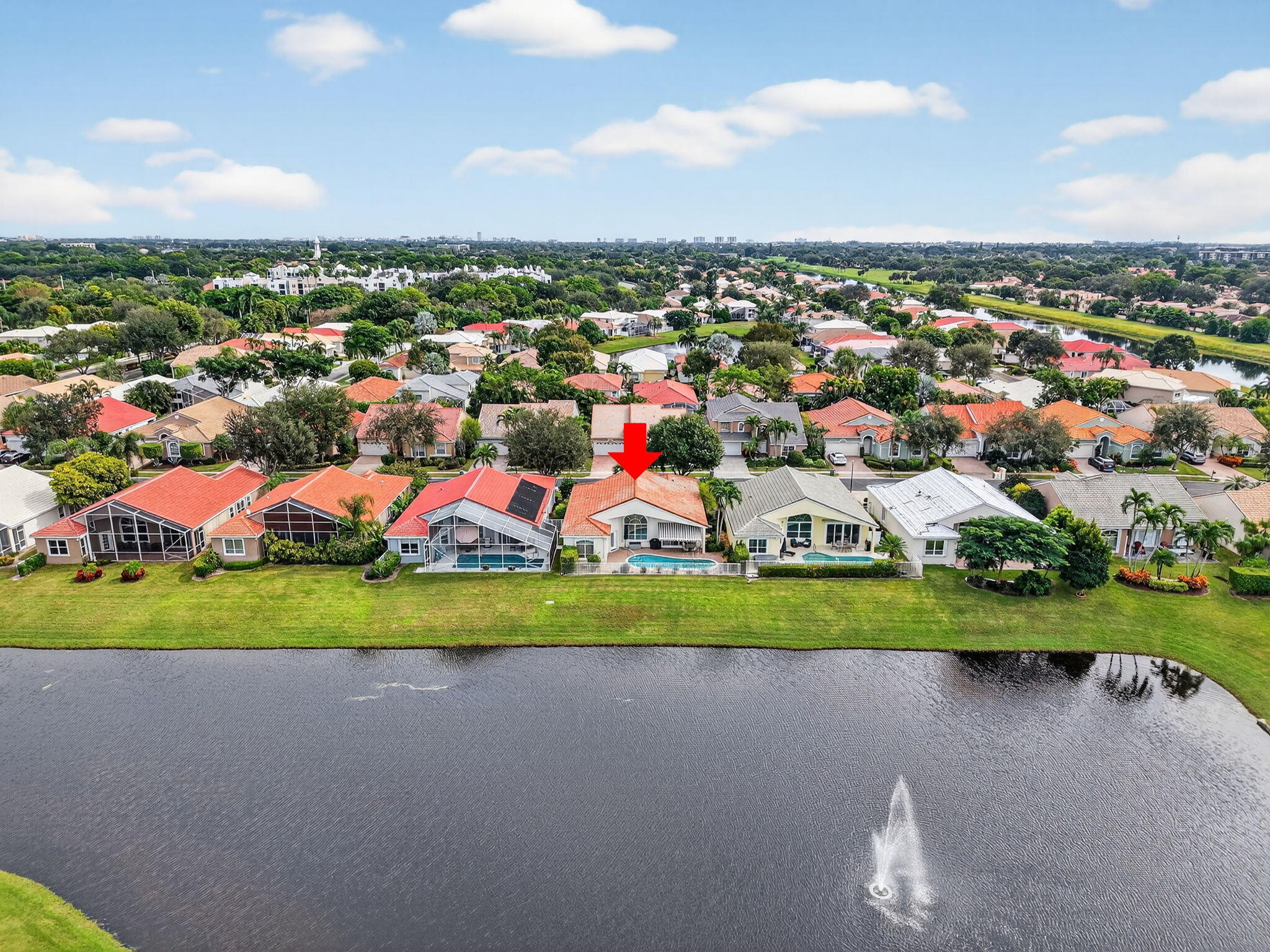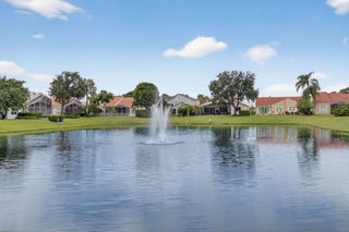 Enjoy the incredible sunset views overlooking the expansive lake & fountain from your own tropical paradise. The patio area has an electric awning which makes it so enjoyable on those bright days. Spotless and meticulously maintained 1-story home with 3 bedrooms & 2.1 baths plus 2-car garage. Ceramic tile and engineered wood flooring. Plantation shutters throughout. The kitchen has real wood cabinetry, granite counters & a full granite backsplash. The master bedroom features fully outfitted closets & en suite bath with dual sinks. New central vacuum system & new washer & dryer. Hurricane resistant garage door & accordion shutters.Situated within the highly sought-after, manned-gated community of Costa Del Sol at Boca Pointe, residents enjoy a low-maintenance lifestyle with cable, common areas, and 24-hour security included in the HOA. Optional membership at the Club at Boca Pointe offers access to an 18-hole championship golf course designed by Jack Nicklaus, a world-class tennis facility, state-of-the-art fitness center, resort-style pool, fine dining, and a vibrant calendar of social events, all without mandatory equity fees. Ideally located in central Boca Raton, this home is just minutes from Town Center Mall, Mizner Park, Downtown Boca, pristine beaches, and top-rated Palm Beach County schools. With its prime location, open layout, and access to the best of South Florida living, this home is an incredible opportunity to experience the luxury, comfort, and convenience of Boca Pointe living.