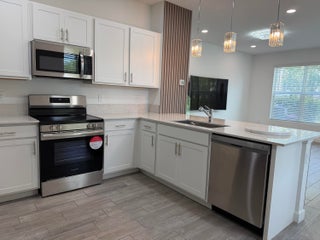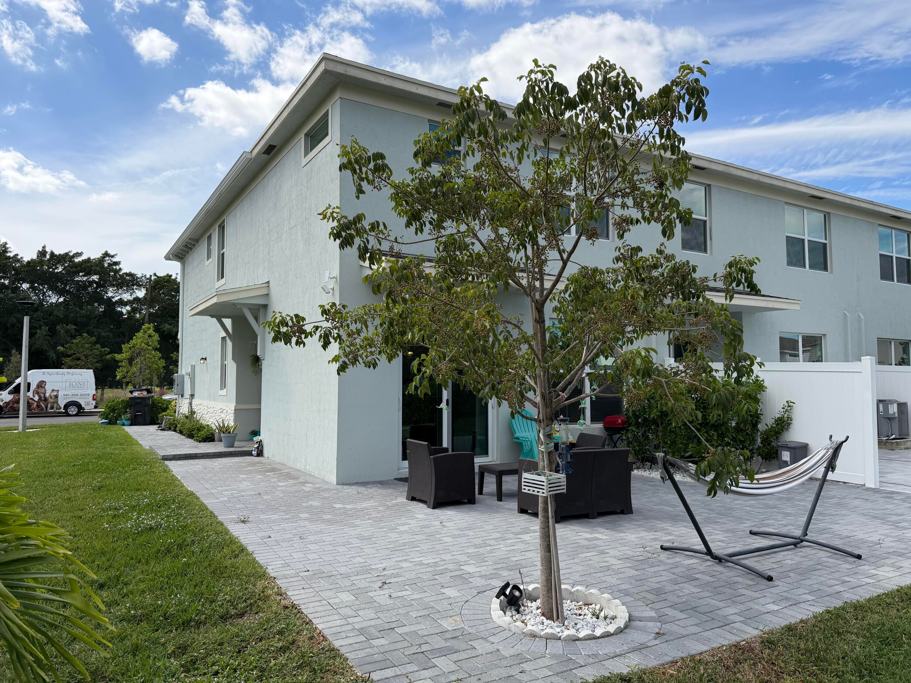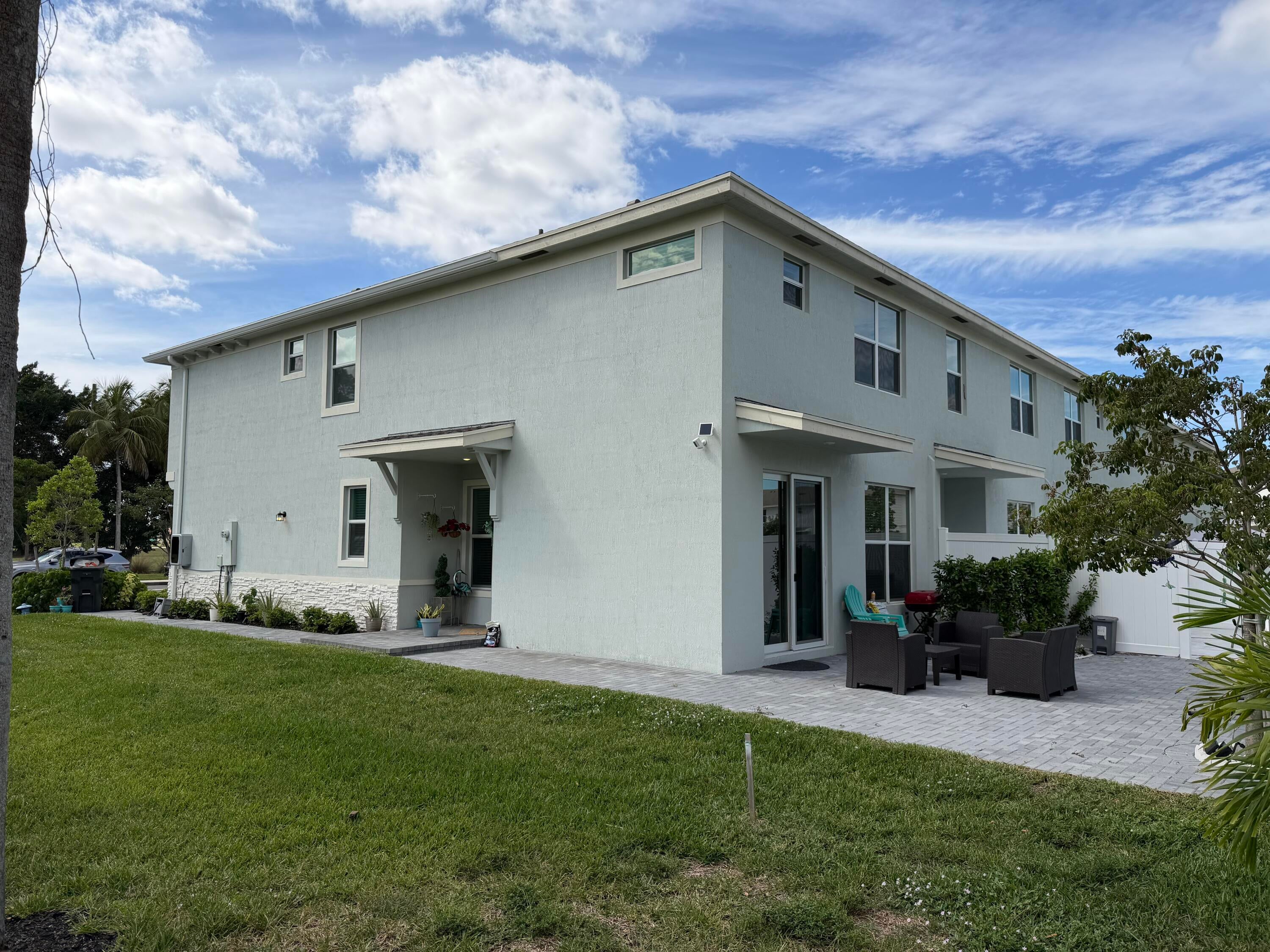 Discover this exceptional end-unit townhome designed for modern living! The open-concept first floor features a contemporary kitchen that flows into the dining and family room -- perfect for entertaining or relaxing. Upstairs offers four spacious bedrooms, including a luxurious primary suite with a large walk-in closet. This nearly new home includes stylish slatted wall panels, an extended paver patio with fenced backyard, recessed lighting, and upgraded hinges, pulls, and faucets. Free WIFI included on the Rent, Enjoy the community pool and cabana just across the street in this gated community near downtown West Palm, beaches, and Wellington.