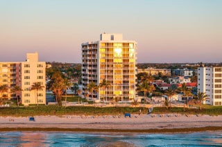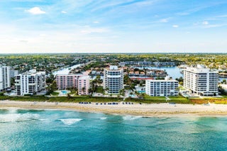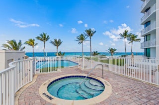 Experience coastal luxury at its finest in this beautifully updated 2-bed, 2-bath first floor walk-out condo at dog friendly Trafalgar of Highland Beach. Enjoy stunning ocean views from every room of this unit, featuring an oversized patio, with balcony access from both bedrooms and the living area. Split floorplan. The well appointed kitchen has been thoughtfully designed with the chef in mind. Premium quartzite counters, Bosch induction cooktop and dishwasher, Miele steam/convection oven, Fisher & Paykel convection oven and refrigerator, plus a wine fridge. Additional highlights include impact bay windows (2024), in-unit washer/dryer, and one assigned parking space with electrical plug. Offered fully furnished/turnkey. This perfect seaside retreat is ready for its next lucky owner.Trafalgar is a boutique oceanfront 24-hour guarded building with a gym, sauna, social room, fantastic oceanfront pool deck and elevated hot tub with ocean views. Enjoy peace of mind as the large concrete restoration project was recently completed. Brand new resident corridors and stunning new clubroom by Brown Design Group are nearing completion. Trafalgar is located just 3 buildings South of the Delray Sands Resort and Latitudes Restaurant, which is ideal when hosting out-of-town family, guests and visitors. Highland Beach is a prestigious coastal enclave nestled on the barrier island between Boca Raton and Delray Beach, known for its pristine beaches, quiet atmosphere, and upscale oceanfront properties. This exclusive, residential town offers a serene lifestyle with easy access to top dining, shopping, and entertainment in both neighboring cities. With roughly 3 miles of shoreline, Highland Beach combines luxury living with a true sense of privacy and community.