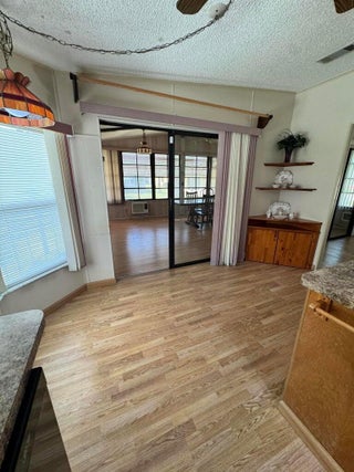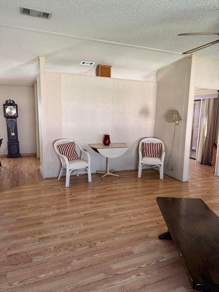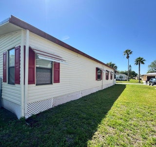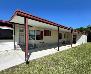 2 Bedroom 2 bath home on a quiet street in the desirable 55+Spanish Lakes Fairways community. The home has a large front room, 14x22, that opens up to the kitchen and living area. Home has NO carpet. Laminate flooring throughout. The primary bedroom is the full width of the home. Large carport big enough for three cars. Private backyard. The home has two sheds for added storage. Roof is metal, 2023. A/C 2016. Water Heater 2021. Home is being sold partially furnished. Lawn care and trash removal included in lot rent. 2 pools, tennis, pickleball, bocce, shuffleboard, 18-hole golf course: clubhouse and much more.