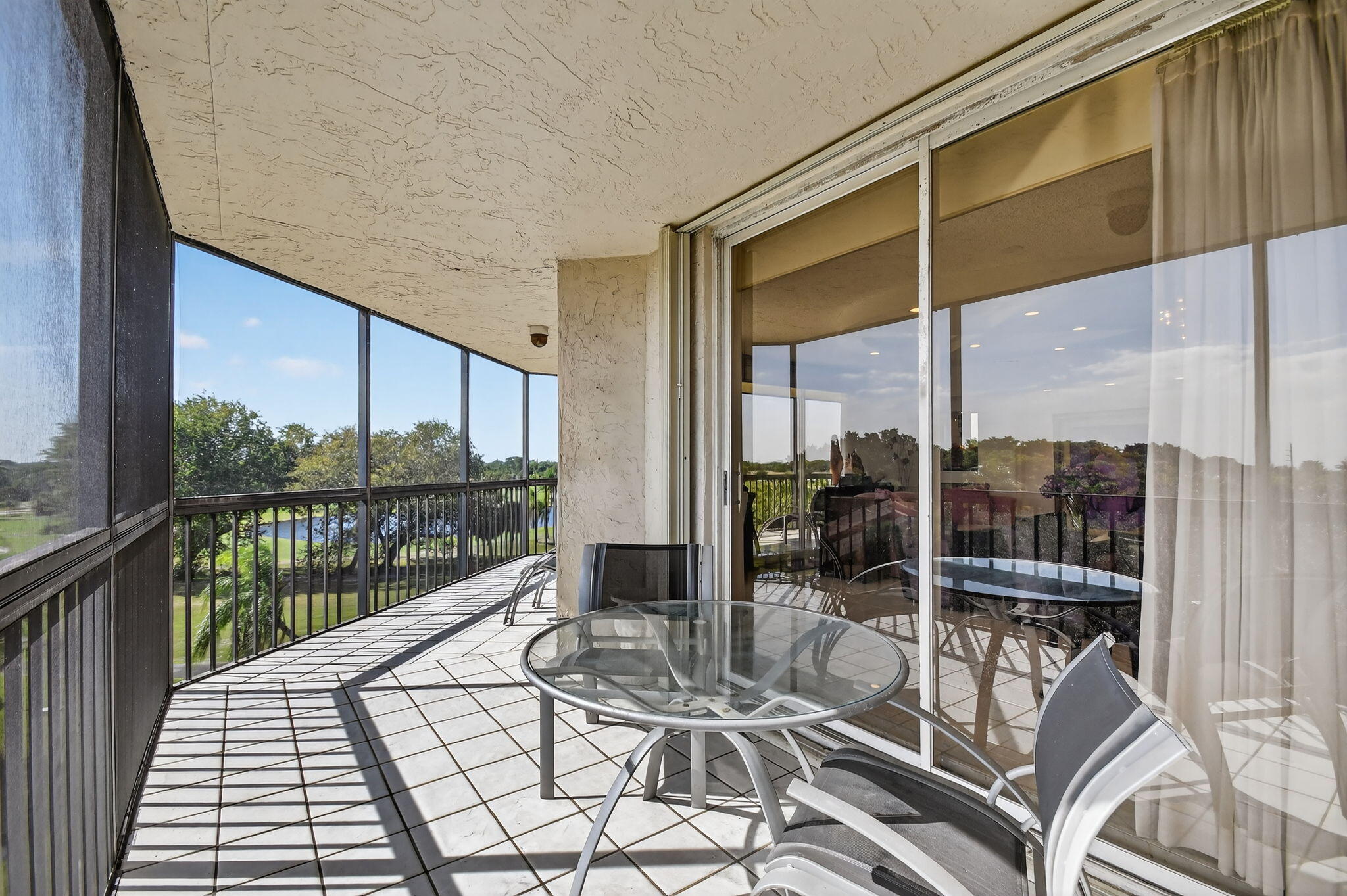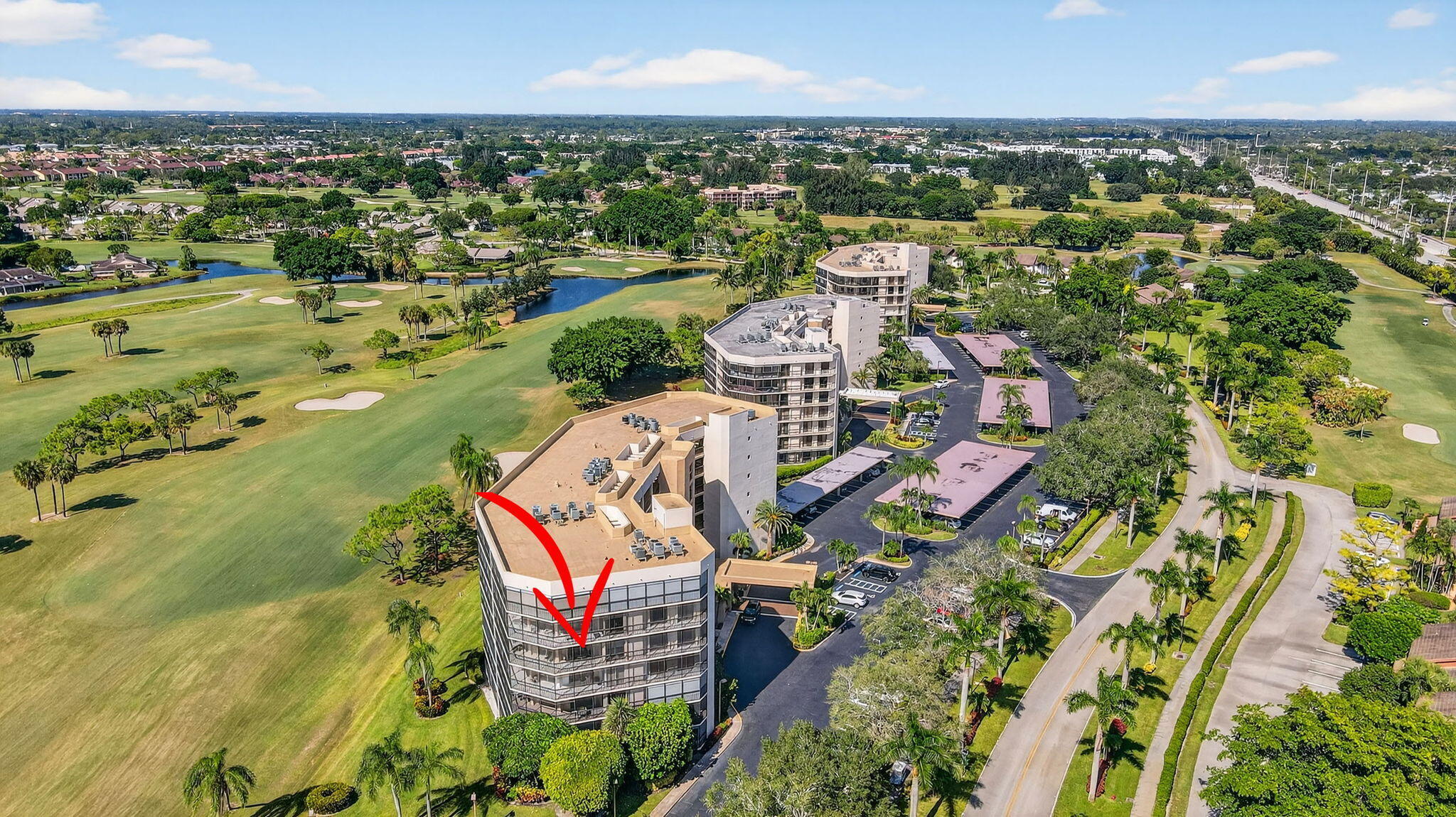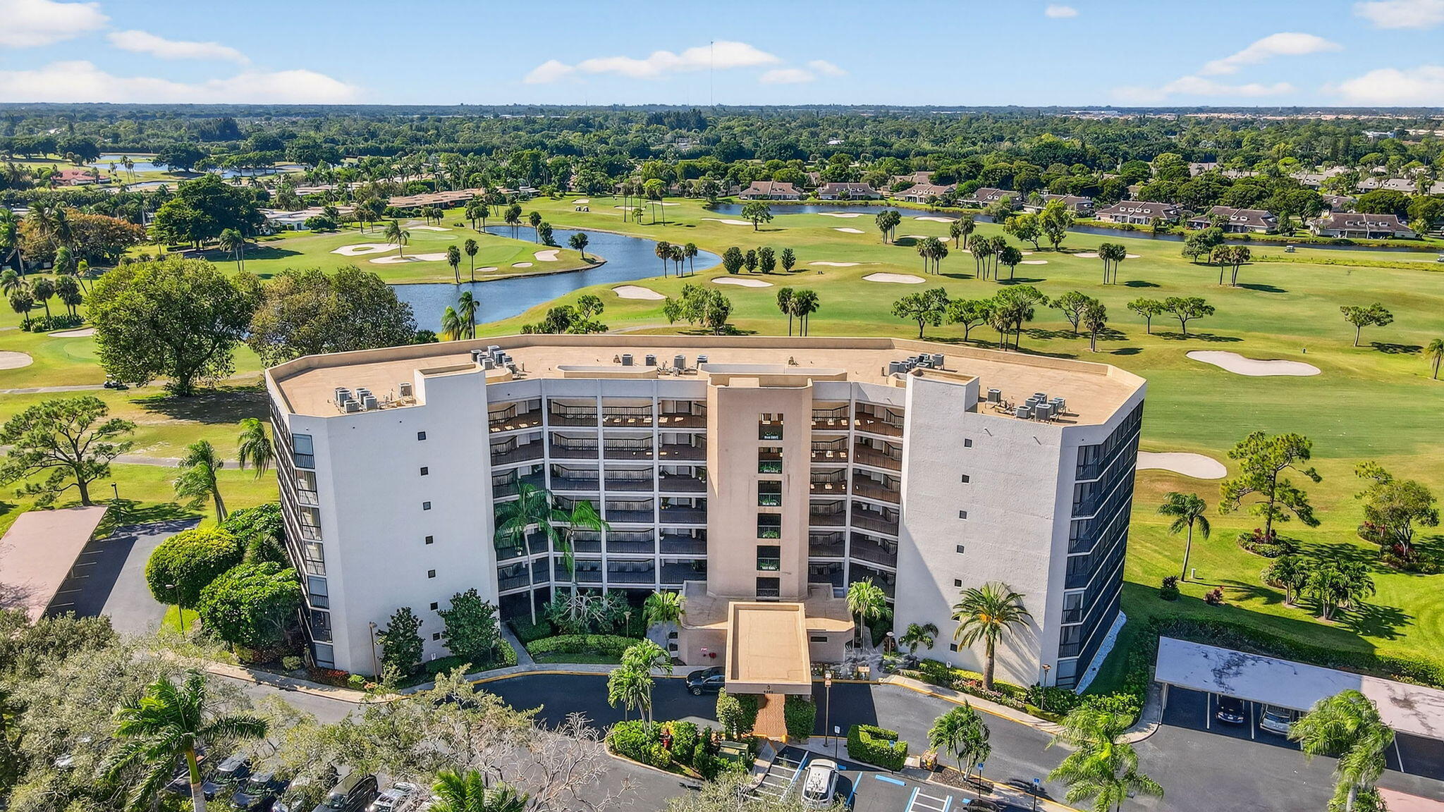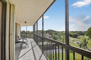 Spectacular golf, lake & tropical garden views from your wrap around screened enclosed balcony. This corner 3/2 condo is the largest of all Valencia's Models. Multiple sliding doors draw in natural sun light creating a warm ambiance. In the evening enjoy beautiful sunsets on your screened porch. Enjoy sit down kitchen, large washer/dryer, extra storage, walk in closet, Roman Tub, bar, pantries, accordion storm shutters & carport. Experience peace & security of manned guard gates & 24-hour security patrols. Your tropical pool is just out your front door. In this amazing location you are minutes from Florida Turnpike, I95, airports, entertainment, restaurants, shopping, medical centers, places of worship & many beautiful beaches. Golf memberships are available but are not mandatory