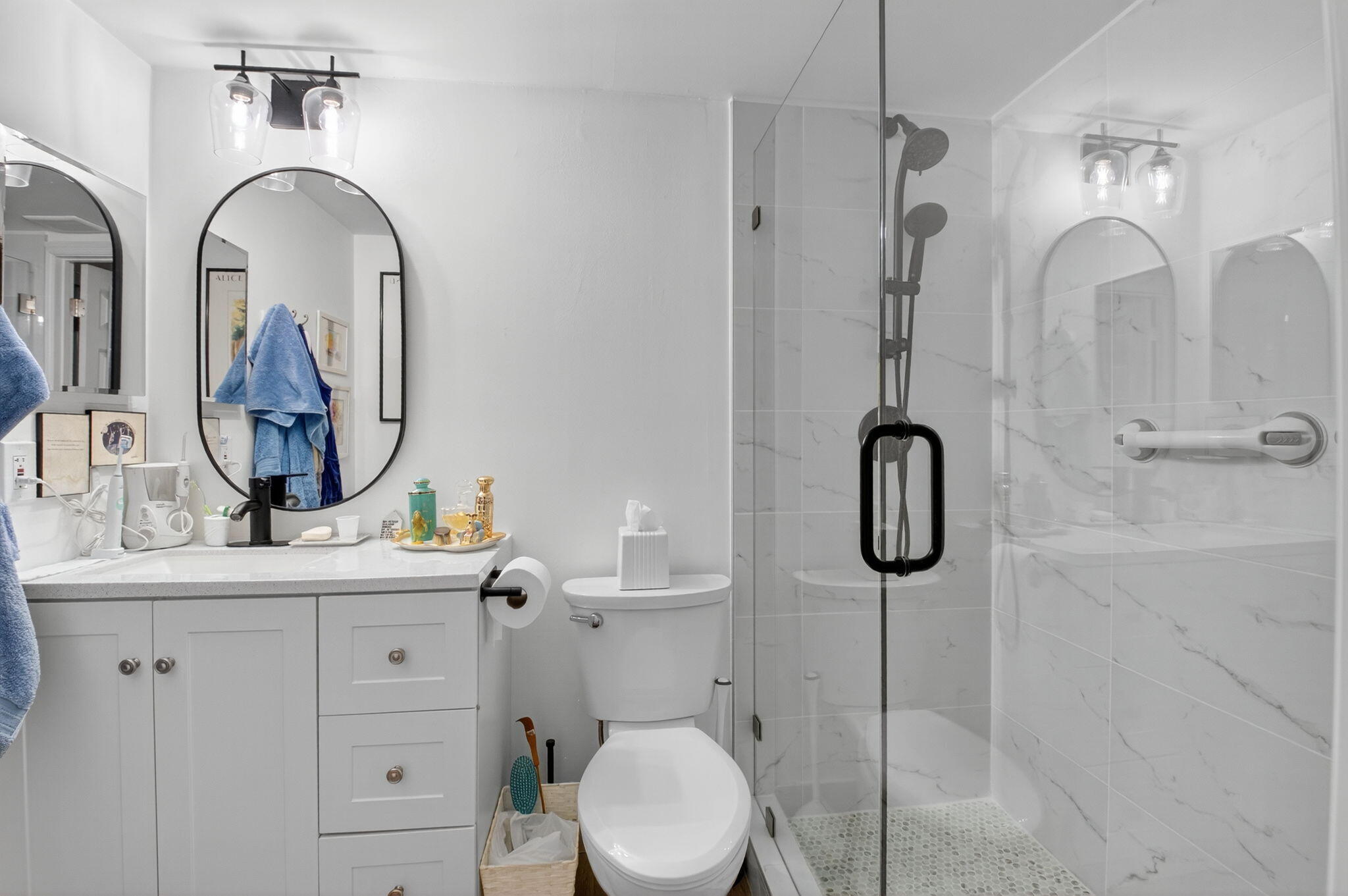 Must see this TOTALLY RENOVATED 1/1.5 first-floor condo close to parking with HURRICANE IMPACT WIDOWS AND FRONT DOOR! The beautifully redesigned kitchen opens to the living room and includes STAINLESS STEEL APPLIANCES, UPGRADED 42'' CABINETS WITH PULL-OUT SHELVES, QUARTZ COUNTER/TILED BACKSPLASH. Upgraded bathrooms include new cabinets/counters and NEW SHOWER ENCLOSURE in MBR. Interior features include VINYL FLOORS, NEW DOORS AND BASEBOARD, SLIDING DOORS IN MBR, PLANTATION SHUTTERS, NEW WASHER/DRIVER! Enclosed private patio. This active 55+ community includes a newly renovated clubhouse with impressive shows, exercise facilities, pools, tennis, 2 golf courses,2 on-site restaurants and more! Close to Atlantic Ave. stores, dining, beaches!