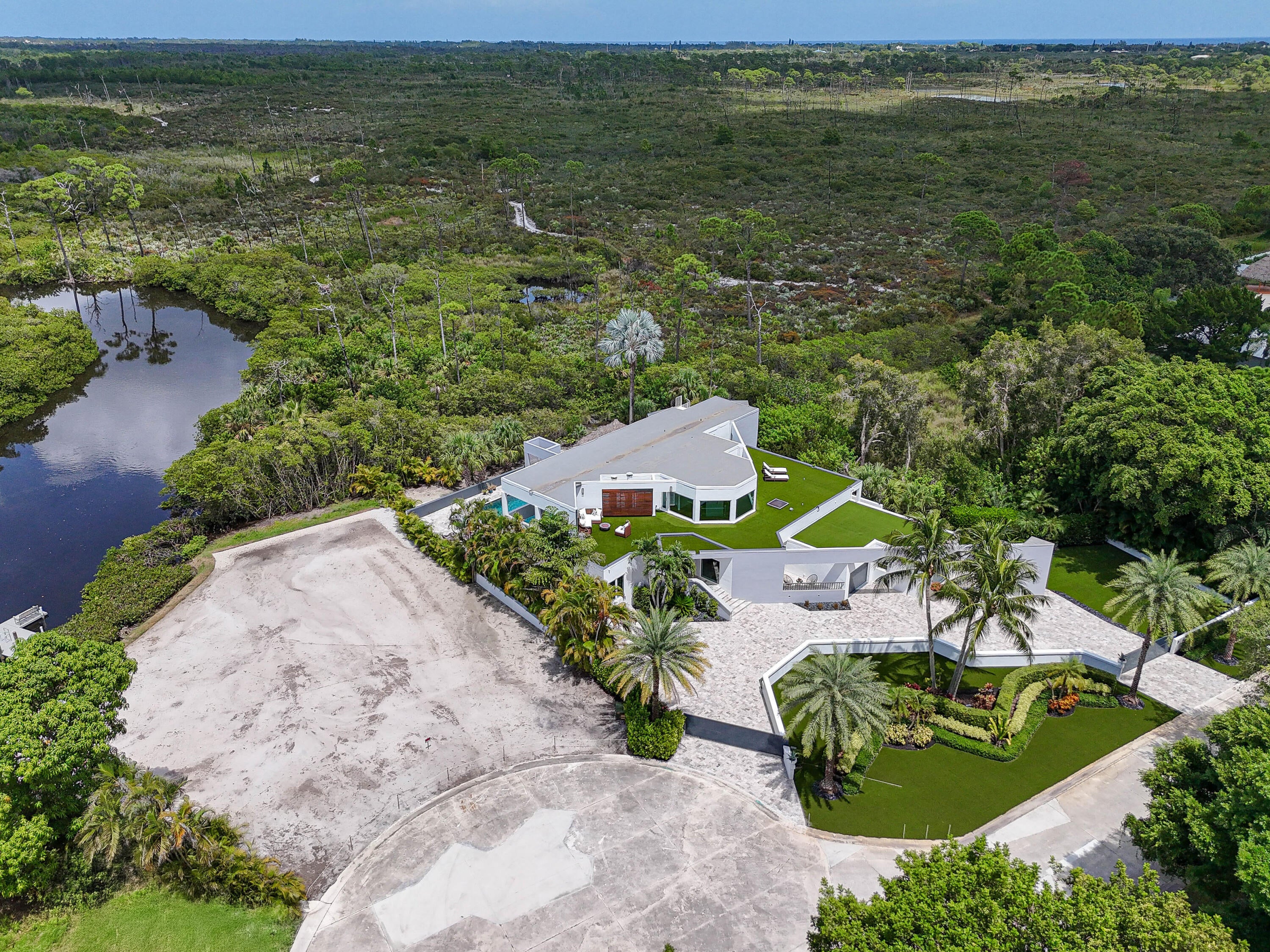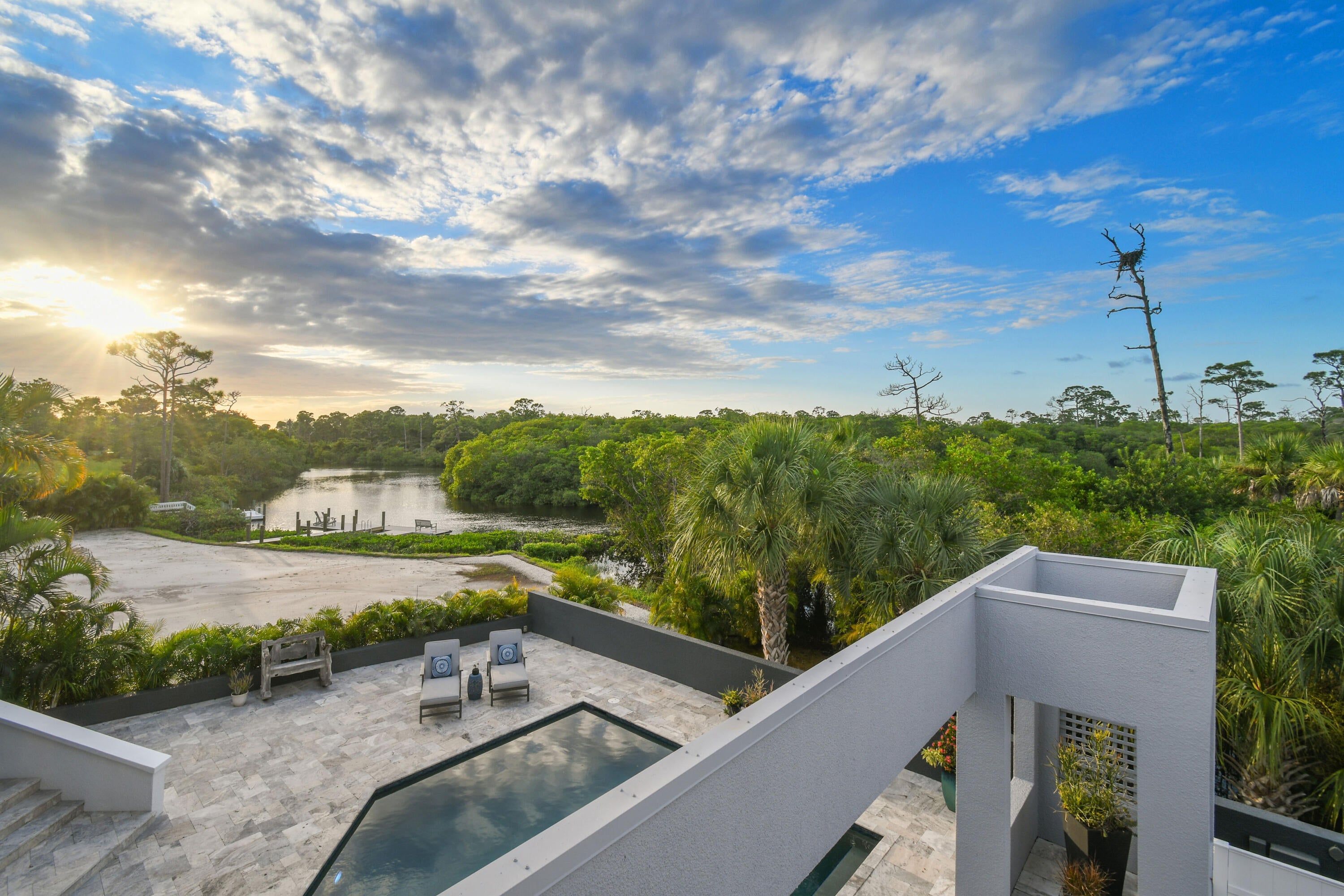 Double Lot .76 acres on the River with 140 ft of water frontage. Two Properties being sold together. Lot 8 is a completed property and fully developed. Lot 9 has been cleared, filled, and graded, setting the stage for your future vision. Ready to build on, or it can be combined with current home (lot 8) to make one large property on the River. New Large Dock, Pilings and a New Floating Dock are already in place. A Special Property with a 'lot' of potential. Stunning Renovated CBS Modern Home with Detached Guest House, Large Captivating Pool, Cedar Built-In Sauna, Turf Rooftop Decks and Lawn, Expansive Silver Travertine Driveway & Pool Deck, Hardscaping with Private Gated Entry. Epic Views of Loxahatchee River & Jonathon Dickinson State Park with sunset views. Minutes to the beach.Ocean access from the River. 5 Bedrooms, 4.5 Bathrooms offering nearly 5000 sq ft of Airy Living Space with Abundant Natural Light. Large Private Property with 18 sq. miles of Park Land for Hiking/Biking Trails from your back door access. Awe-Inspiring Second Level Master Bedroom Suite with office/exercise room and outside shaded deck offering breathtaking 180 degree views of the River and Park. Access to the outside from every room in the house via patio, balcony, deck, and rooftop. New recent upgrades include: New Roof, Entrance & Exit aluminum powder coated modern Driveway Gates, Silver Travertine Driveway, Porcelain Floors in kitchen, family room, dining room, bathroom, laundry room, and center Glass Staircase area, new Tiki Hut, exterior & interior Painting, extensive Landscaping, Hardscape work including Black Polished Japanese Stones surrounding property, and exterior stucco/wood work. Gourmet kitchen, Two dramatic and elegant working marble fireplaces, custom glass staircase railing, Impact glass windows and doors, Three car garage w/ finished floor, Volume Ceilings, Large Heated Salt Water dark bottom Pool with Glass Tile and pool shelf(baby friendly), Silver travertine decking throughout the backyard, large covered front porch, stairs, paths, balconies and lanai area. Large driveway with ample parking for cars, boats, or RV. Security cameras & Alarm system. No HOA fees and low Martin County taxes. Just minutes to shopping, fine & casual dining, entertainment, and the beach. PBI is 30 minutes away.