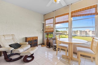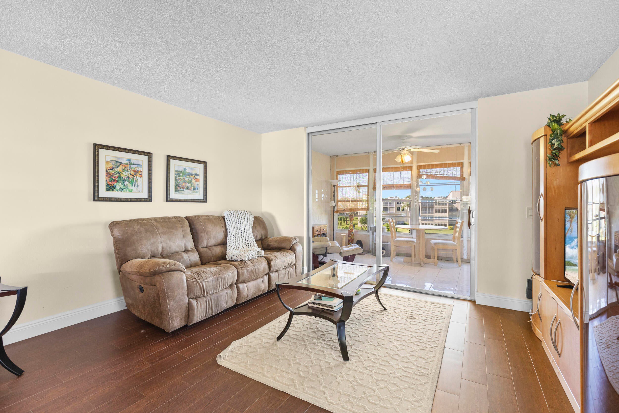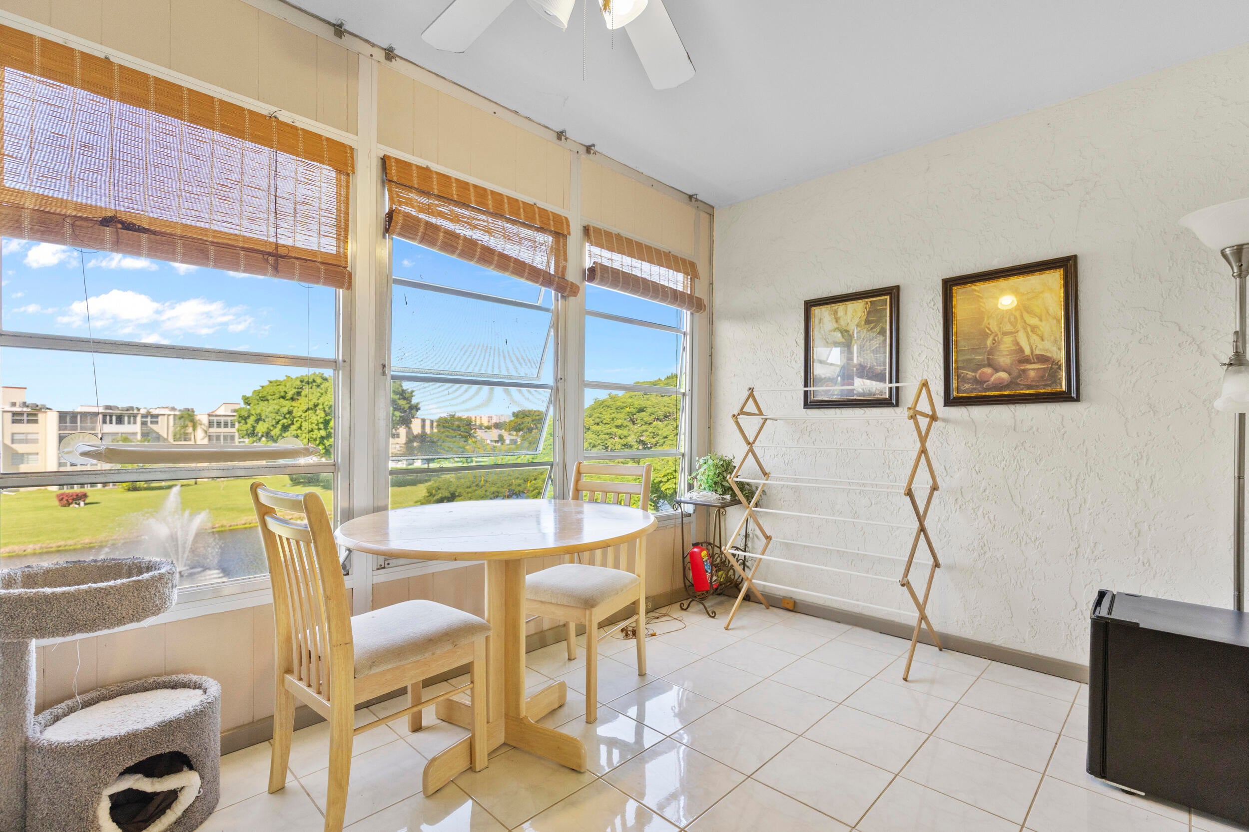 FULLY FURNISHED move-in ready!! Beautiful LAKE VIEW from 4th Floor! Open living concept. Updated kitchen with granite, wood shaker cabinets, stainless-steel appliances and large pantry. Florida dining area, Primary suite has large walk-in closet, tiled shower. Second bath has tub/shower combo. Glassed in porch makes room for den, office or extra bedroom! Washer & Dryer conveniently located inside unit. Storage closet too. Water heater 2017. Fabulous amenities including clubhouse, library, auditorium, heated pools, fitness center, walking trails, tennis/pickleball courts, bocce, hot tub and courtesy bus serviceClose to turnpike, shopping & the beaches. This community is 55 or better.